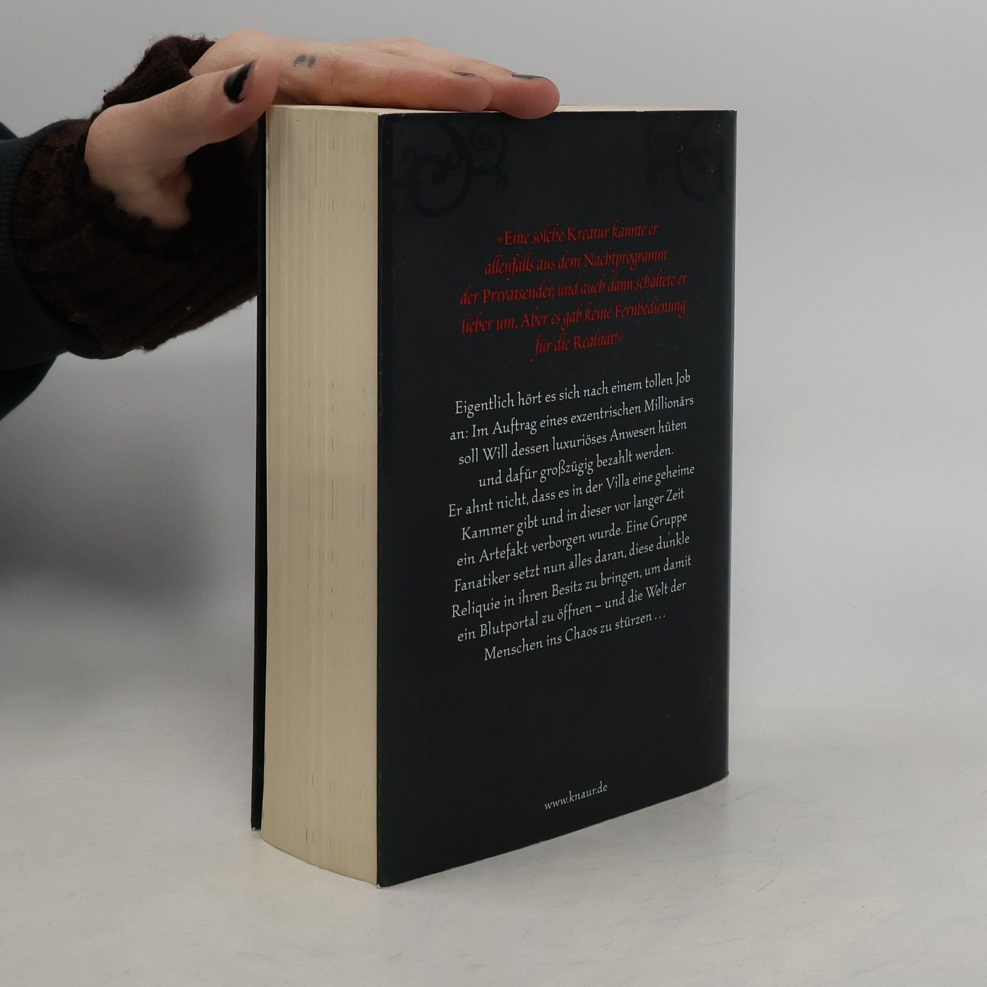 »Eine solche Kreatur kannte sie nur aus den Horrorfilmen der Privatsender, und auch dann schaltete sie lieber um. Doch für die Realität gab es keine Fernbedienung.« Saskia arbeitet als Köchin, ist eine leidenschaftliche Fechterin und führt ein ganz normales Leben. Das ändert sich, als sie bei einem Turnier gegen den geheimnisvollen Levantin antritt. Mit seinem Degen fügt er ihr einige tiefe Schnitte zu, die sich schon nach kurzer Zeit von selbst schließen. Saskia ahnt nicht, dass ihr Gegner ein Dämon ist, der seit Jahrhunderten nach ihr sucht – denn tief in ihr schlummert eine Gabe, die nun von -Levantin geweckt wurde. Er will, dass Saskia für ihn die Blutportale öffnet, durch die er endlich in seine Heimat zurückkehren kann. Doch niemand hat Saskia auf ihr dunkles Talent vorbereitet. Und so stößt sie unbeabsichtigt Türen auf, die nie geöffnet werden sollten …