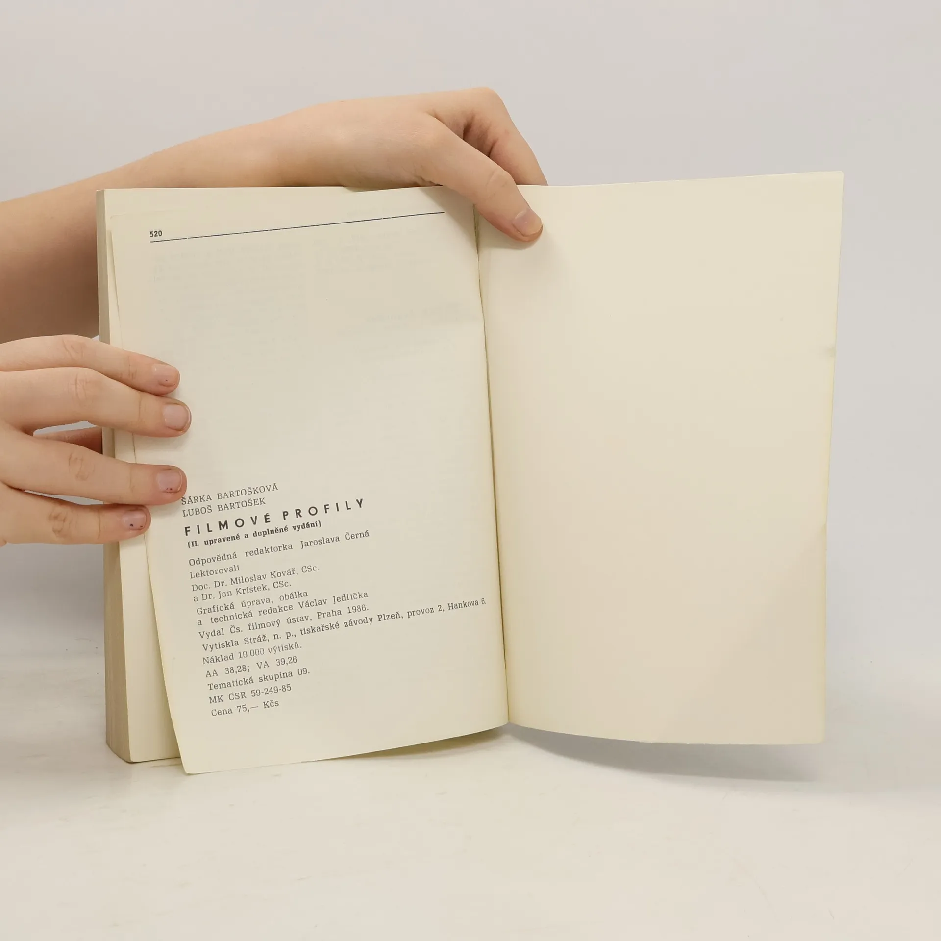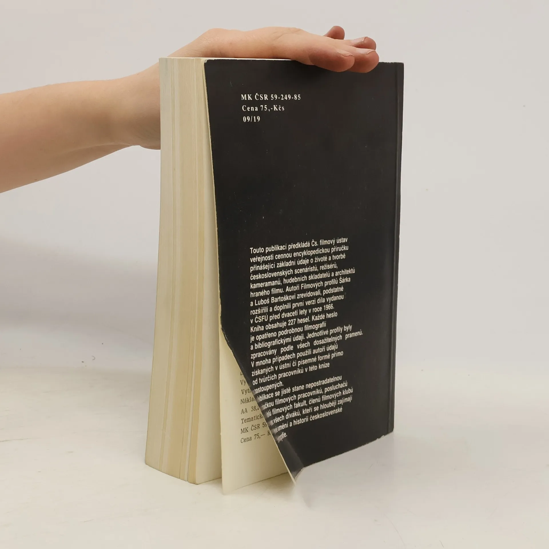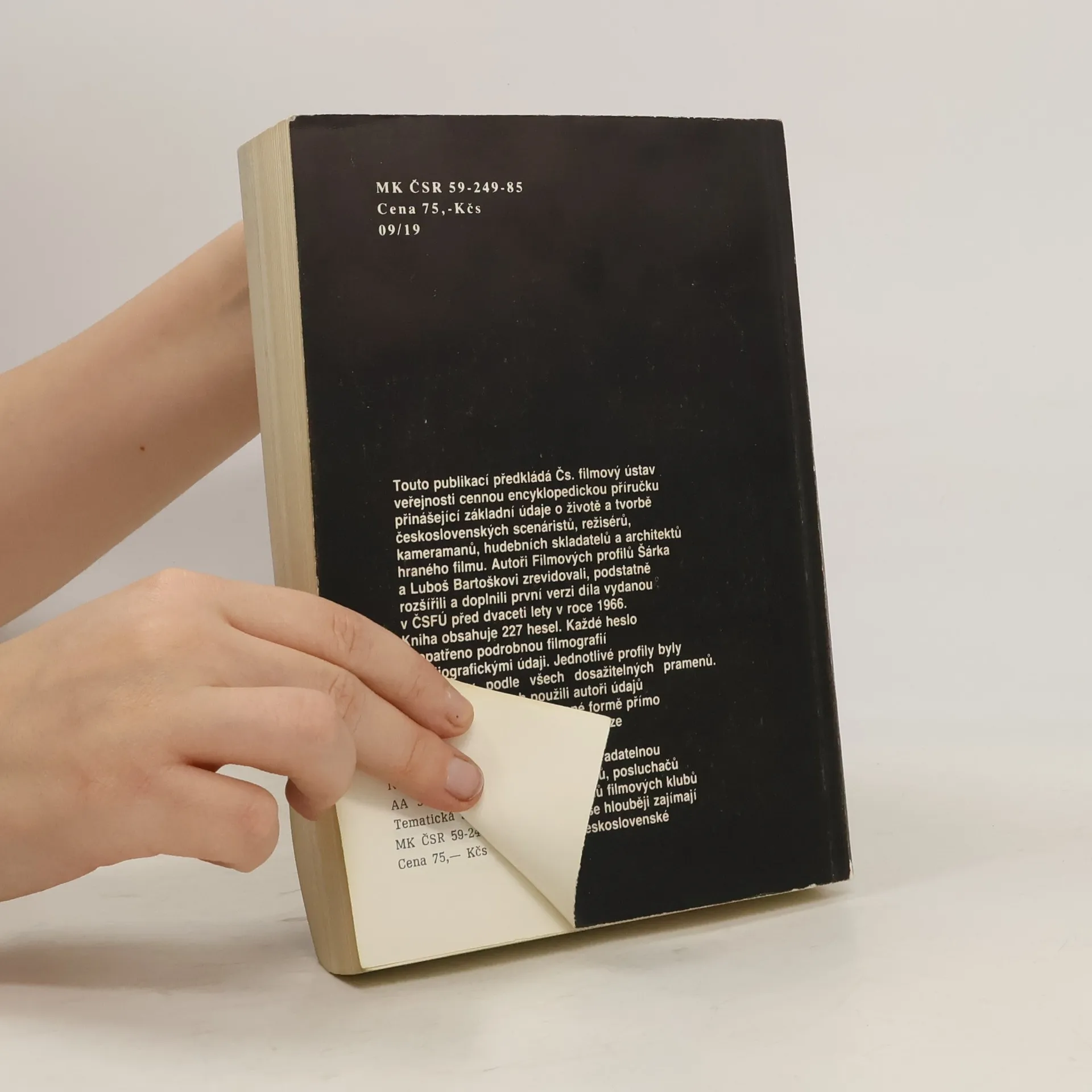 Touto publikací předkládá Čs. filmový ústav veřejnosti cennou encyklopedickou příručku přinášející základní údaje o životě a tvorbě československých scenáristů, režisérů, kameramanů, hudebních skladatelů a architektů hraného filmu. Autoři Filmových profilů Šárka a Luboš Bartoškovi zrevidovali, podstatné rozšířili a doplnili první verzi díla vydanou v ČSFÚ před dvaceti lety v roce 1966. Kniha obsahuje 227 hesel. Každé heslo je opatřeno podrobnou filmografií a bibliografickými údaji. Jednotlivé profily byly zpracovány podle všech dosažitelných pramenů. V mnoha případech použili autoři údajů získaných v ústní či písemné formě přímo od tvůrčích pracovníků v této knize zastoupených. Publikace se jistě stane nepostradatelnou příručkou filmových pracovníků, posluchačů i učitelů filmových fakult, členů filmových klubů a vůbec všech diváků, kteří se hlouběji zajímají o filmové umění a historii československé kinematografie.
