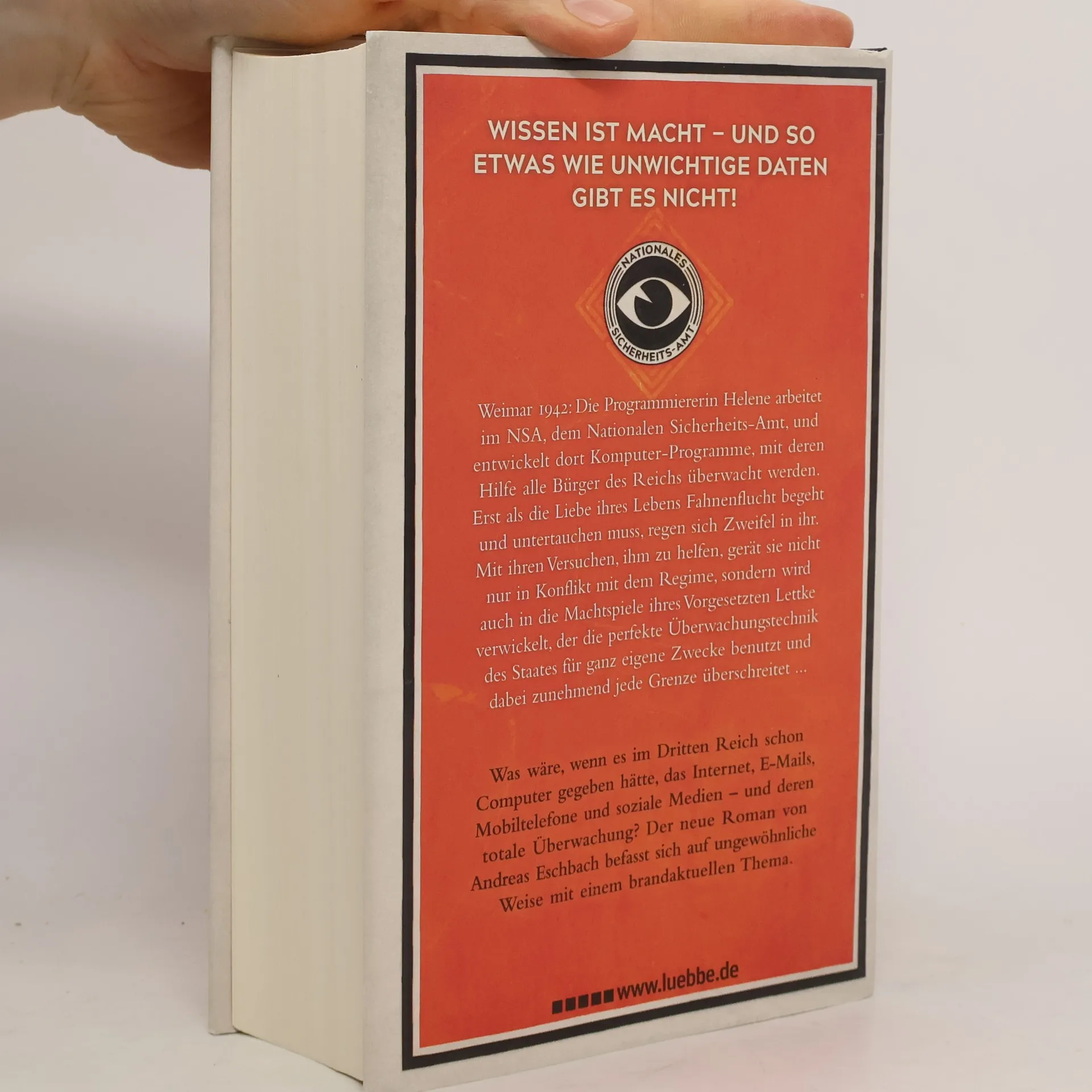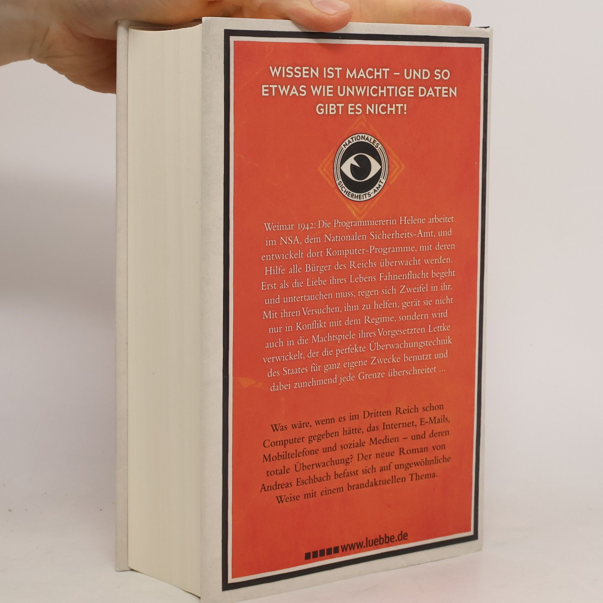 Weimar 1942: Die Programmiererin Helene arbeitet im Nationalen Sicherheits-Amt und entwickelt dort Programme, mit deren Hilfe alle Bürger des Reichs überwacht werden. Erst als die Liebe ihres Lebens Fahnenflucht begeht und untertauchen muss, regen sich Zweifel in ihr. Mit ihren Versuchen, ihm zu helfen, gerät sie nicht nur in Konflikt mit dem Regime, sondern wird auch in die Machtspiele ihres Vorgesetzten Lettke verwickelt, der die perfekte Überwachungstechnik des Staates für ganz eigene Zwecke benutzt und dabei zunehmend jede Grenze überschreitet ... Was wäre, wenn es im Dritten Reich schon Computer gegeben hätte, das Internet, E-Mails, Mobiltelefone und soziale Medien - und deren totale Überwachung?