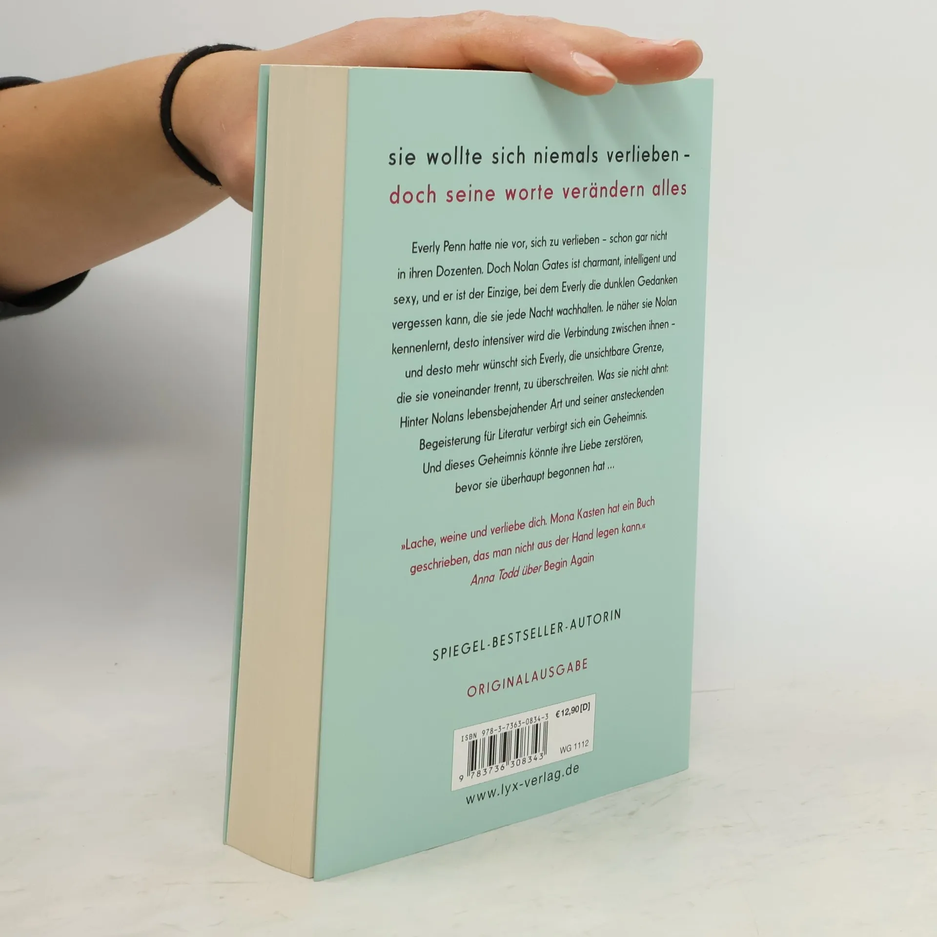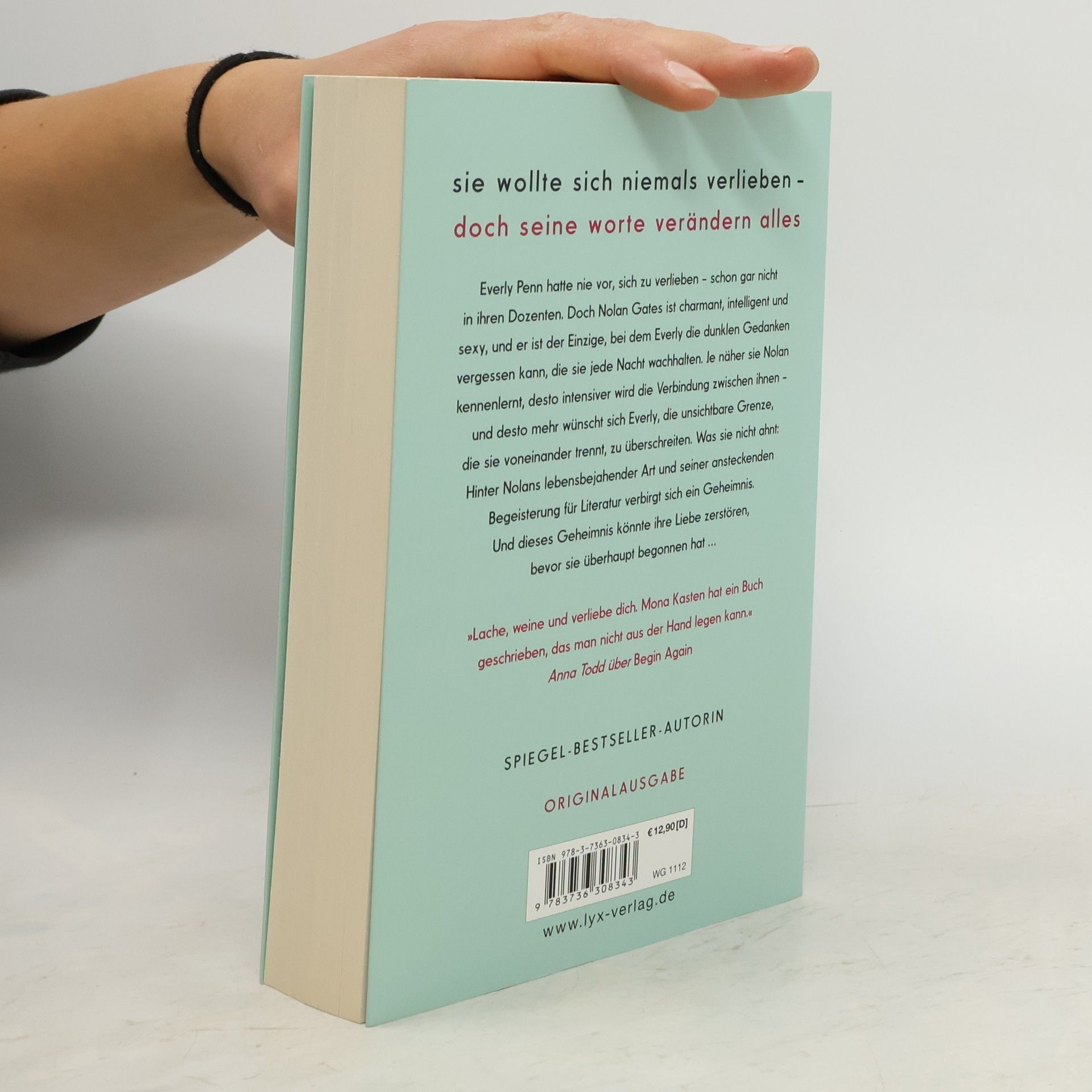 Sie wollte sich niemals verlieben - doch seine Worte verändern alles Everly Penn hatte nie vor, sich zu verlieben - schon gar nicht in ihren Dozenten. Doch Nolan Gates ist charmant, intelligent und sexy, und er ist der Einzige, bei dem Everly die dunklen Gedanken vergessen kann, die sie jede Nacht wachhalten. Je näher sie Nolan kennenlernt, desto intensiver wird die Verbindung zwischen ihnen - und desto mehr wünscht sich Everly, die unsichtbare Grenze, die sie voneinander trennt, zu überschreiten. Was sie nicht ahnt: Hinter Nolans lebensbejahender Art und seiner ansteckenden Begeisterung für Literatur verbirgt sich ein Geheimnis. Und dieses Geheimnis könnte ihre Liebe zerstören, bevor sie überhaupt begonnen hat ... „Lache, weine und verliebe dich. Mona Kasten hat ein Buch geschrieben, das man nicht aus der Hand legen kann!“ ANNA TODD über BEGIN AGAIN Band 4 der Erfolgsreihe von Platz-1-SPIEGEL-Bestseller-Autorin Mona Kasten