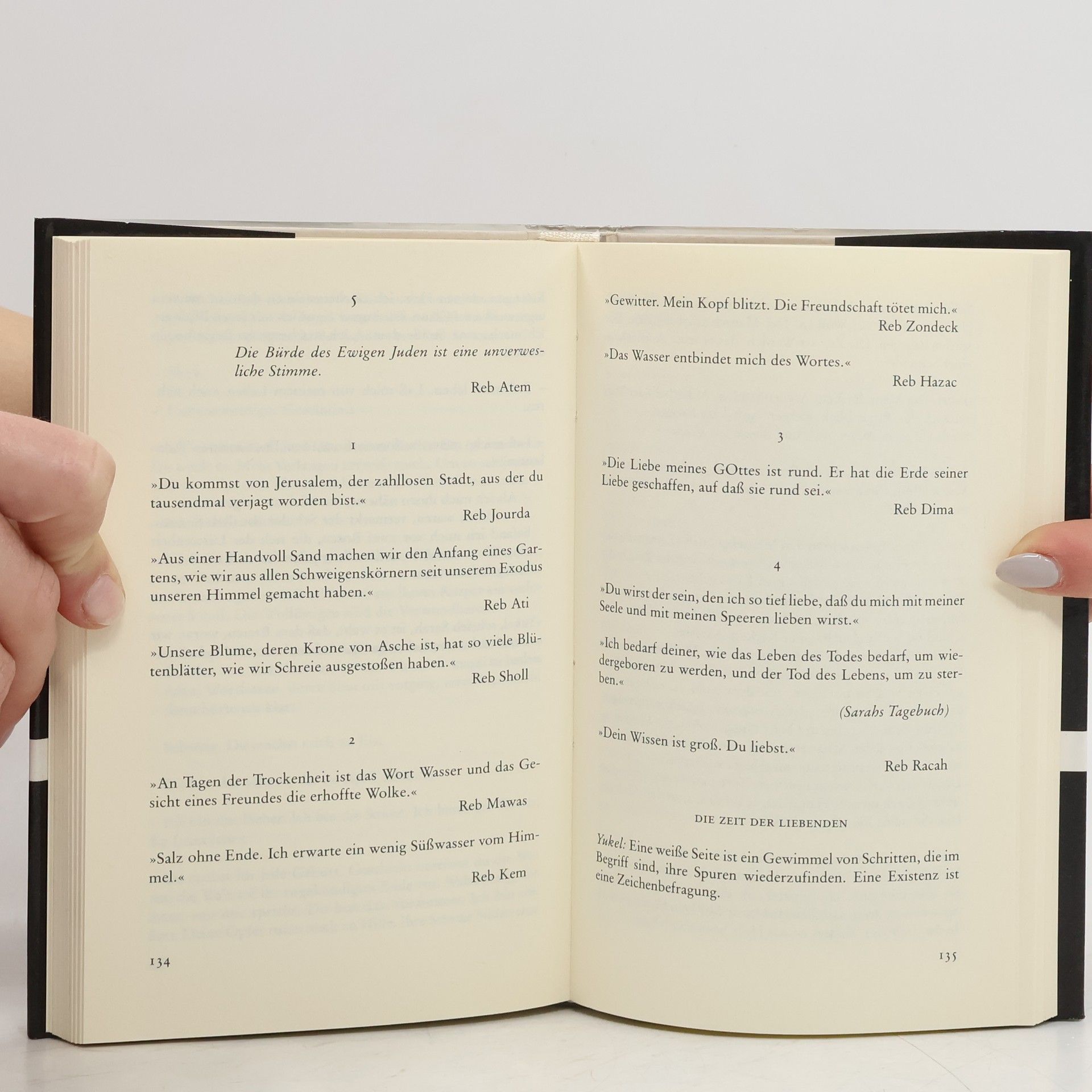Im Buch der Fragen steht die Liebesbeziehung zweier Juden im Zentrum, Yukel und Sarah, die während des Holocaust deportiert werden. Ihre Geschichte zeichnet sich in einem komplex-schillernden Mosaik aus Kommentaren, Erzählpassagen, Monologen, Dialogen und Aphorismen ab. Sie kennen nur eine eindringliche Grundbedingung: Die einzig richtige Antwort auf eine Frage ist eine weitere Frage. Als ein »Buch des Eingedenkens« hat Jabès dieses Werk bezeichnet. Es ergründet unentrinnbare Themen: das Sehen, das Wort, Gott, Freiheit, den eigenen Willen und den Tod. Jabès lässt imaginäre Rabbiner darauf eingehen und stellt die jüdische Tradition den grausamen Erfahrungen des 20. Jahrhunderts entgegen: »Aus einer einfachen und trauervollen Idylle steigt ein Liebeslied auf, das ein Lied der Hoffnung ist, trotz allem. Das Lied hat das Ziel, uns beiwohnen zu lassen: der Geburt des Wortes und, in einer überwirklichen Dimension, einer Erhöhung der Leidensschwelle, dargestellt von einer verfolgten Gemeinschaft, deren Klage ihre Märtyrer von Zeitalter zu Zeitalter neu erheben.« Jabès studierte in den Dreißigerjahren in Paris und stand zu dieser Zeit den Anhängern des Surrealismus nahe – trat der Gruppierung jedoch nie bei. Er bestand darauf, allein verantwortlich für sein Schreiben zu sein. Er empfand das Risiko als essenzielle Dimension des Schriftstellerdaseins. Die Motive Heimat und Sehnsucht durchziehen sein gesamtes Werk wie ein unsichtbarer roter Faden.
