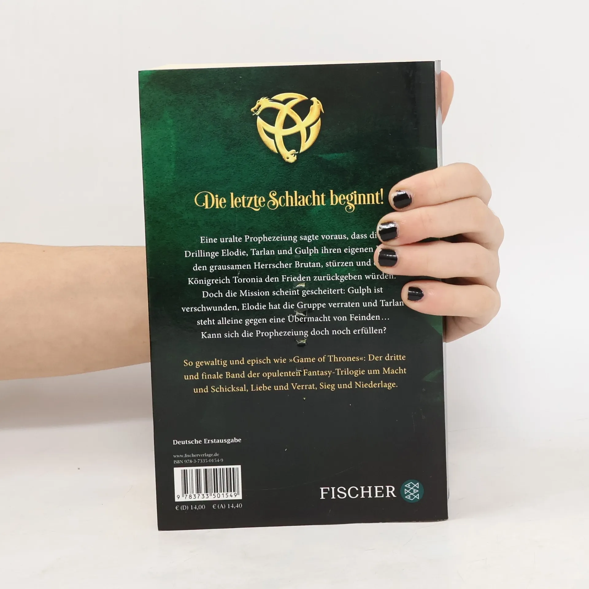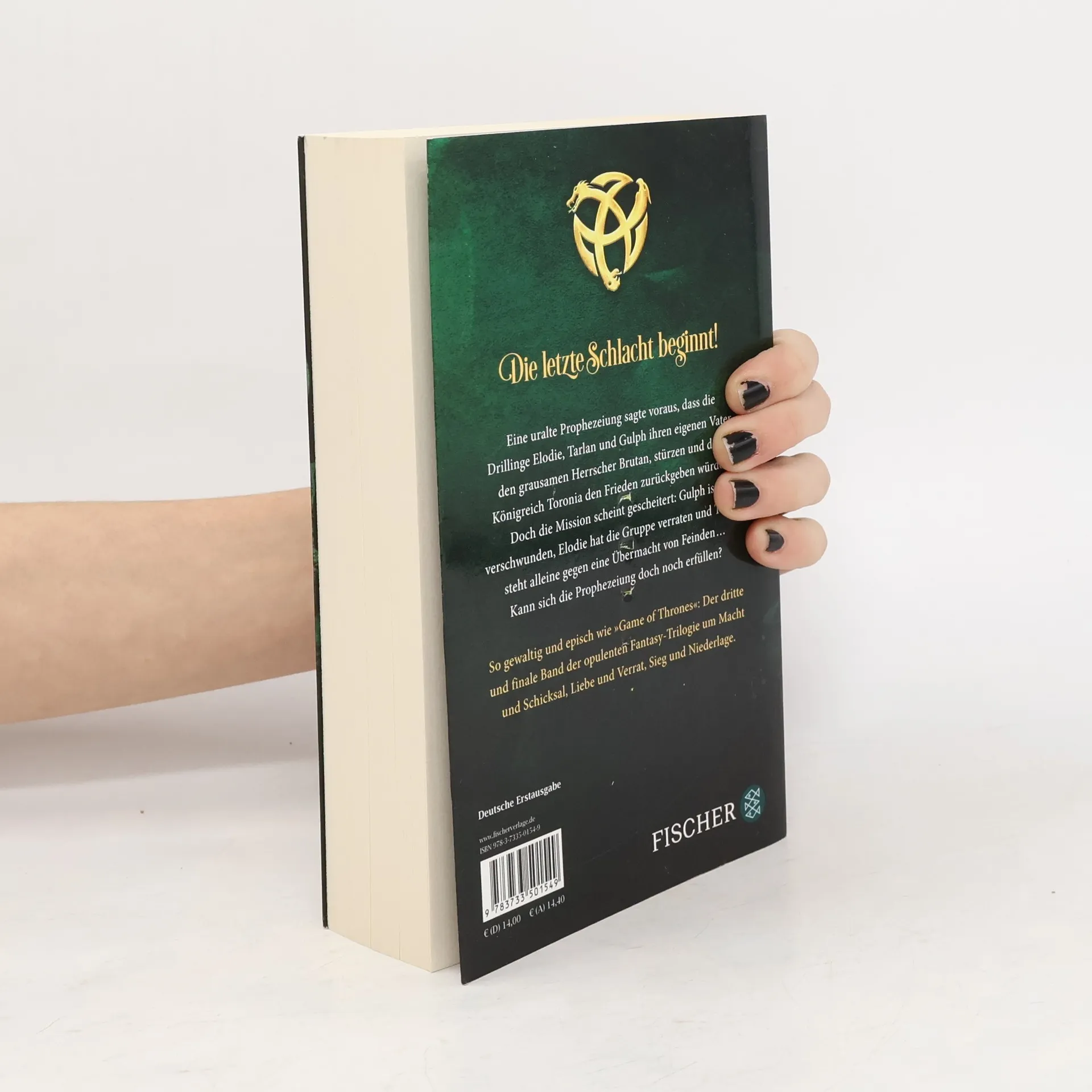 So gewaltig und episch wie »Game of Thrones«: Das Finale der opulenten Fantasy-Trilogie um Macht und Schicksal, Liebe und Verrat, Sieg und Niederlage. Sie wurden in einer schicksalhaften Nacht geboren und dazu auserkoren, ein ganzes Land zu retten: Die Drillinge Gulph, Tarlan und Elodie töteten ihren eigenen Vater, den grausamen König Brutan, um das Königreich Toronia zu befreien. Eine uralte Prophezeiung sagte voraus, dass die Drillinge Elodie, Tarlan und Gulph den grausamen Herrscher Brutan stürzen und dem Königreich Toronia den Frieden zurückgeben werden. Doch die Mission scheint gescheitert: Gulph ist verschwunden, Elodie hat die Gruppe verraten und Tarlan steht alleine gegen eine Übermacht von Feinden … Kann sich die Prophezeiung doch noch erfüllen? »Wie ›Game of Thrones‹ an einem milden Tag.« Publisher’s Weekly »Dieser aufregende, mystische und kreative Jugendroman zieht seine Leser sofort in den Bann. […] Spannend, kurzweilig, zauberhaft – ab nach Toronia!« Bücher, Spiele und Co Alle Bände der Crown-of-Three-Trilogie: Crown of Three – Auf goldenen Flügeln (Band 1) Crown of Three – Das Lied der Schlange (Band 2) Crown of Three – Die letzte Schlacht (Band 3)