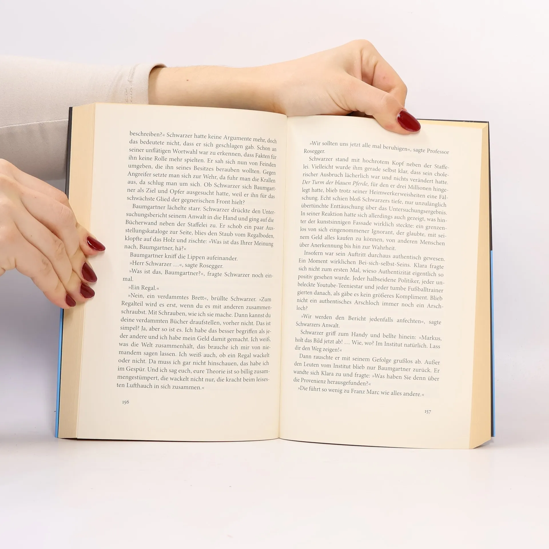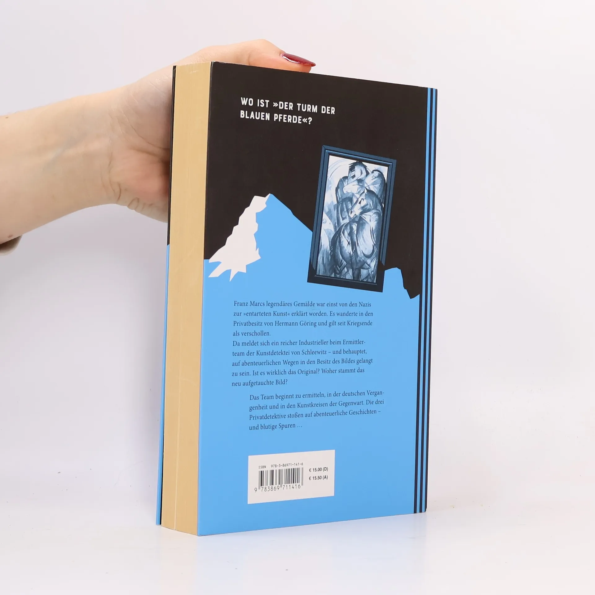 Ein packender Krimi um eines der legendärsten verschollenen Gemälde der Kunstgeschichte: Der Turm der blauen Pferde von Franz Marc. Zwei Jungs entdecken in den letzten Tagen des Zweiten Weltkriegs in einem verlassenen Tunnel einen Zug voller Kunstschätze. Besonders das Gemälde mit den geheimnisvollen blauen Pferden fasziniert sie, doch dann kommt es zur Katastrophe, und das Werk verschwindet für immer. In der Gegenwart erhält die Münchner Kunstdetektei von Schleewitz einen neuen Auftrag: Marcs legendäres Gemälde, das von den Nazis als „entartete Kunst“ erklärt und in Görings Privatbesitz gewandert ist, soll wieder aufgetaucht sein. Ein reicher Kunstsammler behauptet, das Bild auf verschlungenen Wegen von einem Unbekannten gekauft zu haben. Ist es wirklich das Original? Das Detektivteam, bestehend aus Rupert von Schleewitz, Klara Ivanovic und Max Müller, hat nicht nur unterschiedliche Privatleben, sondern auch individuelle Ermittlungsmethoden. Sie geraten schnell in ein Netz aus Fälschungen, mysteriösen Todesfällen und einem spektakulären Kunstdiebstahl. Plötzlich scheinen mehrere Exemplare des Turms der blauen Pferde zu existieren. Welches ist das echte Gemälde? Oder ist das Original vielleicht gar nicht dabei? Die Grenzen zwischen Authentizität und perfektem Imitat verschwimmen ...