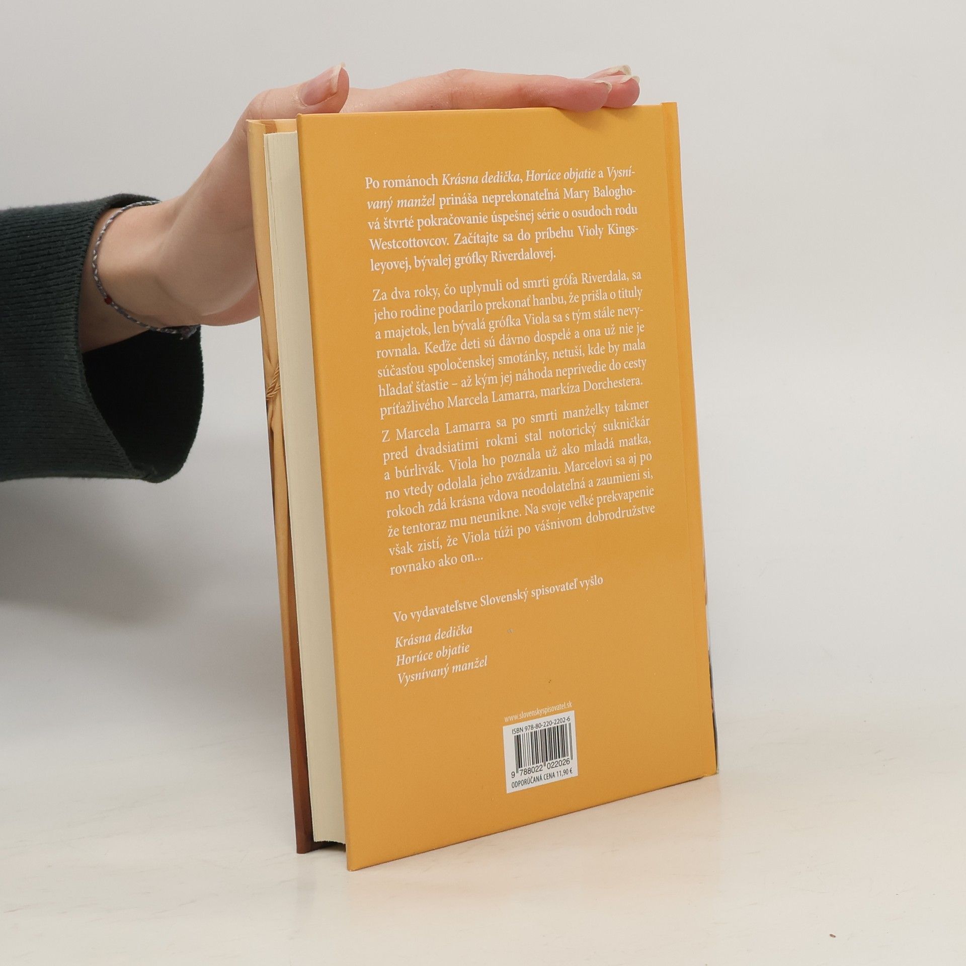 Po románoch Krásna dedička, Horúce objatie a Vysnívaný manžel prináša neprekonateľná Mary Baloghová štvrté pokračovanie úspešnej série o osudoch rodu Westcottovcov. Začítajte sa do príbehu Violy Kingsleyovej, bývalej grófky Riverdalovej. Za dva roky, čo uplynuli od smrti grófa Riverdala, sa jeho rodine podarilo prekonať hanbu, že prišla o tituly a majetok, len bývalá grófka Viola sa s tým stále nevyrovnala. Keďže deti sú dávno dospelé a ona už nie je súčasťou spoločenskej smotánky, netuší, kde by mala hľadať šťastie – až kým jej náhoda neprivedie do cesty príťažlivého Marcela Lamarra, markíza Dorchestera. Z Marcela Lamarra sa po smrti manželky takmer pred dvadsiatimi rokmi stal notorický sukničkár a búrlivák. Viola ho poznala už ako mladá matka, no vtedy odolala jeho zvádzaniu. Marcelovi sa aj po rokoch zdá krásna vdova neodolateľná a zaumieni si, že tentoraz mu neunikne. Na svoje veľké prekvapenie však zistí, že Viola túži po vášnivom dobrodružstve rovnako ako on...