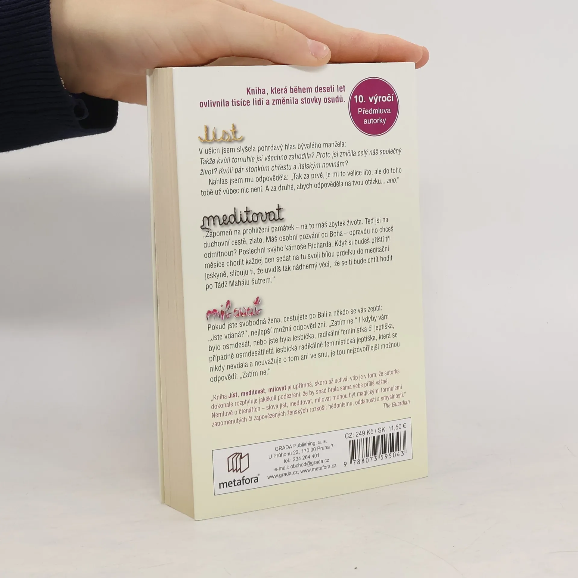 NOVĚ K 10. VÝROČÍ PRVNÍHO VYDÁNÍ. Pouť mladé dámy za pozemskými i duchovními rozkošemi napříč Itálií, Indií a Indonésií... Nové, doplněné vydání knižního (a filmového) bestselleru. Elizabeth má vše, co se od moderní Američanky očekává: manžela, dům a úspěšnou kariéru. Jenže místo aby se cítila šťastná, pohlcuje ji panika, zoufalství a zmatek. Odhodlá se tedy k radikálnímu kroku. Úplně sama se vydá na roční pouť kolem světa. V Itálii studuje umění rozkoše, flirtuje, nezřízeně hoduje a přibere deset nejšťastnějších kilogramů svého života. V Indii absolvuje čtyřměsíční duchovní cestu do vlastního nitra, na níž nechybí ani tak zdánlivé protiklady, jako je meditace, černý humor, mantry a vize. V Indonésii, kde se stane žačkou svérázného starého šamana, pak hledá svůj konečný cíl: rovnováhu a schopnost vybalancovat si život. JÍST... Kvůli pár stonkům chřestu a italským novinám jsi zničila náš společný život? MEDITOVAT... Uvidíš tak nádherný věci, že se ti bude chtít hodit po Tádž Mahálu šutrem. MILOVAT... Jste-li svobodná žena cestující po Bali, nejlepší odpověď na otázku „Jste vdaná?“, zní: „Zatím ne.“ Podle knihy vznikl rovněž úspěšný film s Julií Roberts v hlavní roli.