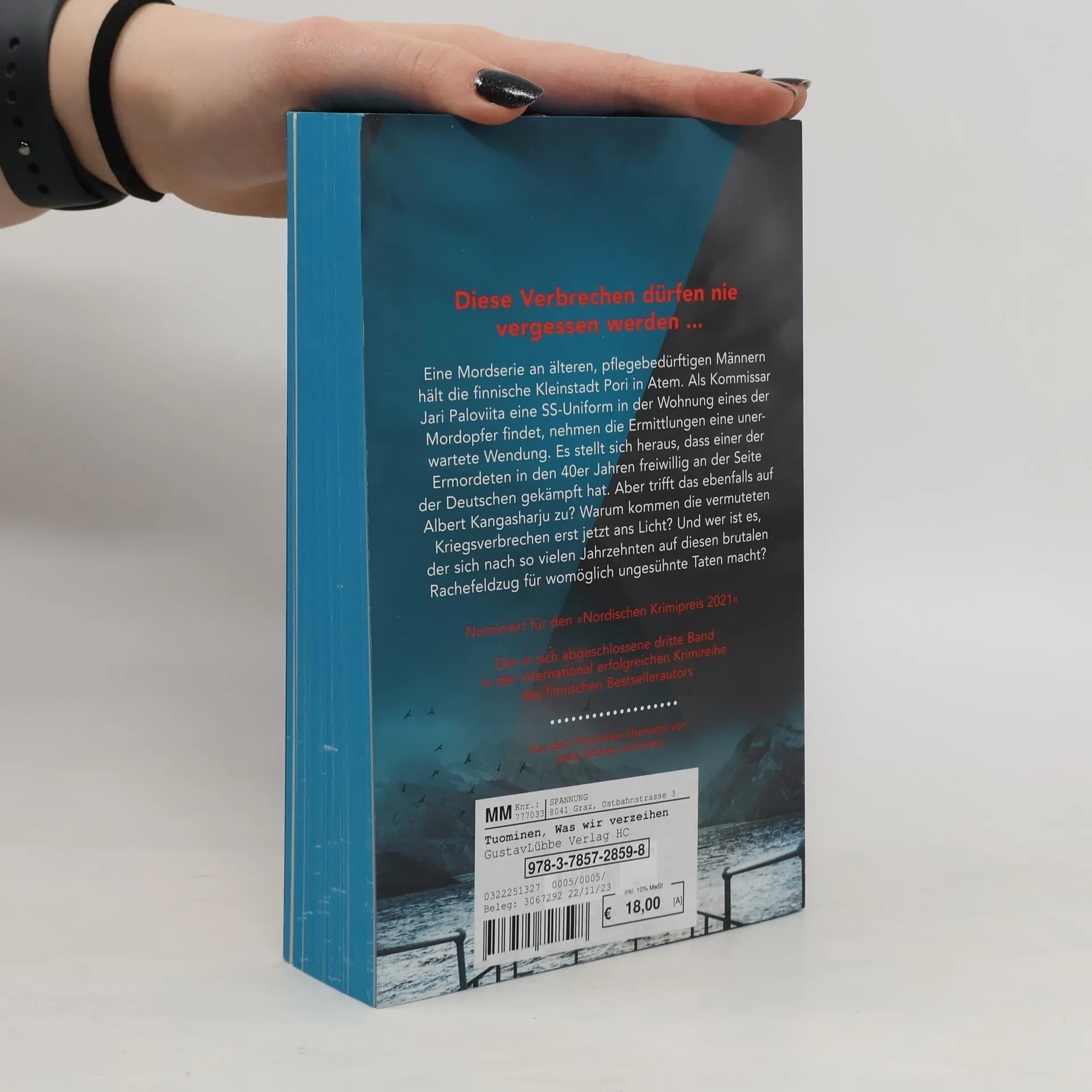 Eine Mordserie an älteren, pflegebedürftigen Männern hält die finnische Kleinstadt Pori in Atem. Als Kommissar Jari Paloviita eine SS-Uniform in der Wohnung eines der Mordopfer findet, nehmen die Ermittlungen eine unerwartete Wendung. Es stellt sich heraus, dass einer der Ermordeten in den 40er Jahren freiwillig an der Seite der Deutschen gekämpft hat. Aber trifft das ebenfalls auf Albert Kangasharju zu? Warum kommen die vermuteten Kriegsverbrechen erst jetzt ans Licht? Und wer ist es, der sich nach so vielen Jahrzehnten auf diesen brutalen Rachefeldzug für womöglich ungesühnte Taten macht? Nominiert für den „Nordischen Krimipreis 2021“