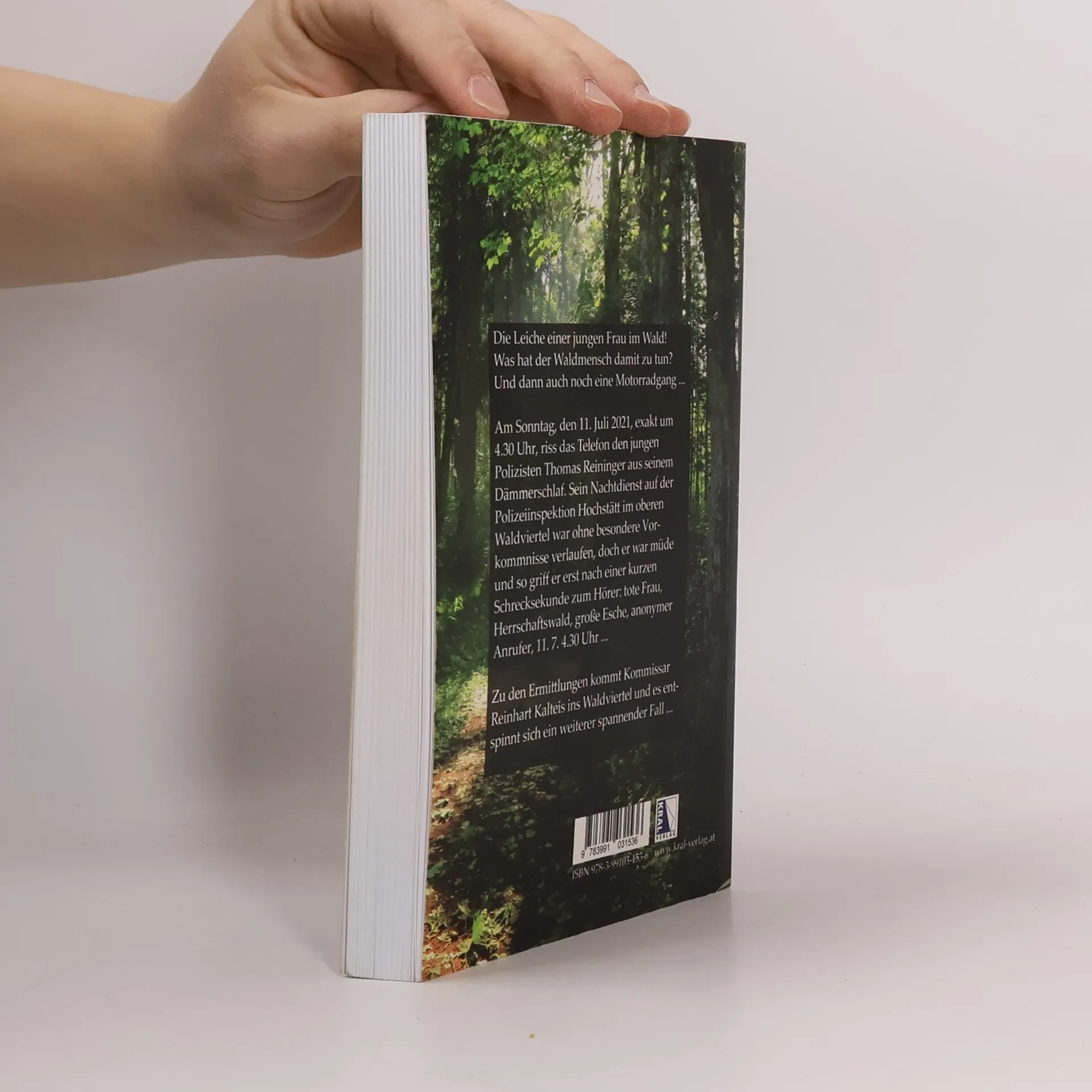 > Die Leiche einer jungen Frau im Wald > Was hat der Waldmensch damit zu tun? > Und dann auch noch eine Motorradgang ... > Ein Fall für den eiskalten Kommissar Kalteis Am Sonntag, den 11. Juli 2021, exakt um 4.30 Uhr, riss das Telefon den jungen Polizisten Thomas Reininger aus seinem Dämmerschlaf. Sein Nachtdienst auf der Polizeiinspektion Hochstätt im oberen Waldviertel war ohne besondere Vorkommnisse verlaufen, doch er war müde und so griff er erst nach einer kurzen Schrecksekunde zum Hörer und notiert: „... tote Frau, Herrschaftswald, große Esche, anonymer Anrufer, 11. 7., 4.30 Uhr.“ Zur den Ermittlungen kommt Kommissar Reinhart Kalteis ins Waldviertel und es entspinnt sich ein weiterer spannender Fall ...