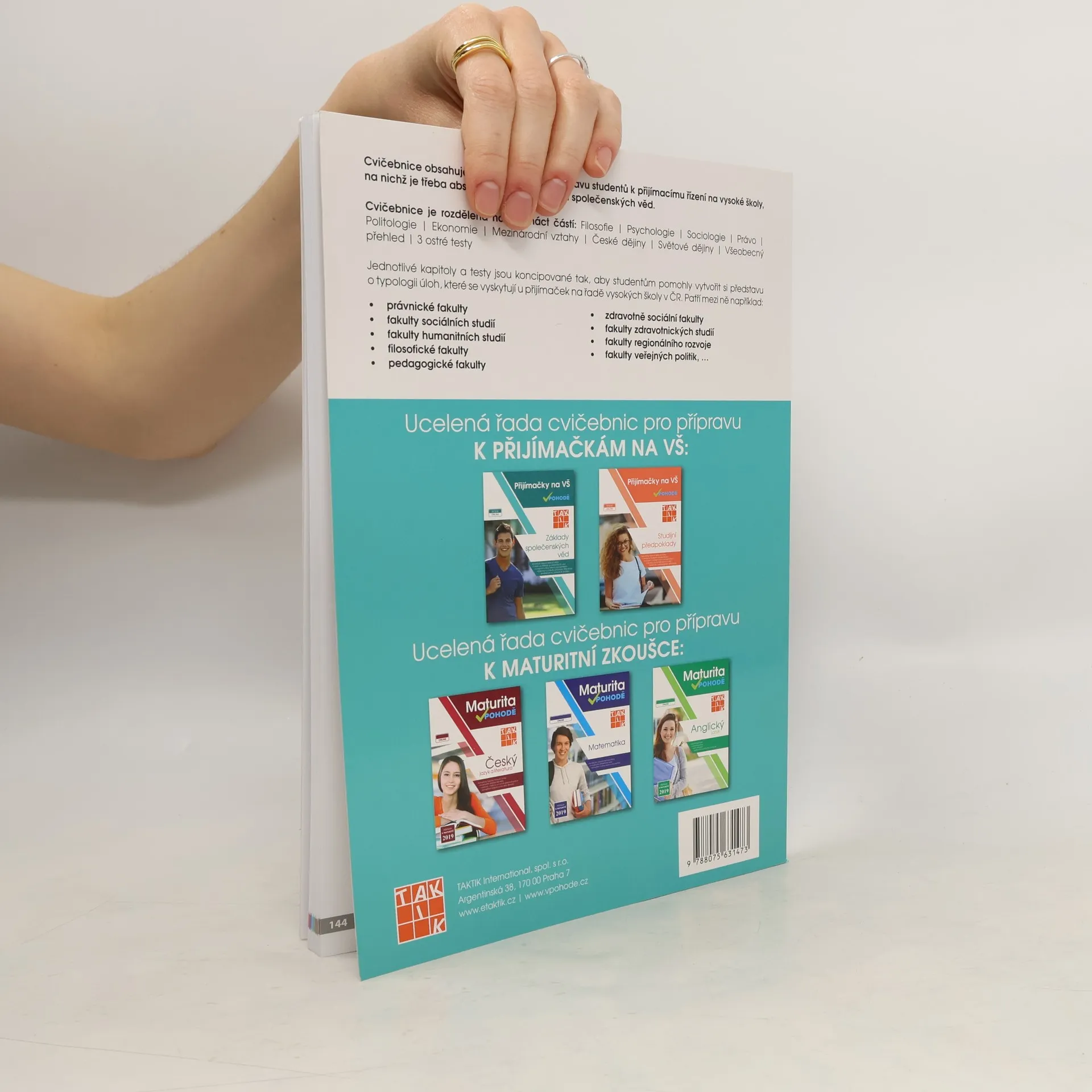 Cílem cvičebnic je poskytnout komplexní přípravu k přijímacímu řízení na vysoké školy, na nichž je třeba absolvovat test ze studijních předpokladů a základů společenských věd. Zpracováním různorodých typologií testových otázek a nejfrekventovanějších témat a oblastí z přijímacích řízení v ČR se podařilo žákům poskytnout kompletní podklady pro přípravu na testy ze studijních předpokladů a základů společenských věd na libovolnou vysokou školu v České republice. Cvičebnice obsahují vzorové úlohy pro přípravu studentů k přijímacímu řízení na vysoké školy, na nichž je třeba absolvovat test ze studijních předpokladů a základů společenských věd.