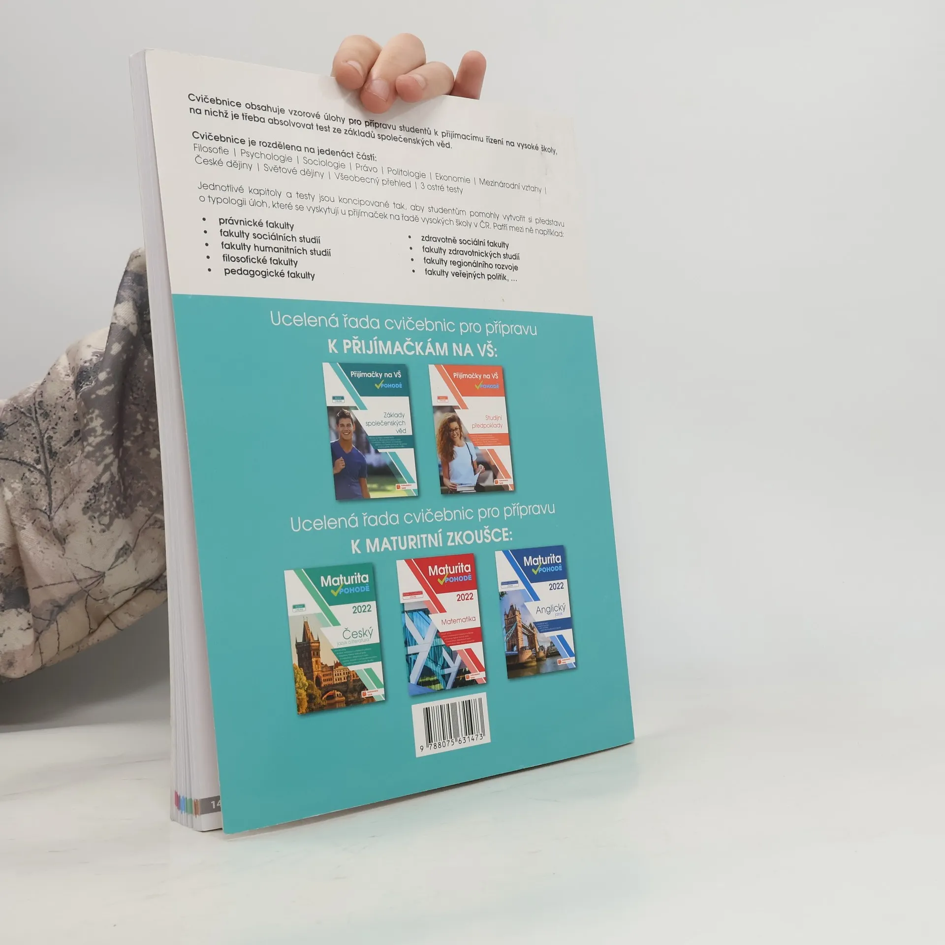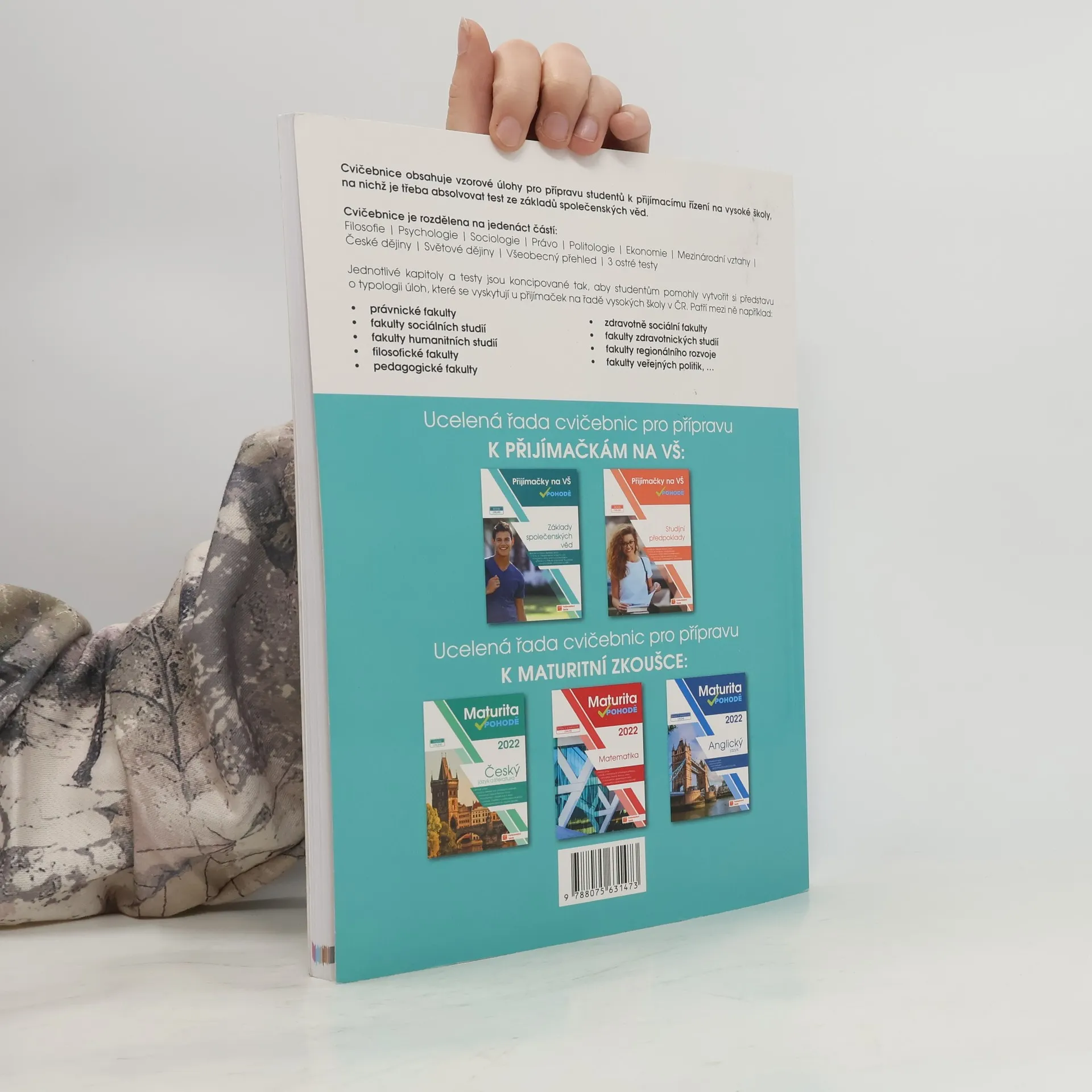 Cílem cvičebnic je poskytnout komplexní přípravu k přijímacímu řízení na vysoké školy, na nichž je třeba absolvovat test ze studijních předpokladů a základů společenských věd. Zpracováním různorodých typologií testových otázek a nejfrekventovanějších témat a oblastí z přijímacích řízení v ČR se podařilo žákům poskytnout kompletní podklady pro přípravu na testy ze studijních předpokladů a základů společenských věd na libovolnou vysokou školu v České republice. Cvičebnice obsahují vzorové úlohy pro přípravu studentů k přijímacímu řízení na vysoké školy, na nichž je třeba absolvovat test ze studijních předpokladů a základů společenských věd.