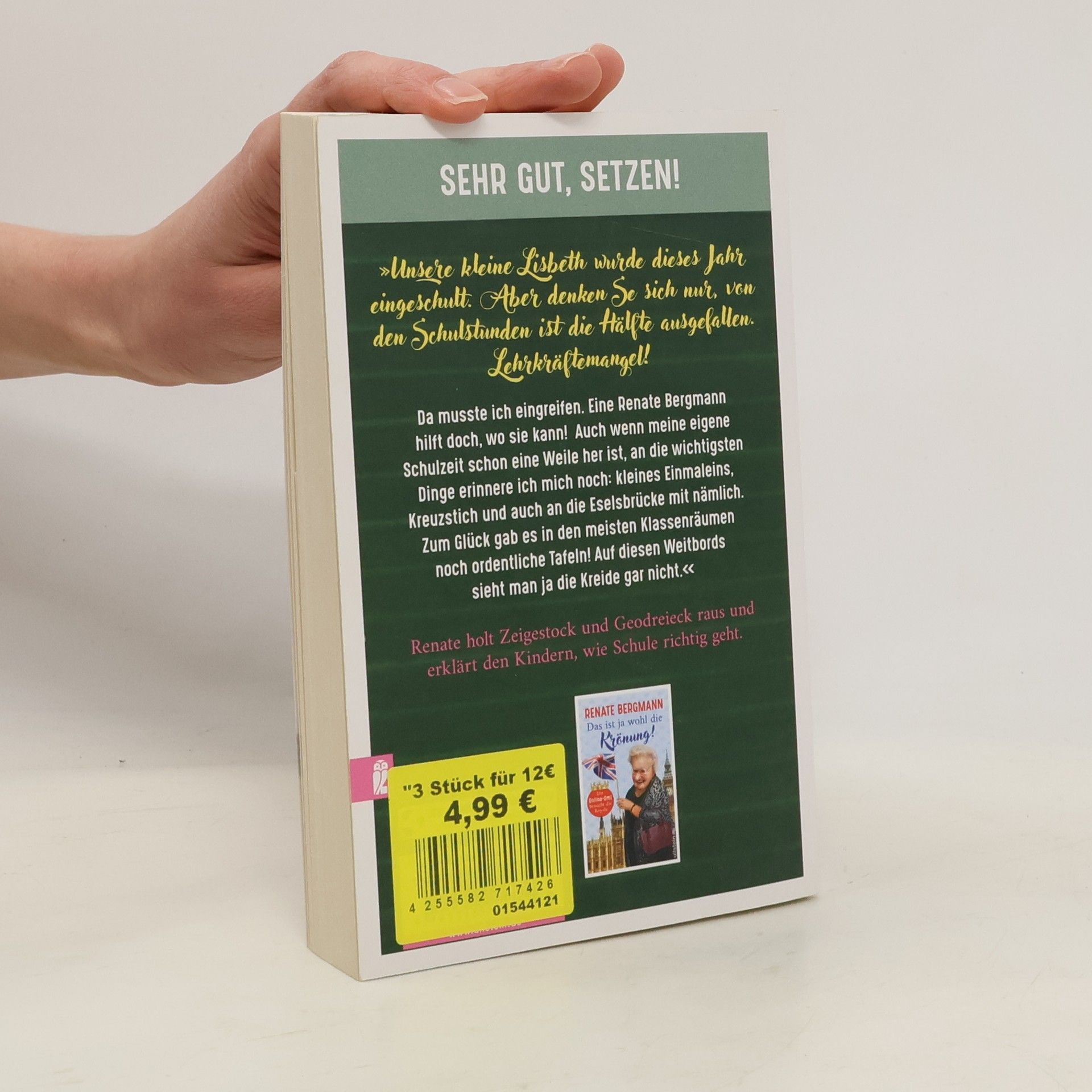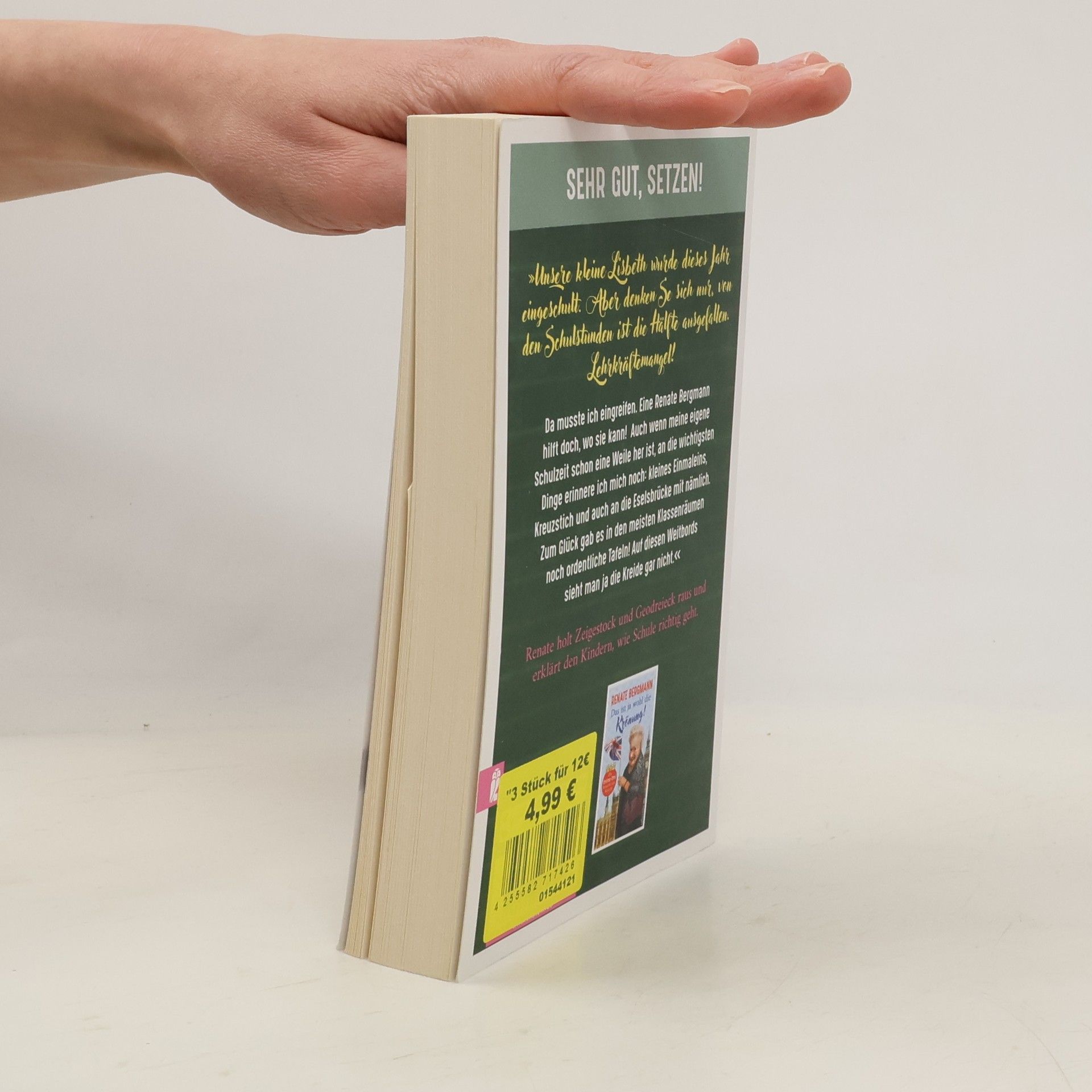Sehr gut, setzen! »Unsere kleine Lisbeth, was die Tochter von meinem Neffen Stefan ist, wurde dieses Jahr eingeschult. Aber denken Se sich nur, von den Schulstunden ist die Hälfte ausgefallen. Lehrkräftemangel! Ariane war ganz außer sich vor Sorge, dass das Kind auf der Strecke bleibt. Dabei ist die Kleine wirklich schlauer als zum Beispiel der Jemie-Dieter von meiner Nachbarin Frau Berber. Der hat sogar schon einen blauen Brief bekommen, aber das liegt daran, dass die Berber mit ihm die Hausaufgaben macht – und die ist nicht gerade die hellste Lampe im Laden. Na, jedenfalls musste man da eingreifen. Die reden von sozialem Pflichtjahr – aber warum eigentlich nur für die Jungen? Und die Rente soll es jetzt sogar erst mit 70 geben, denken Se das mal! Ich bin schon mit 60 in Pension gegangen! Da ist es besser, wenn ich noch was nacharbeite, bevor die mir draufkommen. Eine Renate Bergmann hilft doch, wo sie kann! Auch wenn meine eigene Schulzeit schon eine Weile her ist, an die wichtigsten Dinge erinnere ich mich noch: kleines Einmaleins, Kreuzstich und auch an die Eselsbrücke mit nämlich. Zum Glück gab es in den meisten Klassenräumen noch ordentliche Tafeln! Auf diesen Weitbords sieht man ja die Kreide gar nicht.« Renate holt Zeigestock und Geodreieck raus und erklärt den Kindern, wie Schule richtig geht.
