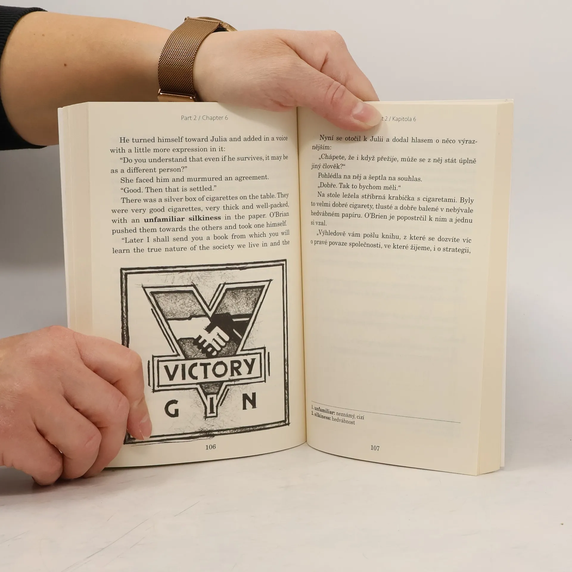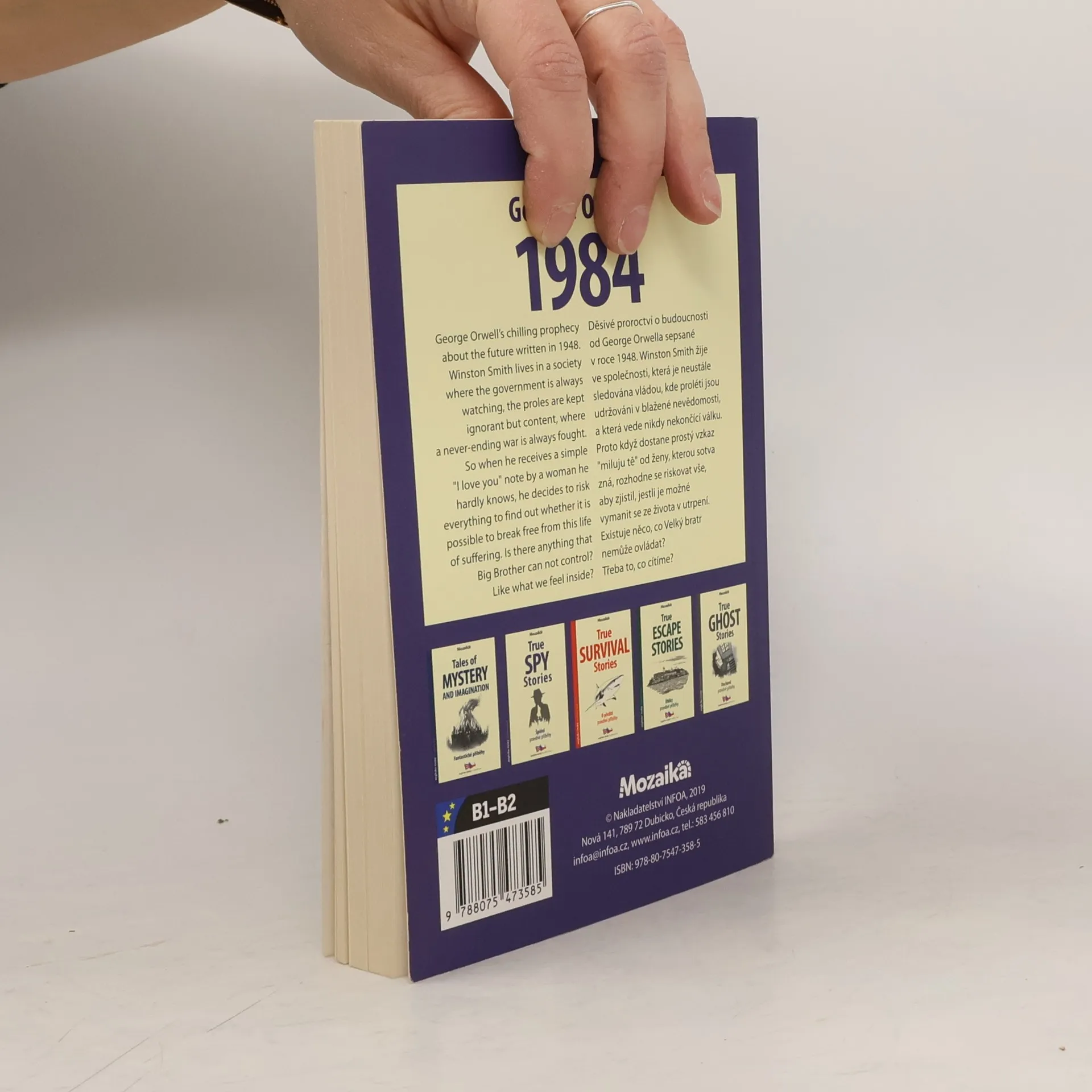 Adaptace díla George Orwella. Anglicko-český zrcadlový text (B1–B2). Děsivé proroctví o budoucnosti od George Orwella sepsané v roce 1984. Winston Smith žije ve společnosti, která je neustále sledována vládou, kde proléti jsou udržováni v blažené nevědomosti, a která vede nikdy nekončící válku. Proto když dostane prostý vzkaz miluju tě od ženy, kterou sotva zná, rozhodne se riskovat vše, aby zjistil, jestli je možné vymanit se ze života v utrpení. Existuje něco, co Velký bratr nemůže ovládat? Třeba to, co cítíme.