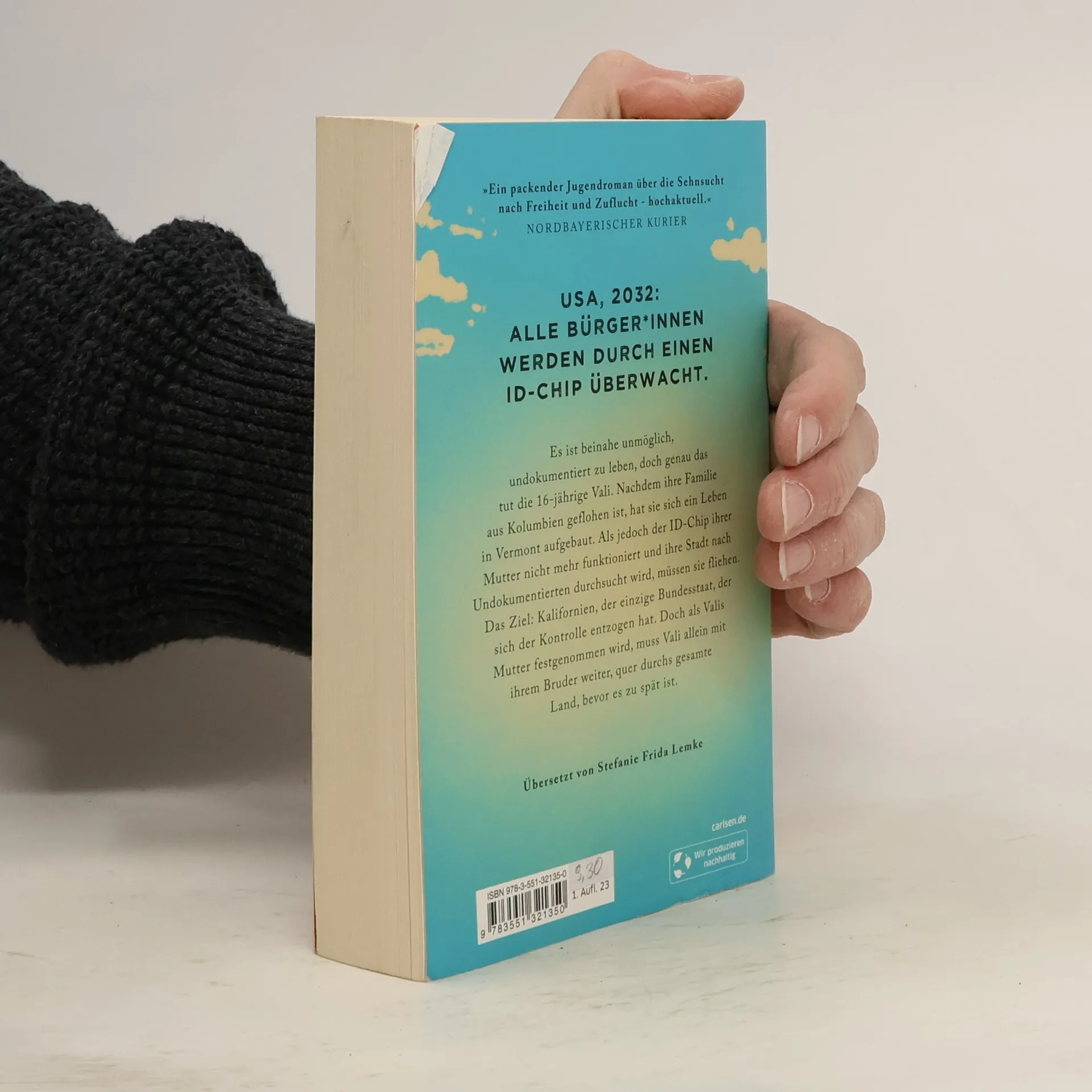 Nominiert für den Deutschen Jugendliteraturpreis! USA, 2032: Alle Bürger*innen werden durch einen ID-Chip überwacht. Es ist beinahe unmöglich, undokumentiert zu leben, doch genau das tut die 16-jährige Vali. Nachdem sie aus Kolumbien geflohen ist, hat sich ihre Familie ein Leben in Vermont aufgebaut. Als jedoch der ID-Chip ihrer Mutter nicht mehr funktioniert und ihre Stadt nach Undokumentierten durchsucht wird, müssen sie fliehen. Das Ziel: Kalifornien, der einzige Bundesstaat, der sich der Kontrolle entzogen hat. Doch als Valis Mutter festgenommen wird, muss Vali allein mit ihrem Bruder weiter, quer durch das gesamte Land, bevor es zu spät ist. »Eine der besten Jugend-Dystopien die ich bis jetzt gelesen habe.« Leser*innenstimme