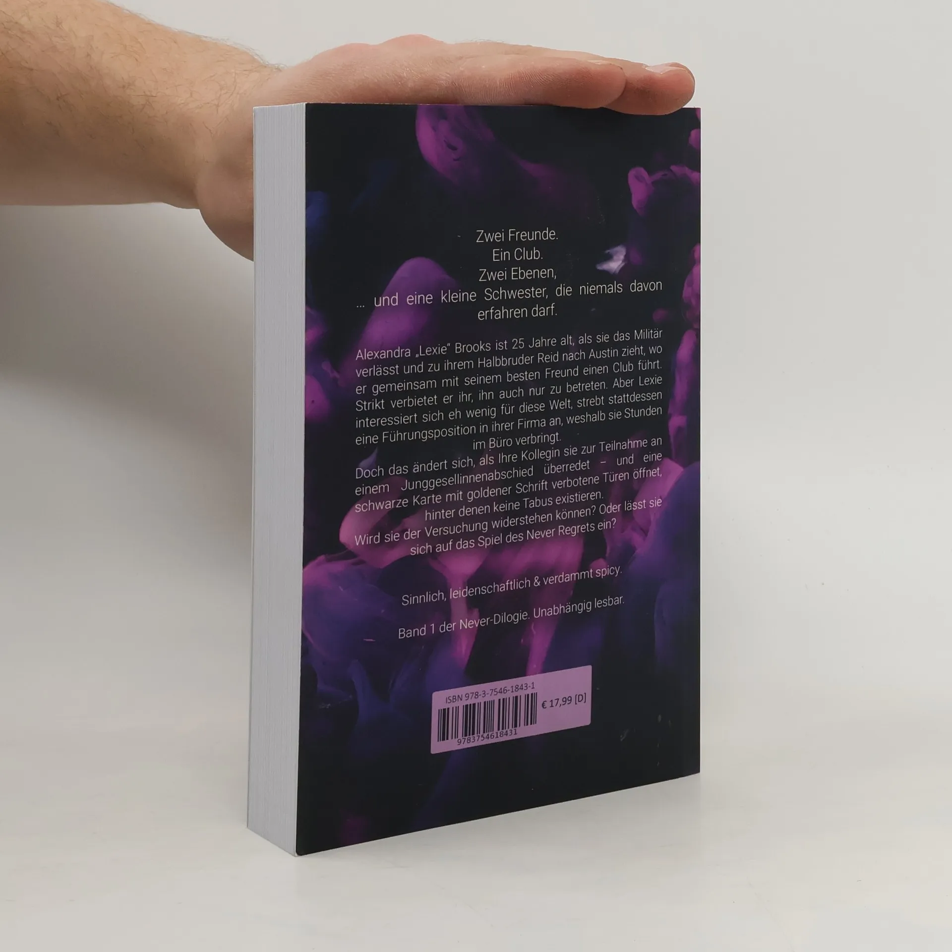 Zwei Freunde. Ein Club. Zwei Ebenen, … und eine kleine Schwester, die niemals davon erfahren darf. Alexandra „Lexie“ Brooks ist 25 Jahre alt, als sie das Militär verlässt und zu ihrem Halbbruder Reid nach Austin zieht, wo er gemeinsam mit seinem besten Freund einen Club führt. Strikt verbietet er ihr, ihn auch nur zu betreten. Aber Lexie interessiert sich eh wenig für diese Welt, strebt stattdessen eine Führungsposition in ihrer Firma an, weshalb sie Stunden im Büro verbringt. Doch das ändert sich, als Ihre Kollegin sie zur Teilnahme an einem Junggesellinnenabschied überredet – und eine schwarze Karte mit goldener Schrift verbotene Türen öffnet, hinter denen keine Tabus existieren. Wird sie der Versuchung widerstehen können? Oder lässt sie sich auf das Spiel des Never Regrets ein? Sinnlich, leidenschaftlich & verdammt spicy. Band 1 der Never-Dilogie. Unabhängig lesbar.