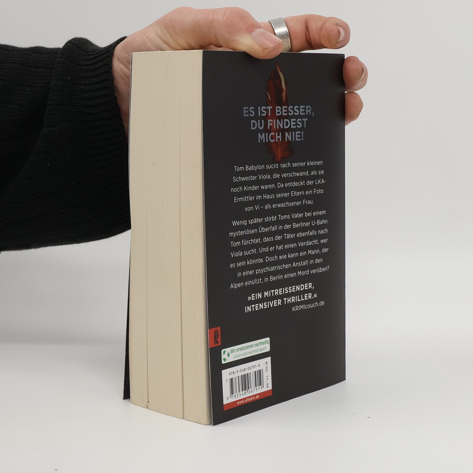 Es ist besser, du findest mich nie LKA-Ermittler Tom Babylon ist wie elektrisiert. Seit vielen Jahren sucht er nach seiner kleinen Schwester Vi. Und plötzlich gibt es einen Hinweis: Ein Foto von Viola als erwachsene Frau, das er im Keller seines Elternhauses findet. Wenig später kommt Toms Vater bei einem mysteriösen Überfall in der Berliner U-Bahn ums Leben. Tom fürchtet, auch der Täter ist auf der Suche nach Viola. Und er hat einen Verdacht, wer es sein könnte: sein früherer Mentor Dr. Walter Bruckmann, der geschworen hat, ihm das Leben zur Hölle zu machen. Doch wie kann ein Mann, der seit seiner Verurteilung in einer psychiatrischen Anstalt in den Alpen einsitzt, in Berlin einen Mord verüben? »Ohne Zweifel ist Marc Raabe einer der besten Thriller-Autoren Deutschlands. Die Tom-Babylon-Reihe hat längst Kultstatus erreicht. Wer den Autor noch nicht kennt, sollte dies schnell ändern. „Violas Versteck“ ist ein mitreißender, intensiver Thriller, der den krönenden Abschluss der packenden Reihe um Tom Babylon und Sita Johanns darstellt.« KRIMIcouch. de Marc Raabe enführt Sie in diesem Thriller in ein packendes Kopfkino. Band 4 der Tom Babylon-Serie. Verpassen Sie nicht Band 1 bis 3!