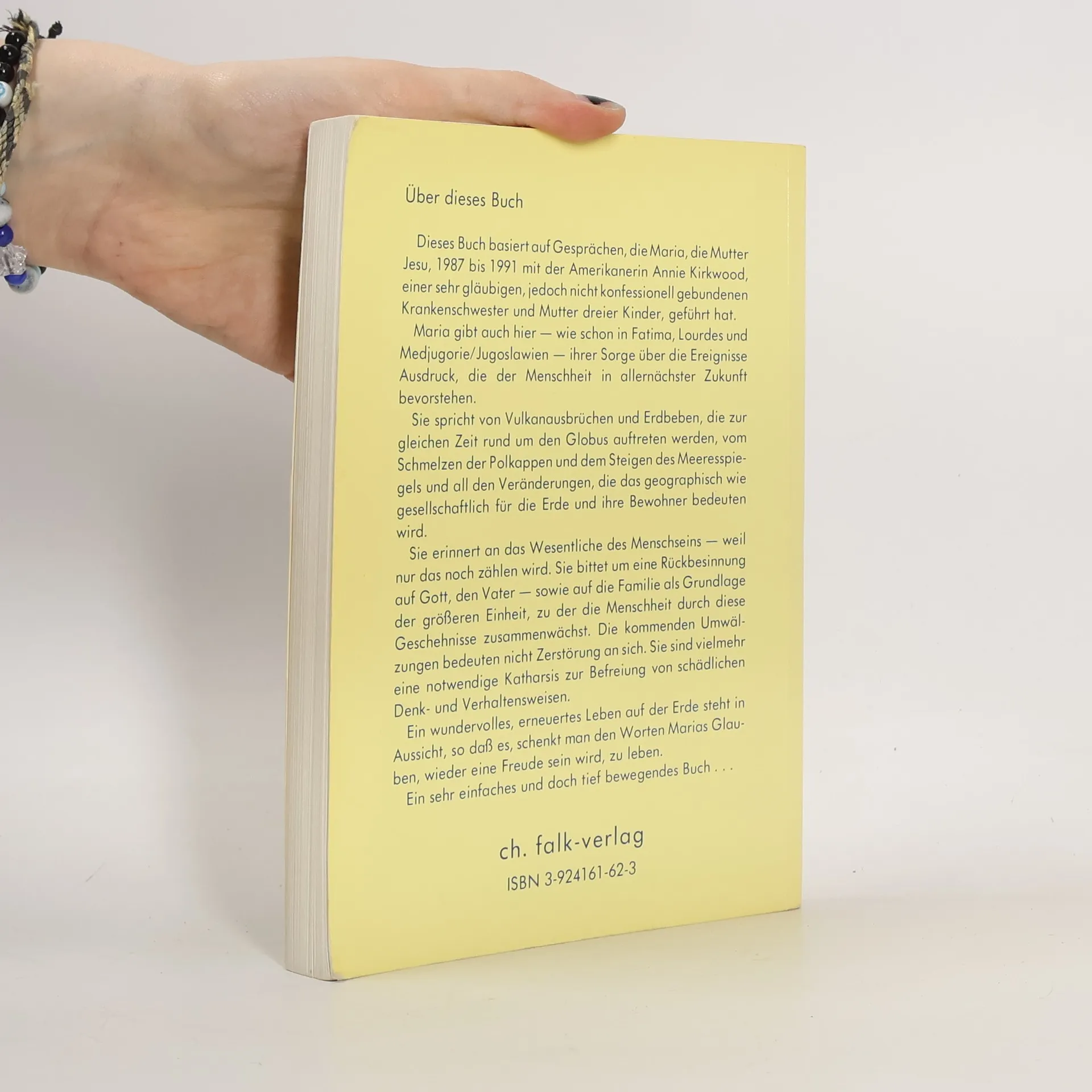 Dieses Buch basiert auf Gesprächen, die Maria, die Mutter Jesu, 1987 bis 1991 mit der Amerikanerin Annie Kirkwood, einer sehr gläubigen, jedoch nicht konfessionell gebundenen Krankenschwester und Mutter dreier Kinder, geführt hat. Maria gibt auch hier - wie schon in Fatima, Lourdes und Medjugorie/Jugoslawien - ihrer Sorge über die Ereignisse Ausdruck, die der Menschheit in allernächster Zukunft bevorstehen. Sie spricht von Vulkanausbrüchen und Erdbeben, die zur gleichen Zeit rund um den Globus auftreten werden, vom Schmelzen der Polkappen und dem Steigen des Meeresspiegels und all den Veränderungen, die das geographisch wie gesellschaftlich für die Erde und ihre Bewohner bedeuten wird. Sie erinnert an das Wesentliche des Mensch seins - weil nur das noch zählen wird. Sie bittet um eine Rückbesinnung auf Gott, den Vater - sowie auf die Familie als Grundlage der größeren Einheit, zu der die Menschen durch diese Geschehnisse zusammenwächst. Die kommenden Umwälzungen bedeuten nicht Zerstörung an sich. Sie sind vielmehr eine notwendige Katharsis zur Befreiung von schädlichen Denk- und Verhaltensweisen. Ein wundervolles, erneuertes Leben auf der Erde steht in Aussicht, so daß es, schenkt man den Worten Marias Glauben, wieder eine Freude sein wird, zu leben. Ein sehr einfaches und doch tief bewegendes Buch...