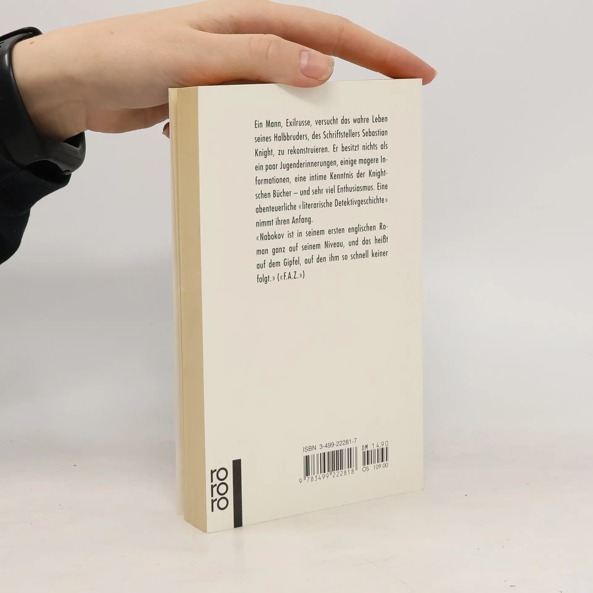 Dieter E. Zimmer, geb. 1934, war freier Autor und Übersetzer. Von 1959–1999 war er Redakteur bei DIE ZEIT, davon 1973–1977 Leiter des Feuilletons, danach als Wissenschaftsjournalist mit den Schwerpunkten Psychologie, Biologie, Medizin und Linguistik. Neben zahlreichen weiteren Auszeichnungen erhielt er den Preis für Wissenschaftspublizistik der Deutschen Gesellschaft für Psychologie. Bei Rowohlt war er u. a. als Herausgeber und Übersetzer für die Nabokov-Gesamtausgabe verantwortlich. Dieter E. Zimmer starb 2020 in Berlin. Vladimir Nabokov wird am 22. April 1899 in St. Petersburg geboren. Nach der Oktoberrevolution flieht die Familie 1919 nach Westeuropa. 1919-1922 in Cambridge Studium der russischen und französischen Literatur. 1922-1937 in Berlin, erste Veröffentlichungen, meist unter dem Pseudonym W. Sirin. 1937-1940 nach der Flucht aus Nazideutschland in Südfrankreich und in Paris, seit 1940 in den USA. 1961-1977 wohnt Nabokov im Palace Hotel in Montreux. Er stirbt am 2. Juli 1977.