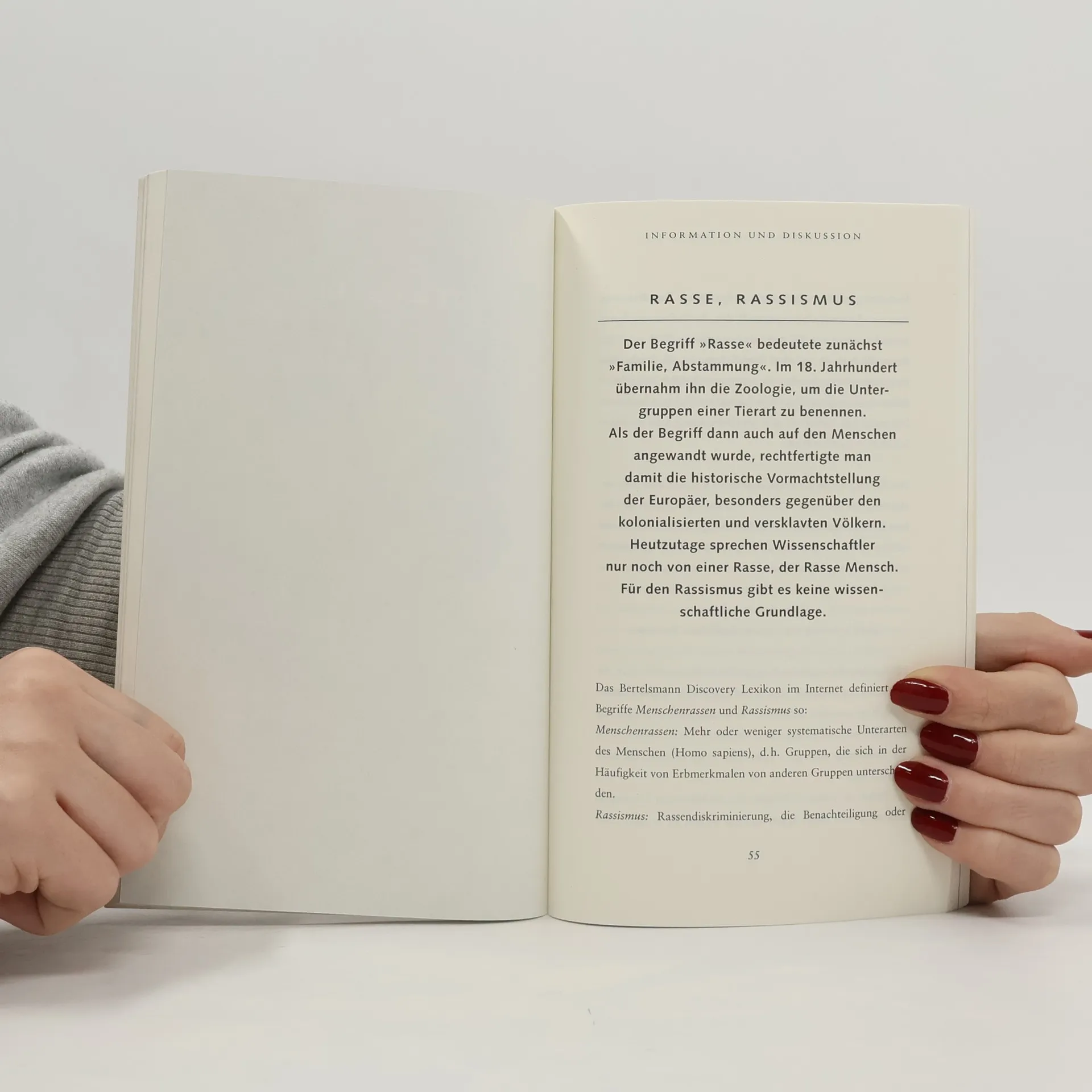 Im ebenso wie 'Drogen' (in dieser Nr.) aufgebauten 'Rassismus'-Heft läßt die Autorin 2 authentische Opfer rassistischer Gewalt berichten: einen jungen Pariser marokkanischer Abstammung, der von Skinheads mit Benzin übergossen und angezündet wurde, und eine rumänische Roma, deren Angehörige in deutschen KZs umgebracht wurden, die aber auch heute angefeindet wird. Der Abschnitt 'Information und Diskussion' behandelt die Geschichte des Antisemitismus, der Schwarzen in USA, die amerikanische Bürgerrechtsbewegung, Apartheid in Südafrika und Nelson Mandela: eine wohldosierte Mischung von Beispielen der Not ebenso wie von erfolgreichem Widerstand. Ebenso wie der Band 'Drogen' eine Aufforderung zu intellektueller Auseinandersetzung wie zu Betroffenheit und emotionalem Engagement. - Dringend empfohlen, selbstverständlich auch, aber nicht nur, für Schulbibliotheken.