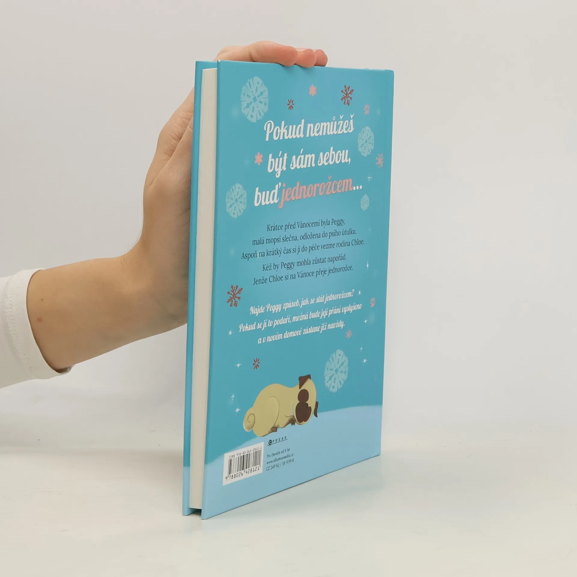 "Pokud nemůžeš být sám sebou, buď jednorožcem…" Krátce před Vánocemi byla Peggy, malá mopsí slečna, odložena do psího útulku. Aspoň na krátký čas si ji do péče vezme rodina Chloe. Peggy si rodinu zamiluje. Kéž by u ní mohla zůstat napořád. Má to jen jeden malý háček – Chloe si na Vánoce přeje jednorožce. Najde Peggy způsob, jak se jím stát?