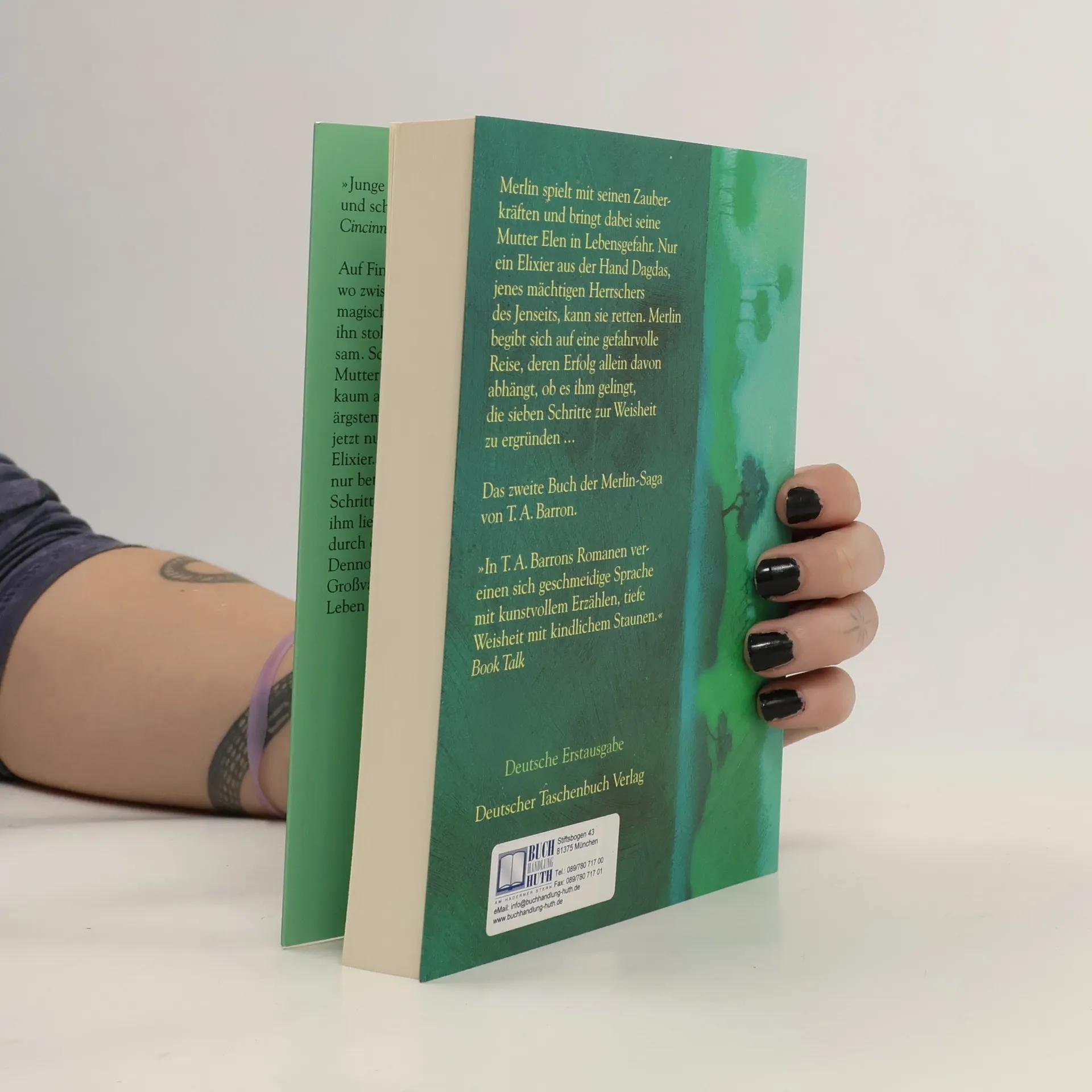 Auf Fincayra, der fantastischen Insel irgendwo zwischen den Welten, fühlt Merlin seine magischen Kräfte wachsen. Das macht ihn stolz, aber auch hochmütig – und einsam. Schließlich wagt er den Zauber, seine Mutter zu sich auf die Insel zu holen. Doch kaum angekommen, wird sie von Merlins ärgstem Feind vergiftet. Retten kann sie jetzt nur noch Dagdas lebensspendendes Elexier. Merlin weiß, dass er Dagdas Heimat nur betreten darf, wenn er zuvor die sieben Schritte zur Weisheit ergründet hat. Vor ihm liegt eine weite und gefährliche Reise durch das ganze Land - und die Zeit drängt. Dennoch will er wagen, was einst seinem Großvater, Fincayras größtem Weisen, das Leben gekostet hatte... Das 2. Buch der Merlin-Saga von T. A. Barron Deutsche Erstausgabe Die Merlin-Welt des Autors T. A. Barron könnt ihr übrigens auch auf dessen homepage www. tabarron. com kennen lernen.
