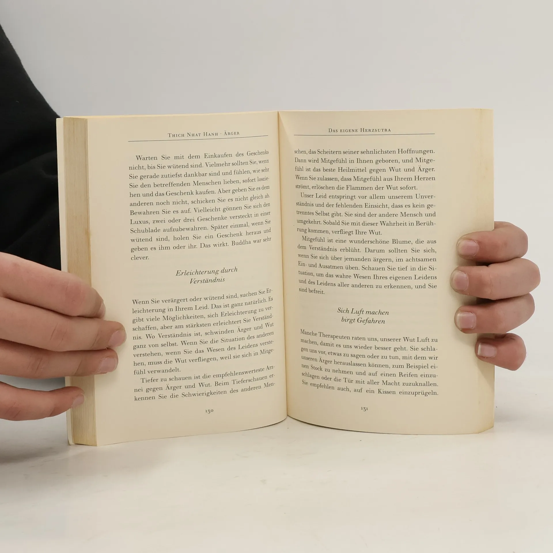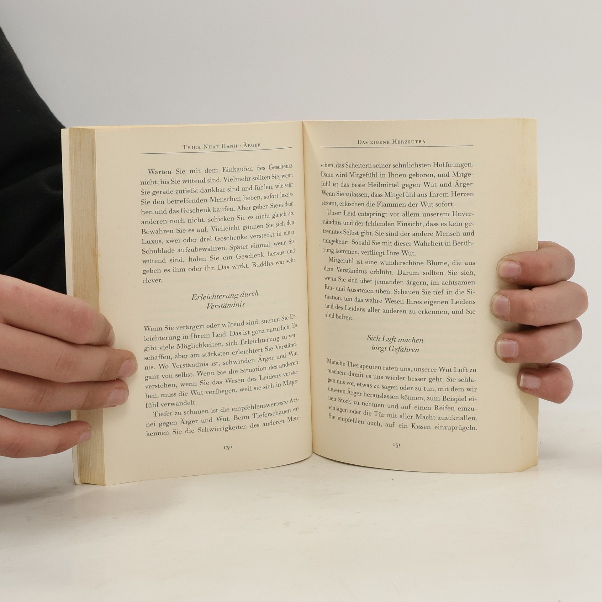 Thich Nhat Hanh lehrt uns, Ärger nicht zu unterdrücken oder zu verstecken, sondern ihn in die positiven Energien des Verstehens und des Mitgefühls umzuwandeln. Anhand zahlreicher Beispiele belegt er, wie sich Frustketten innerhalb der Familie oder über Generationen hinweg bilden. Thich macht deutlich, dass Freiheit die grundlegende Bedingung für Glück ist, nicht nur politische Freiheit, sondern vor allem Freiheit von eigenen Verhaftungen.