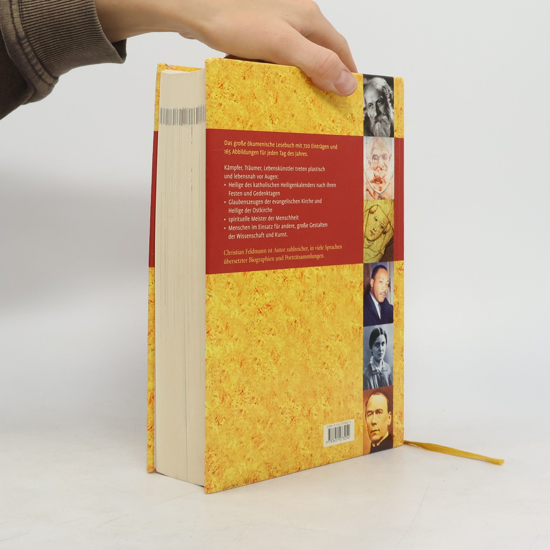 Das große ökumenische Lesebuch. Christian Feldmann hat in jahrelanger Recherche biografische Skizzen zu etwa 700 „großen Gestalten und Heiligen“ verfasst: Zusammen mit etwa 200 Abbildungen ist daraus ein ökumenisches Lesebuch geworden, das für jeden Tag des Jahres Lesestoff bietet: zu den Heiligen des katholischen Heiligenkalenders, zu den Glaubenszeugen der evangelischen Kirche und den Heiligen der Ostkirche, zu spirituellen Meistern der Menschheit, zu großen Gestalten auch jenseits offizieller Heiligenkalender.