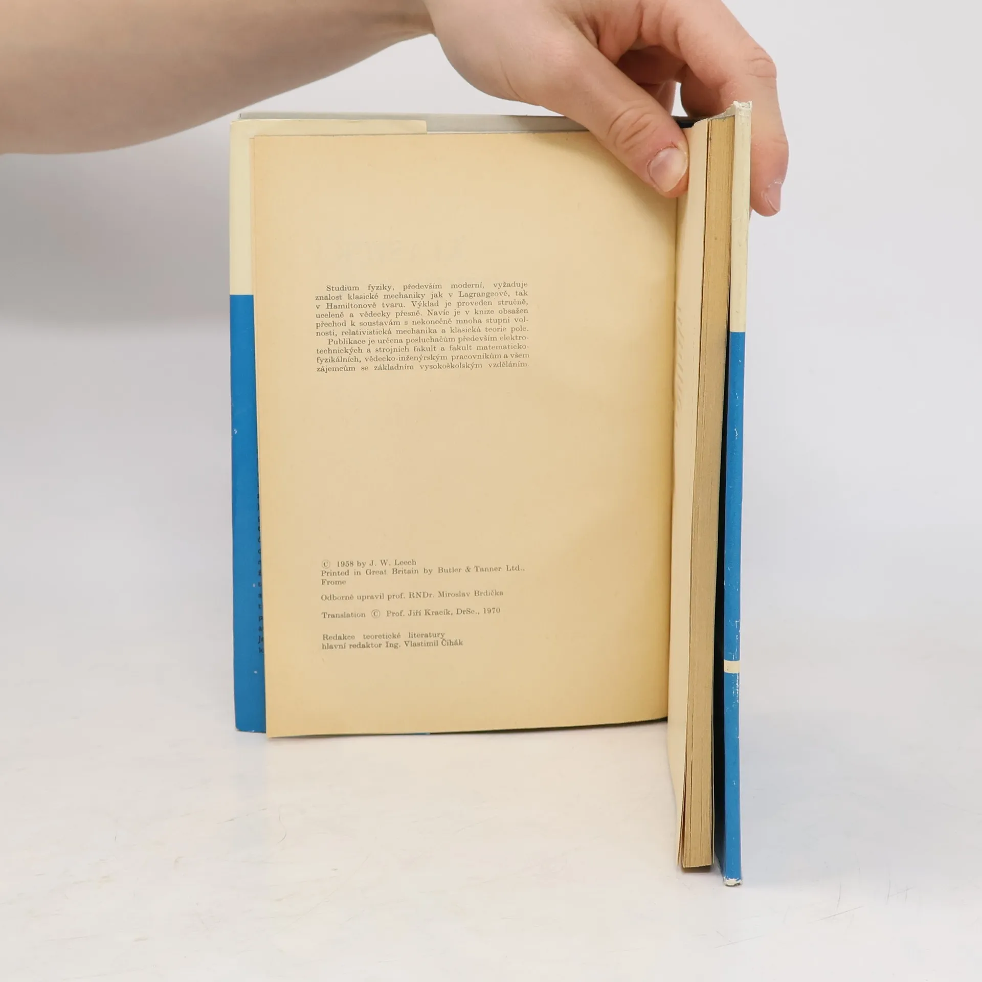 Funkčně stručný a přitom odborně dokonale provedený výklad klasické mechaniky se upíná jen k obecným zásadám a nezabývá se podrobnostmi. Po objasnění základních představ, bezprostředně odvozených z Newtonových zákonů, probírá Lagrangeovu a Hamiltonovu metodu, variační principy, teorii transformací, Poissonovy závorky, spojitá prostředí, relativitu a popisy pole. Kniha je ovšem založena na znalosti základů vysokoškolské fyziky a matematiky. Je publikována zvláště pro studenty a odborníky z fakult elektrotechnických, strojních a matematicko-fyzikálních. Předmluvu napsal Jiří Kracík. (1. vydání)