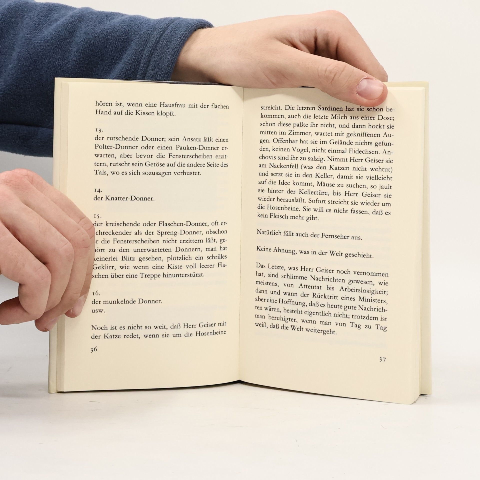 Mit der phantastischen Wachheit des Einsamen registriert Herr Geiser die kleinen Anzeichen einer denkbaren Katastrophe. Das Tal ist durch Unwetter von der Umwelt abgeschnitten. Gefaßt darauf, daß eines Tages der ganze Berg ins Rutschen kommt und das Dorf verschüttet für alle Zeit, liest Herr Geiser im Lexikon, in der Bibel, in Geschichtsbüchern und schreibt ab, was nicht vergessen werden soll.