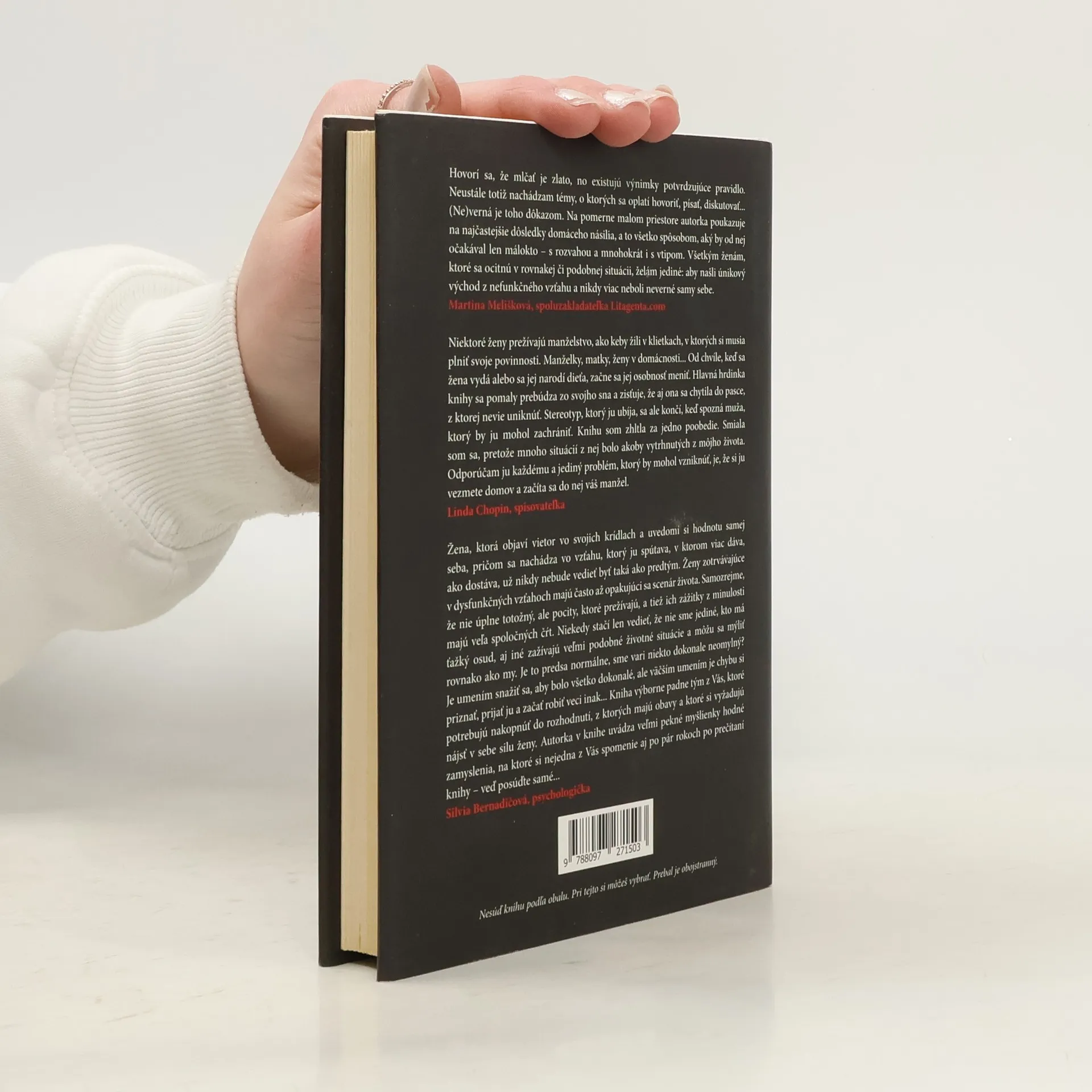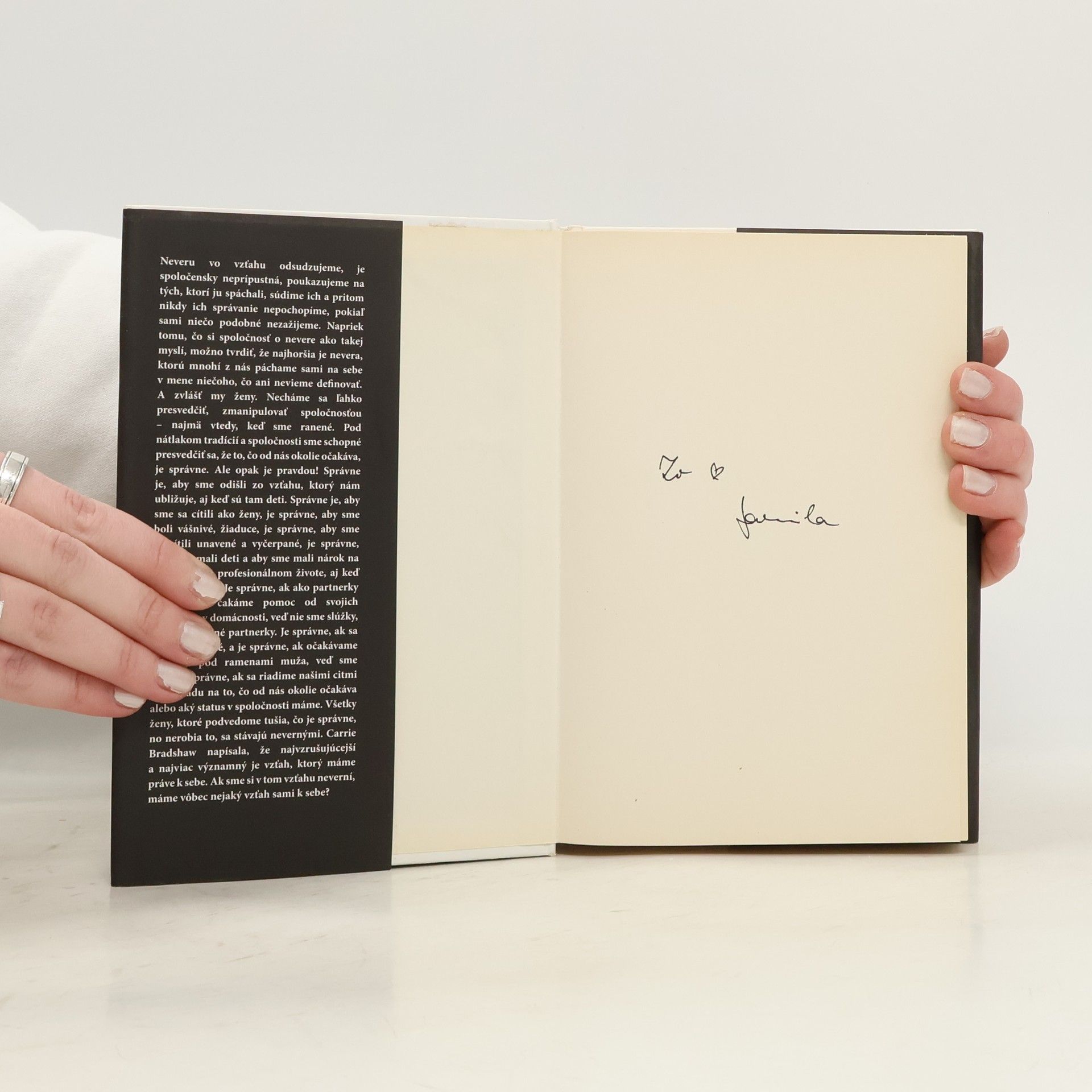 „Najhoršia je nevera, ktorú páchame sami na sebe.„ Príbeh ženy, ktorá stratila samu seba v každodennom živote. Príbeh o bolesti v duši, o mužoch v jej živote, o vášni, ktorá príde, keď ju najmenej čaká, o ľuďoch, ktorí jej zasiahli do života a nechali nemiznúcu stopu. Príbeh hlavnej hrdinky Dušany sa začína jej rozprávaním o detstve a význam tejto kapitoly sa postupne čitateľovi odkrýva v príbehu ženy, ktorá zomrela rukou svojho manžela a jej osoba sa v snoch objavuje Dušane. V čiastočne autobiografickom príbehu zohráva svoju úlohu aj Dušanin manžel Maroš, ktorý je jej prvou láskou, no ich vzájomný vzťah je ovplyvnený hádkami a domácim násilím. Linda, najlepšia priateľka hlavnej postavy, plní v knihe úlohu „svedomia“ hlavnej hrdinky, otvára jej oči a veľmi často hovorí veci, ktoré sa ťažko počúvajú. V hraničnom období, kedy je Dušana vyčerpaná zo situácie v domácnosti, no pred okolím hrá úlohu šťastnej manželky, sa stretáva s Danielom. Dokáže nájsť šťastie s ním?