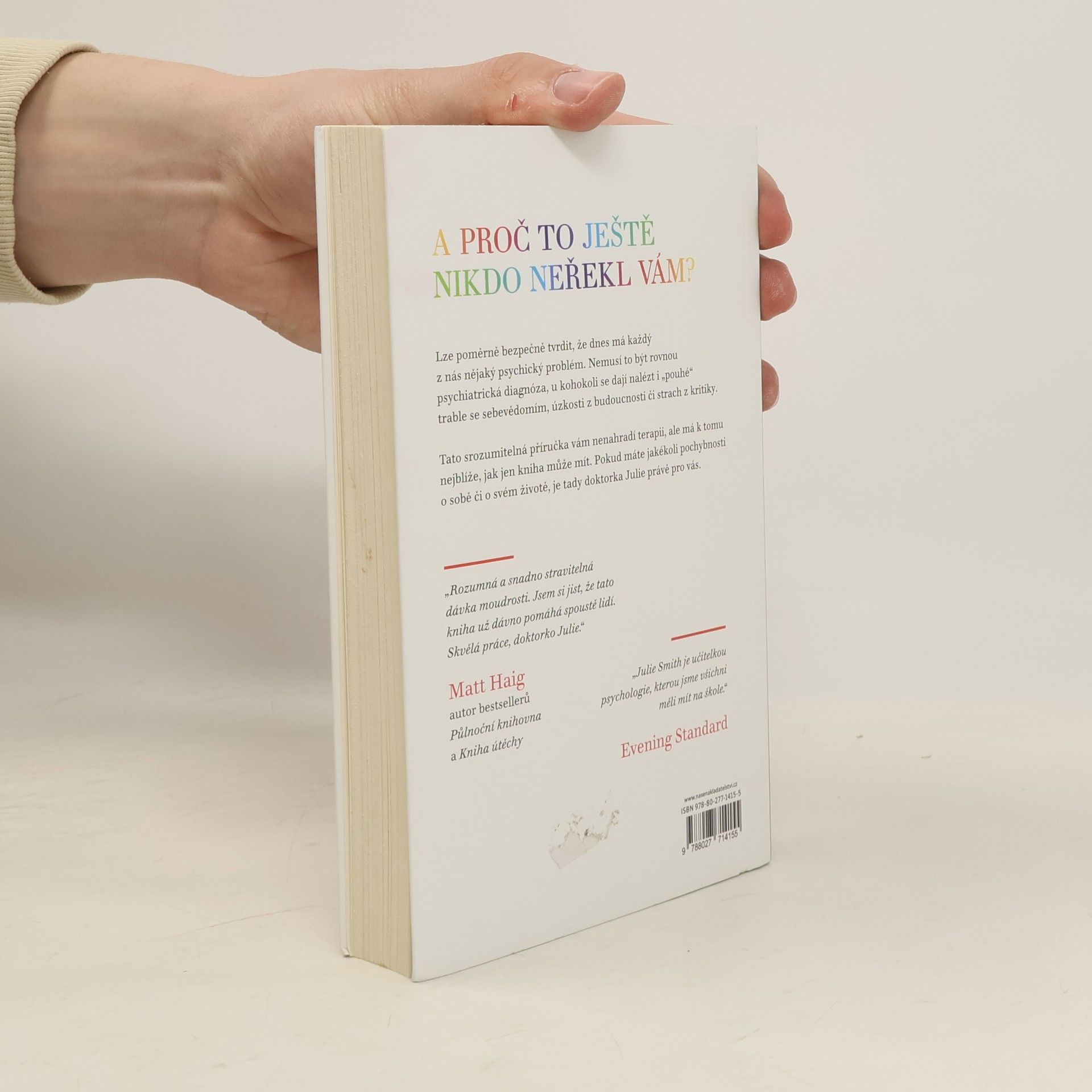 Kniha Proč mi tohle nikdo neřekl dřív? vás naučí, jak posílit své psychické zdraví a udržet si ho i v těch nejnáročnějších obdobích. Odborné rady doktorky Julie Smith a účinné copingové techniky vám pomohou zachovat vaši odolnost, ať už se chcete vyrovnat s úzkostmi, s kritikou, s depresí, vybudovat si sebejistotu, nalézt motivaci nebo se naučit odpouštět sami sobě.Na základě dlouholetých zkušeností s klinickou psychologií se autorka dělí o všechny dovednosti, které potřebujete, abyste zvládli životní vzestupy a pády.Tato kniha je plná tajemství z terapeutovy sady nástrojů a je nezbytnou příručkou pro optimalizaci duševního zdraví. Jednoduché, ale odborné rady doktorky Julie a účinné techniky zvládání vám pomohou zůstat odolní bez ohledu na to, co vám život postaví do cesty.Kniha je napsána v krátkých heslech, takže můžete přejít rovnou na tu část, kterou potřebujete, podle toho, jakému problému právě čelíte – a okamžitě najít vhodné nástroje, které vám pomohou.
