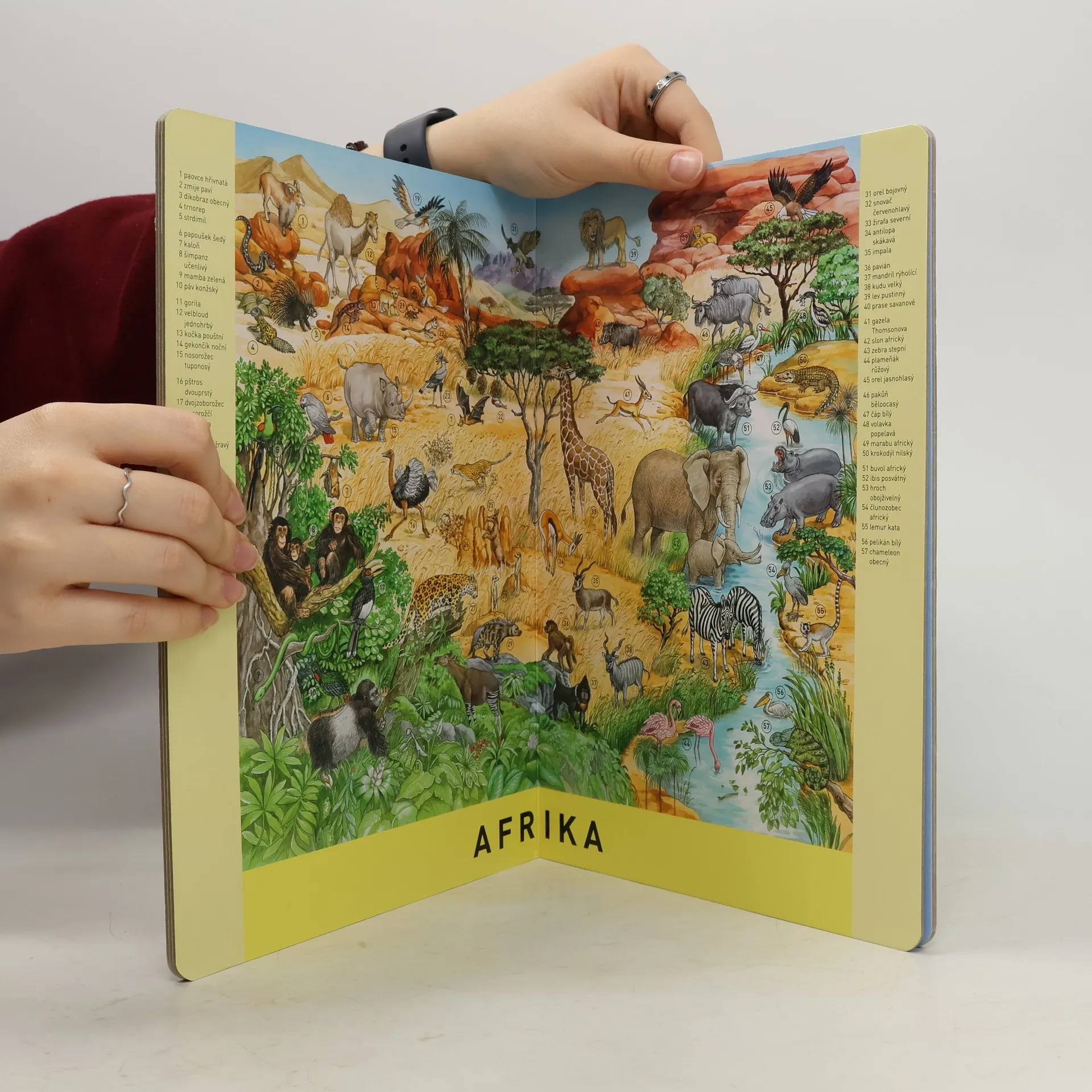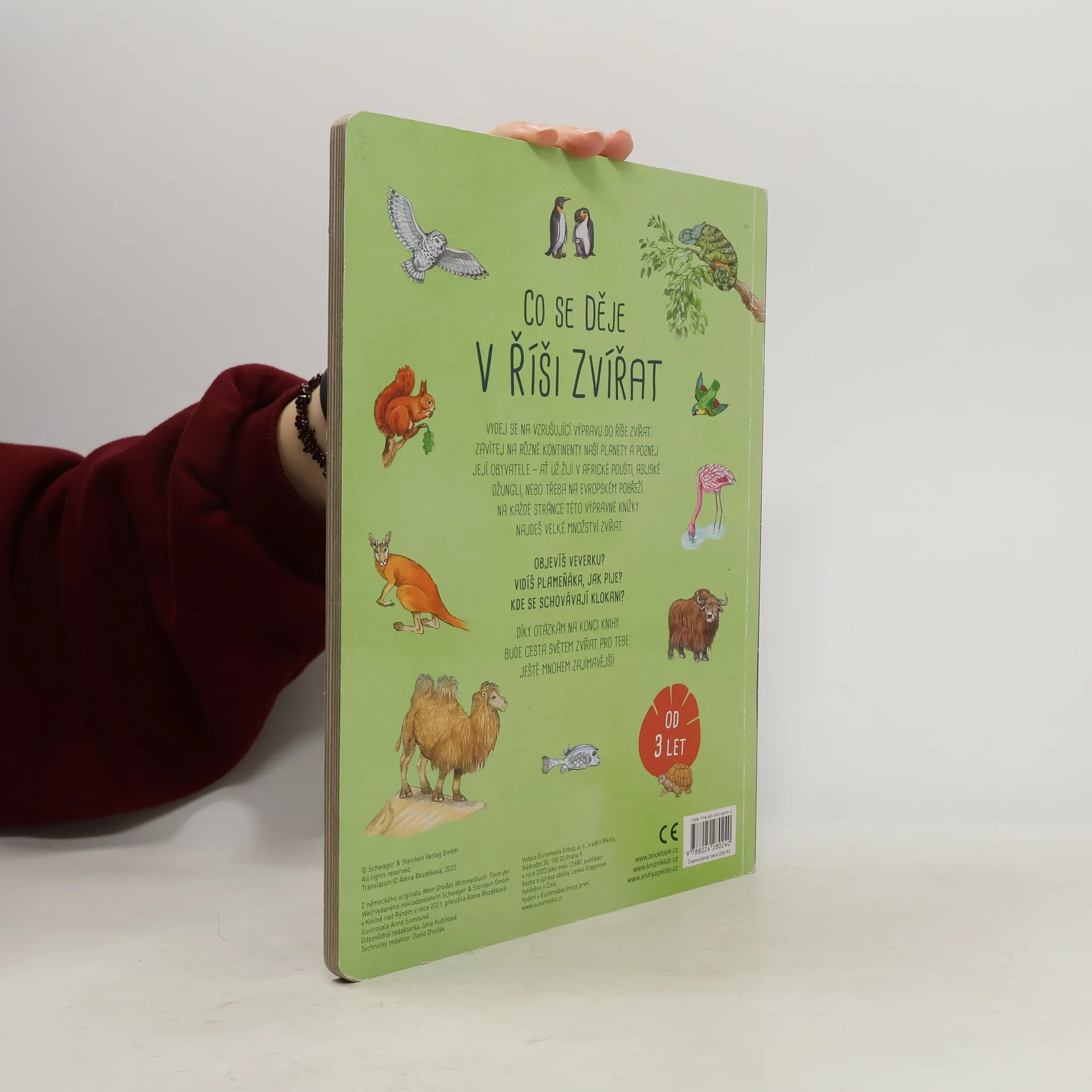 Vydej se na vzrušující výpravu do říše zvířat. Zavítej na různé kontinenty naší planety a poznej její obyvatele – ať už žijí v africké poušti, asijské džungli, nebo třeba na evropském pobřeží. Na každé stránce této výpravné knížky najdeš velké množství zvířat. Objevíš veverku? Vidíš plameňáka, jak pije? Kde se schovávají klokani? Díky otázkám na konci knihy bude cesta světem zvířat pro tebe ještě mnohem zajímavější! Pro děti od 3 let.