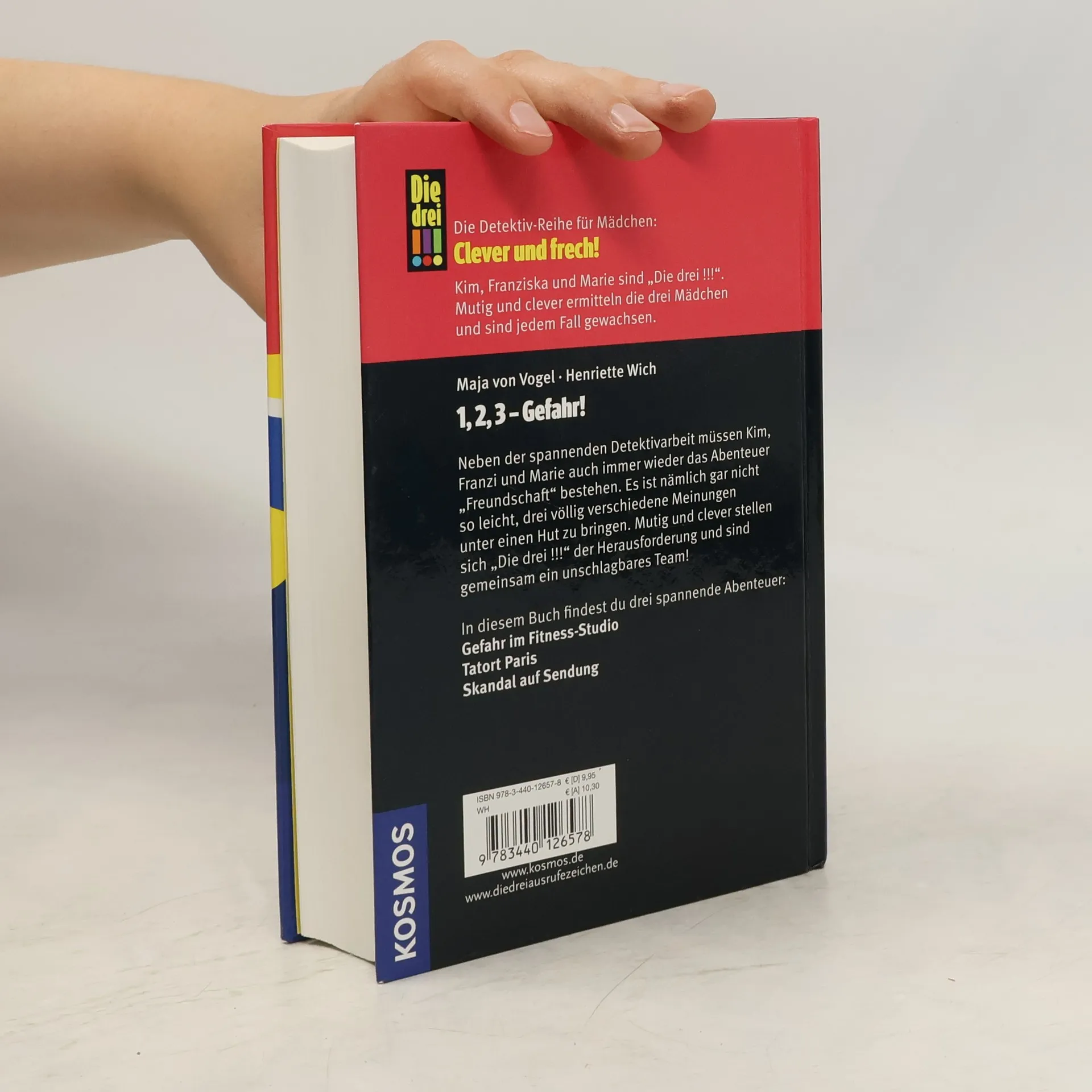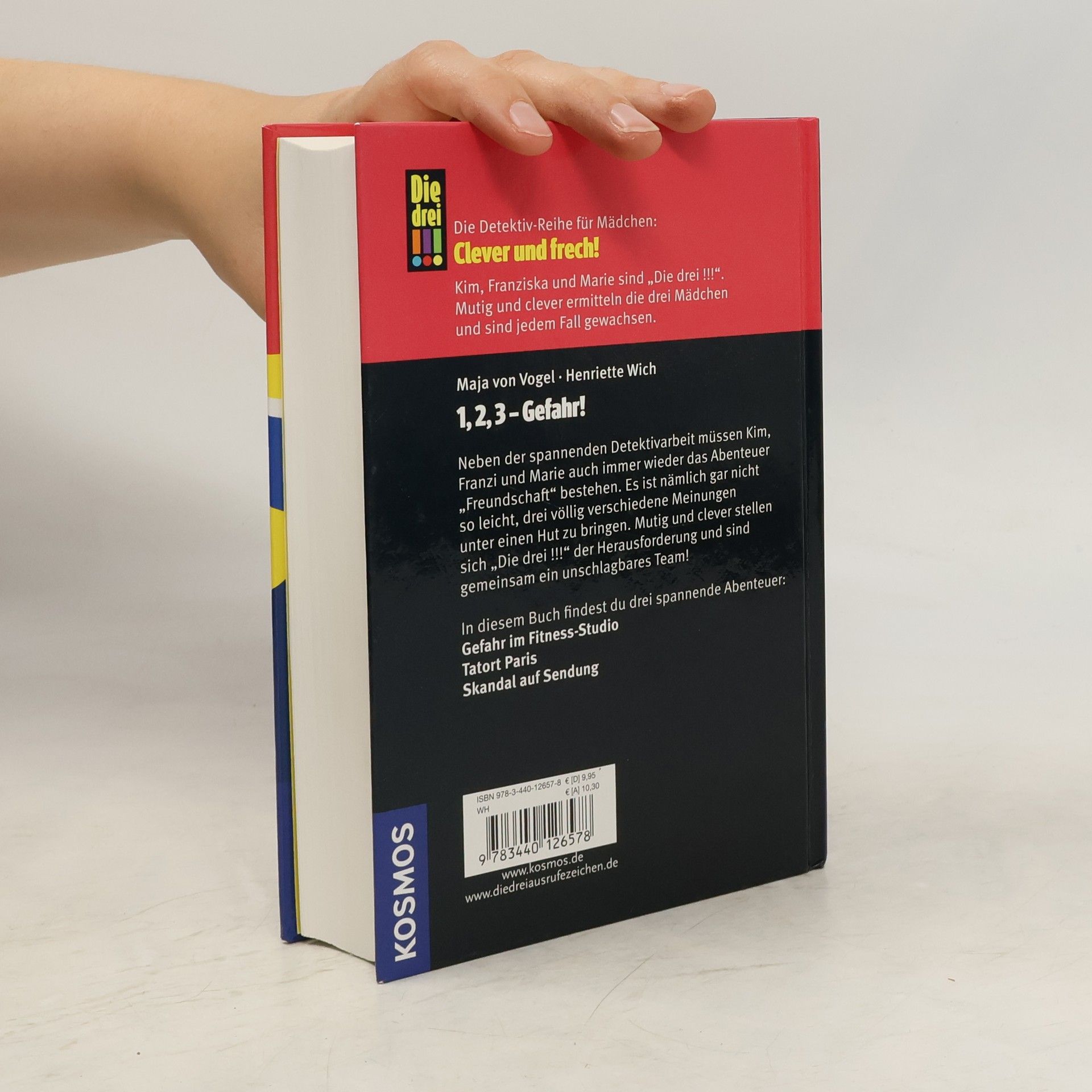 Drei spannende Abenteuer in einem Band: Gefahr im Fitnessstudio; Tatort Paris; Skandal auf Sendung. Ob zweifelhafte Vorfälle im Fitness-Studio, mysteriöse Machenschaften in der Metropole Paris oder Intrigen hinter der Kamera - Kim, Franzi und Marie, alias „Die drei !!!“ decken jede kriminelle Heimlichtuerei auf. Neben der spannenden Detektivarbeit müssen Kim, Franziska und Marie auch immer wieder das Abenteuer „Freundschaft“ bestehen. Es ist nämlich gar nicht so leicht, drei völlig verschiedene Meinungen unter einen Hut zu bringen. Mutig und clever stellen sich „Die drei !!!“ der Herausforderung und sind gemeinsam ein unschlagbares Team!