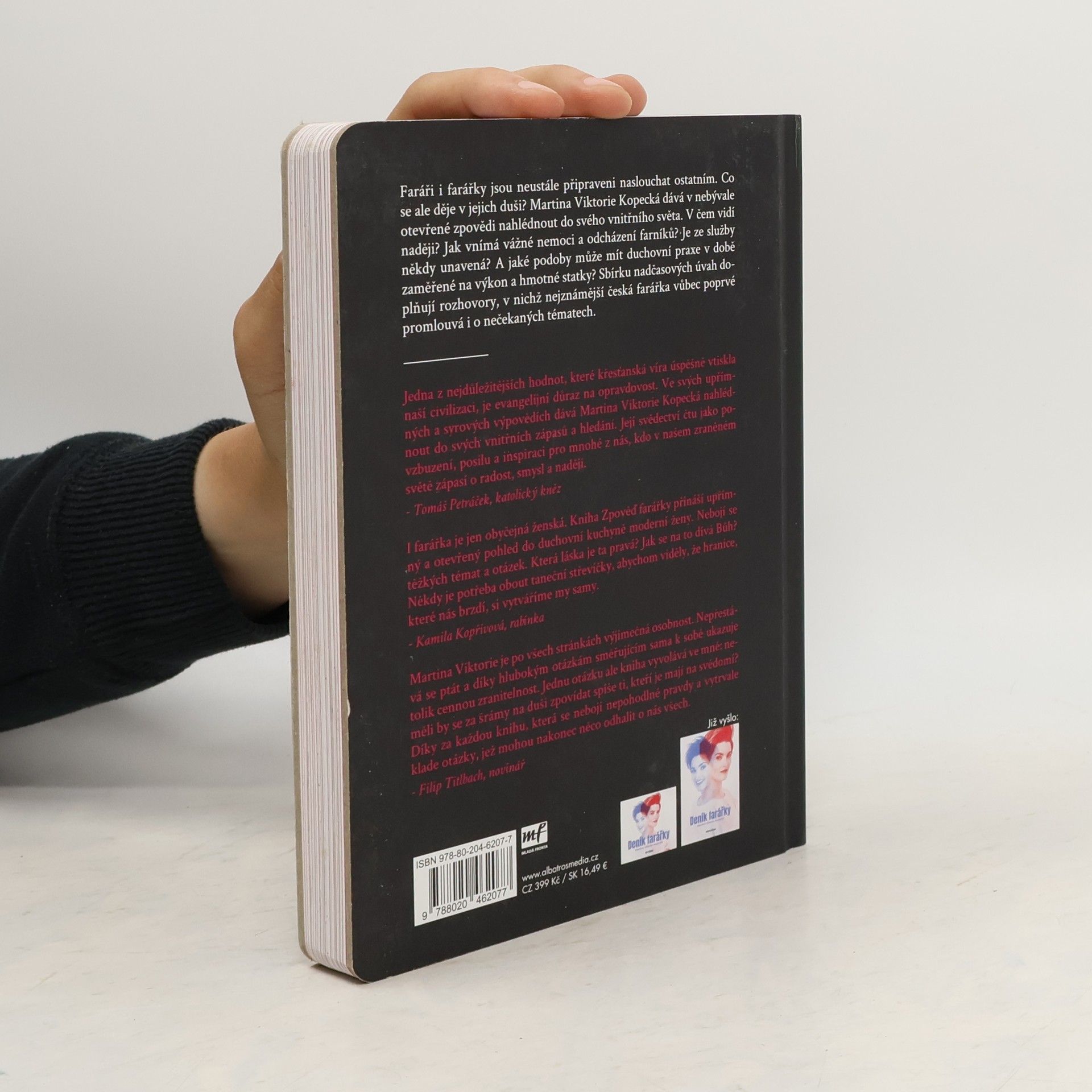 O životě farářky už jste četli. Teď se připravte na cestu do jejího nitra. Faráři i farářky jsou neustále připraveni naslouchat ostatním. Co se ale děje v jejich duši? Martina Viktorie Kopecká dává v nebývale otevřené zpovědi nahlédnout do svého vnitřního světa. Co si myslí o celibátu a založení rodiny? Jak vnímá vážné nemoci a odcházení svých farníků? Je ze služby někdy unavená? A jaké podoby může mít duchovní praxe v době zaměřené na výkon a hmotné statky? Sbírku nadčasových úvah doplňují rozhovory, v nichž nejznámější česká farářka vůbec poprvé promlouvá i o nečekaných tématech.