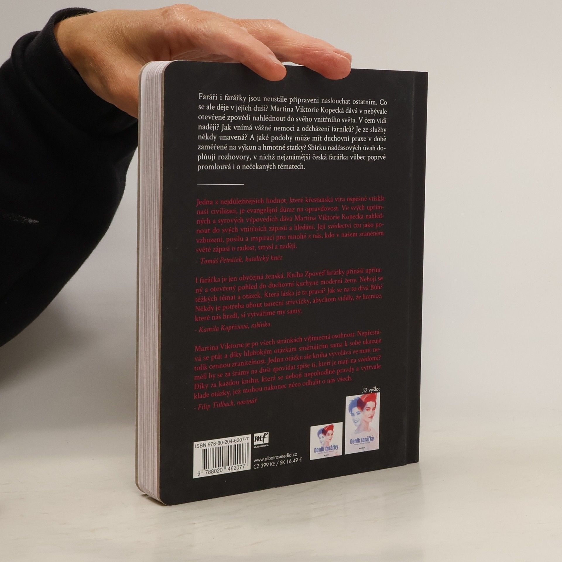 O životě farářky už jste četli. Teď se připravte na cestu do jejího nitra. Faráři i farářky jsou neustále připraveni naslouchat ostatním. Co se ale děje v jejich duši? Martina Viktorie Kopecká dává v nebývale otevřené zpovědi nahlédnout do svého vnitřního světa. Co si myslí o celibátu a založení rodiny? Jak vnímá vážné nemoci a odcházení svých farníků? Je ze služby někdy unavená? A jaké podoby může mít duchovní praxe v době zaměřené na výkon a hmotné statky? Sbírku nadčasových úvah doplňují rozhovory, v nichž nejznámější česká farářka vůbec poprvé promlouvá i o nečekaných tématech.