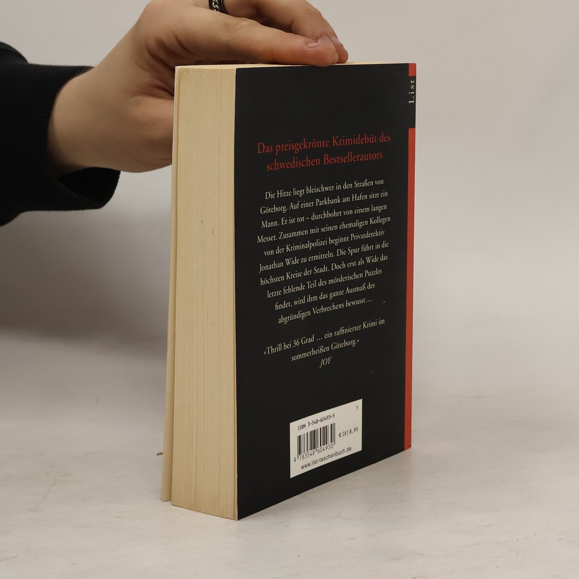 Die Hitze liegt bleischwer in den Straßen von Göteborg. Auf einer Parkbank am Hafen sitzt ein Mann. Er ist tot - durchbohrt von einem langen Messer. Zusammen mit seinen ehemaligen Kollegen von der Kriminalpolizei beginnt Privatdetektiv Jonathan Wide zu ermitteln. Die Spur führt in die höchsten Kreise der Stadt. Doch erst als Wide das letzte fehlende Teil des mörderischen Puzzles findet, wird ihm das ganze Ausmaß des abgründigen Verbrechens bewusst ...