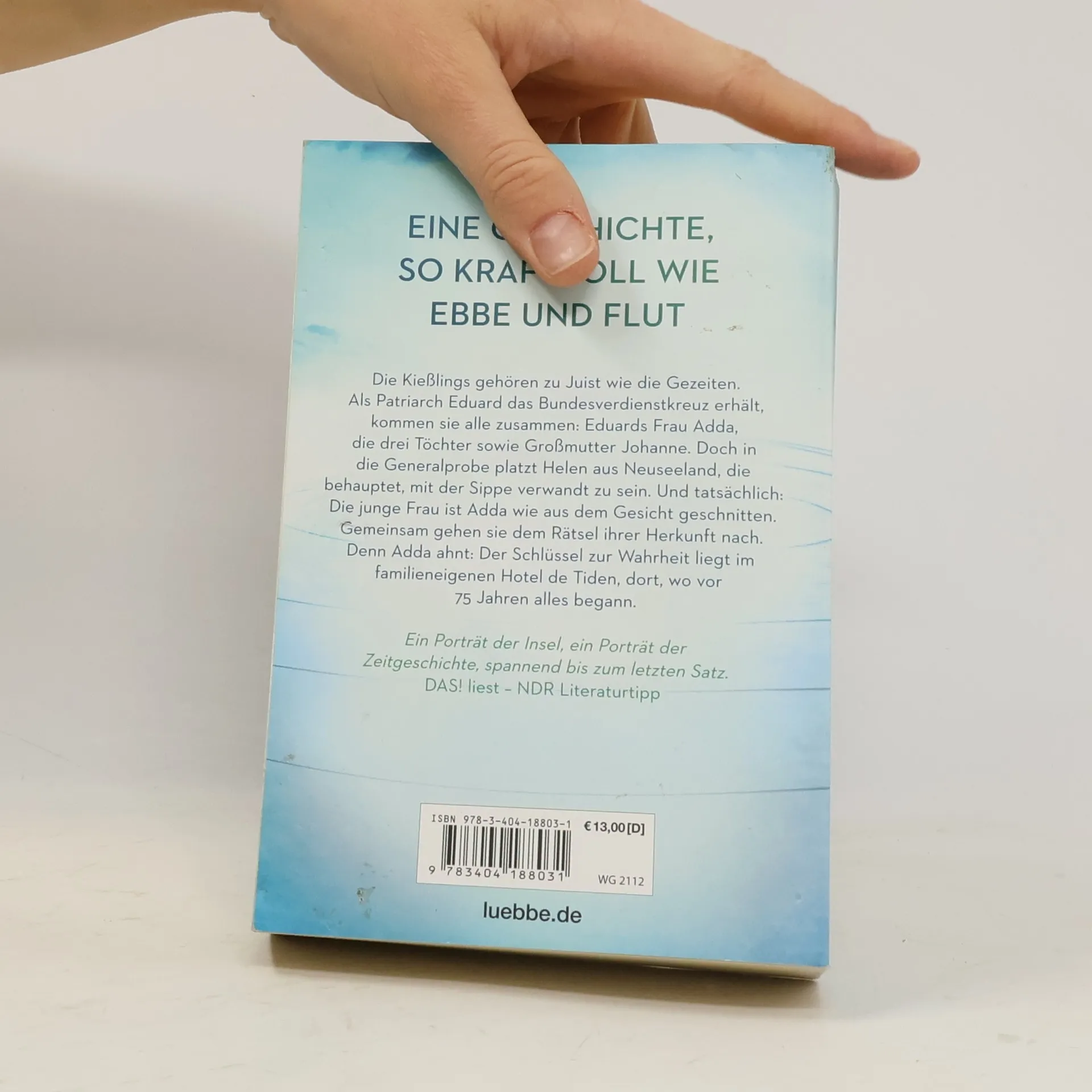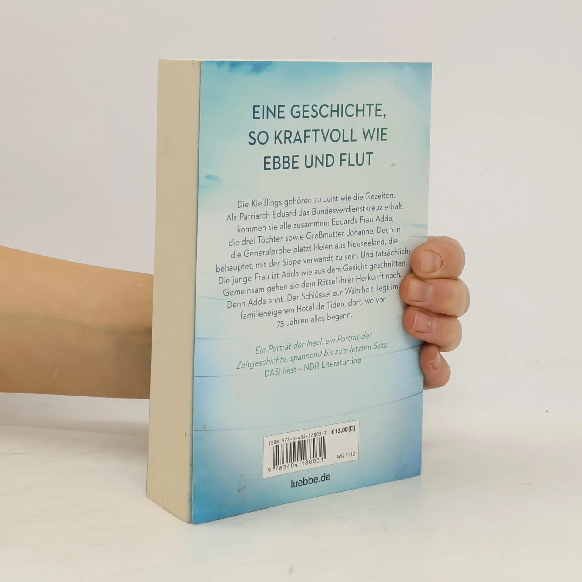 Die Kießlings gehören zu Juist wie die Gezeiten. Als Patriarch Eduard das Bundesverdienstkreuz erhält, kommen sie alle zusammen: Eduards Frau Adda, die drei Töchter, sowie Großmutter Johanne. Doch in die Generalprobe platzt Helen aus Neuseeland, die behauptet, mit der Sippe verwandt zu sein. Und tatsächlich: Die junge Frau ist Adda wie aus dem Gesicht geschnitten. Gemeinsam gehen sie dem Rätsel ihrer Herkunft nach. Denn Adda ahnt: Der Schlüssel zur Wahrheit liegt im familieneigenen Hotel de Tiden, dort, wo vor 75 Jahren alles begann.