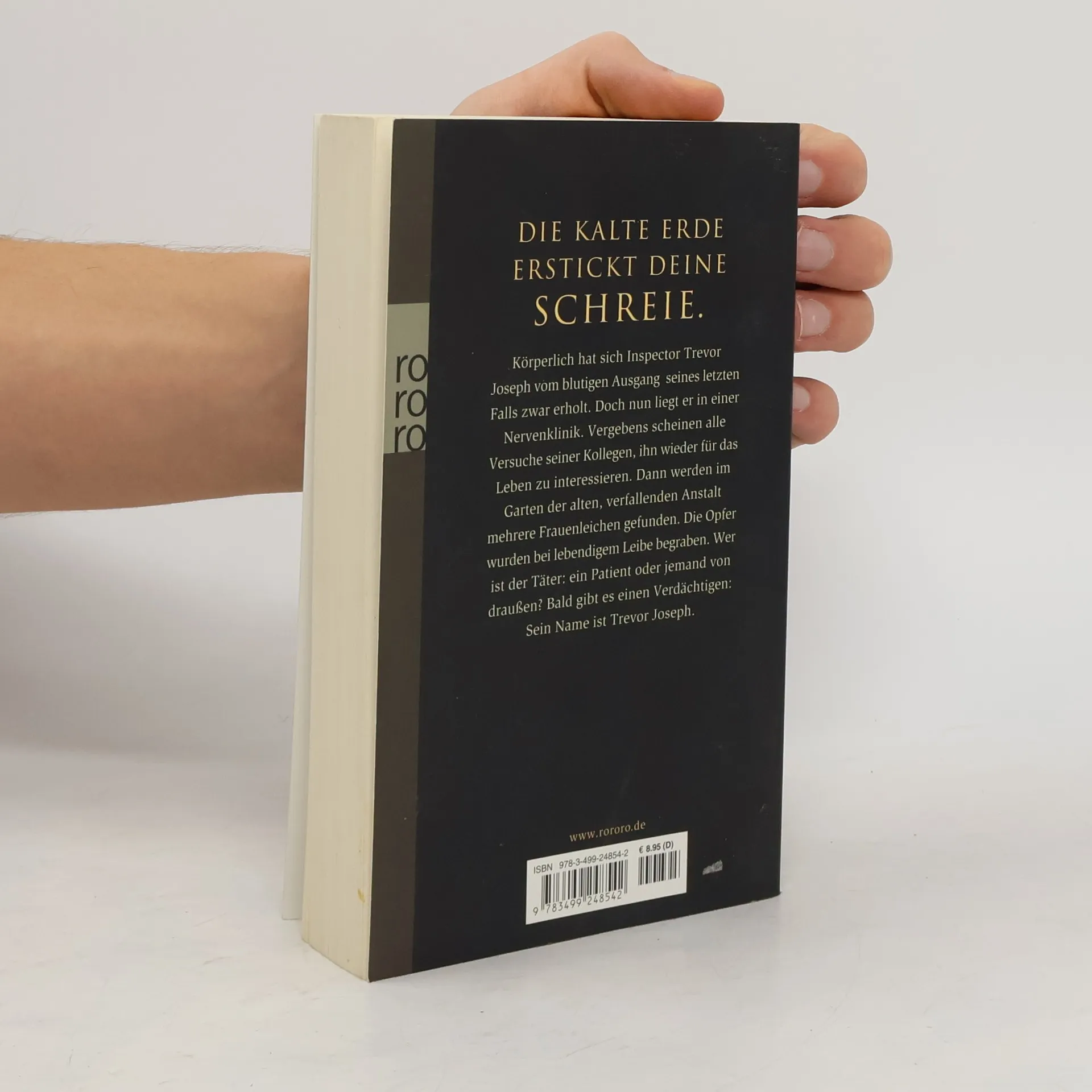 Die kalte Erde erstickt deine Schreie.Körperlich hat sich Inspector Trevor Joseph vom blutigen Ausgang seines letzten Falls zwar erholt. Doch nun liegt er in einer Nervenklinik. Vergebens scheinen alle Versuche seiner Kollegen, ihn wieder für das Leben zu interessieren. Dann werden im Garten der alten, verfallenden Anstalt mehrere Frauenleichen gefunden. Die Opfer wurden bei lebendigem Leibe begraben. Wer ist der Täter: ein Patient oder jemand von draußen? Bald gibt es einen Verdächtigen: Sein Name ist Trevor Joseph.