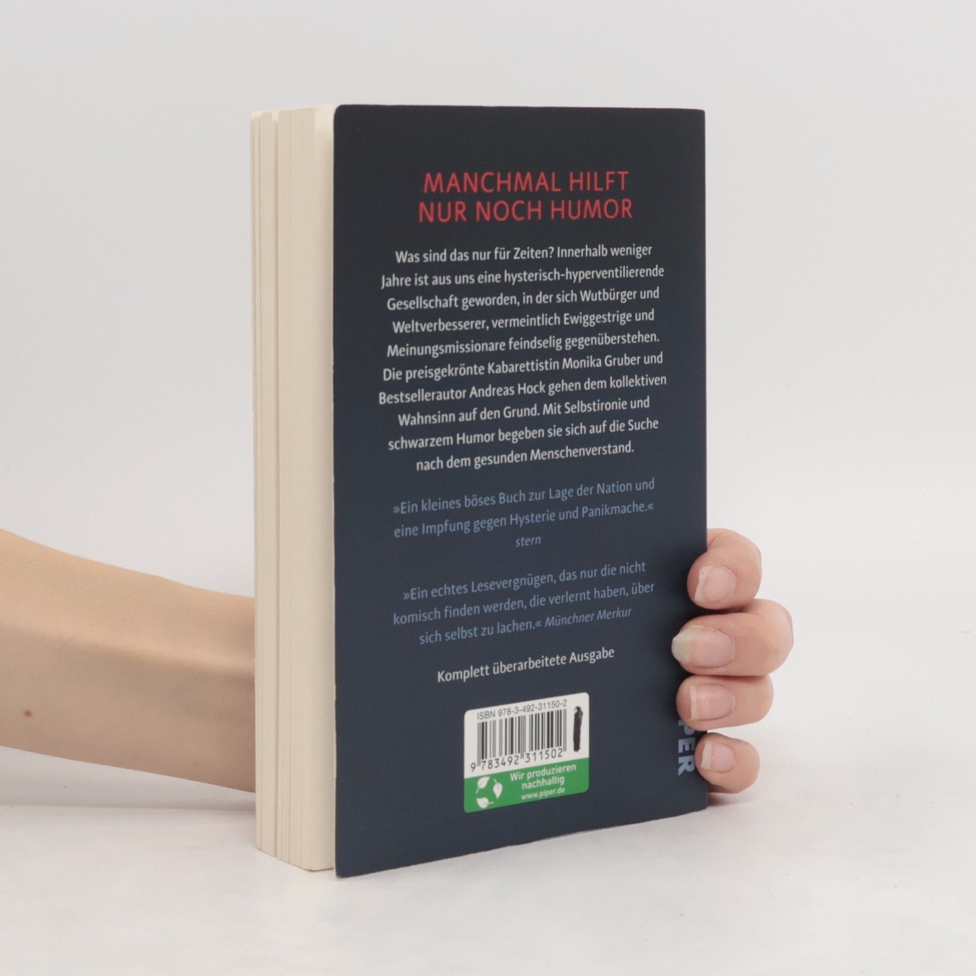 Manchmal hilft nur noch Humor Was sind das nur für Zeiten? Innerhalb weniger Jahre ist aus uns eine hysterisch-hyperventilierende Gesellschaft geworden, in der sich Wutbürger und Weltverbesserer, vermeintlich Ewiggestrige und Meinungsmissionare feindselig gegenüberstehen. Und die gegenwärtige Krise hat keineswegs zur Verbesserung des Miteinanders geführt, sie hat die Blödheit einiger eher noch verschlimmert. Die preisgekrönte Kabarettistin Monika Gruber und Bestsellerautor Andreas Hock gehen dem kollektiven Wahnsinn auf den Grund – und stellen fest, dass er seine Ursache vor allem in der Ignoranz und im Egoismus einiger Weniger hat. »Ein kleines böses Buch zur Lage der Nation und eine Impfung gegen Hysterie und Panikmache.« stern Mit Selbstironie und schwarzem Humor begeben sie sich auf die Suche nach dem gesunden Menschenverstand und gehen dorthin, wo es wirklich wehtut – eine unterhaltsame Reise durch die Gegenwart, die beweist: Lachen hilft!