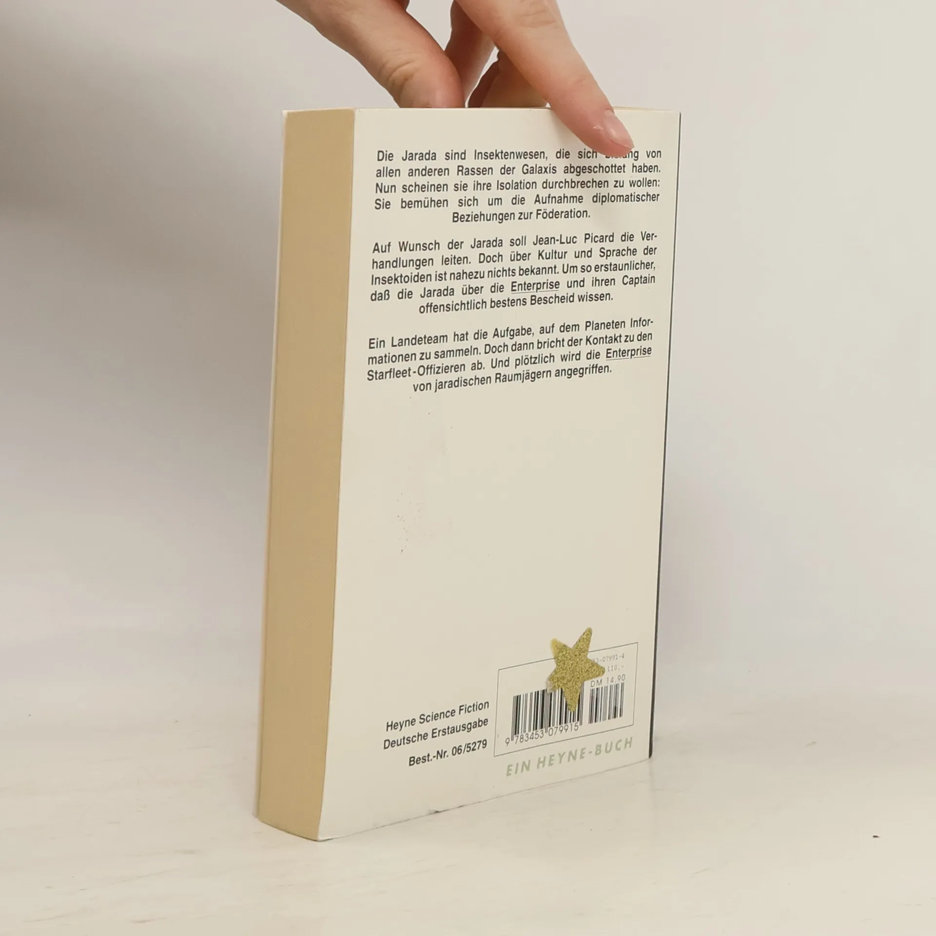 In der Falle! Die Jarada sind Insektenwesen, die sich bislang von allen anderen Völkern der Galaxis abgeschottet haben. Nun wollen sie ihre Isolation offenbar durchbrechen, denn sie bemühen sich um Aufnahme von Beziehungen zur Föderation. Auf Wunsch der Jarada soll Captain Picard die Verhandlungen leiten. Doch über Kultur und Sprache der Insektoiden ist nahezu nichts bekannt. Umso erstaunlicher, dass die Jarada offensichtlich über die Enterprise und ihren Captain bestens Bescheid wissen. Ein Landeteam hat die Aufgabe, auf dem Planeten Informationen zu sammeln. Doch dann bricht der Kontakt zu den Offizieren ab, und die Enterprise wird von jaradischen Raumjägern angegriffen...
