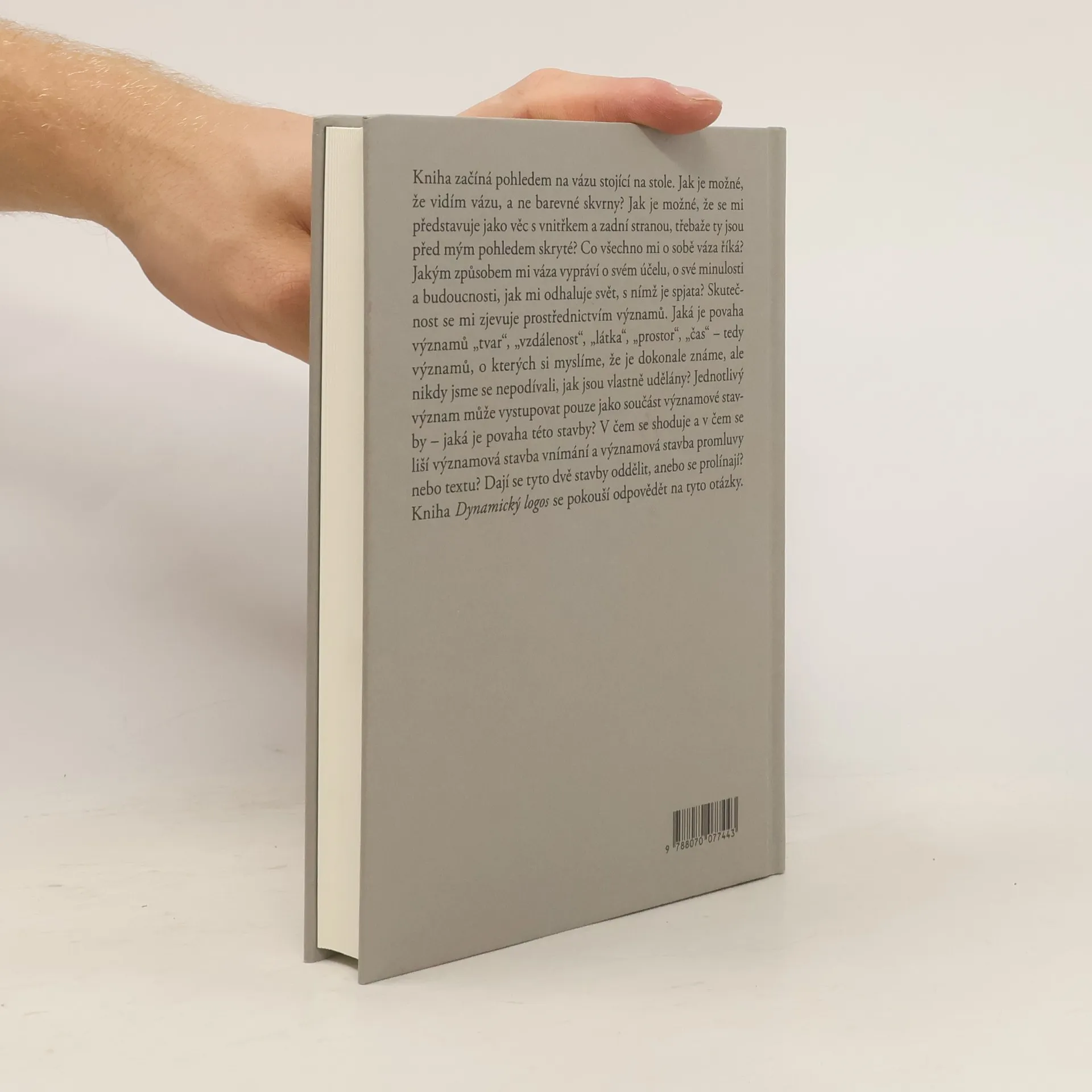 Kniha začíná pohledem na vázu stojící na stole. Jak je možné, že vidím vázu, a ne barevné skvrny? Jak je možné, že se mi představuje jako věc s vnitřkem a zadní stranou, třebaže ty jsou před mým pohledem skryté? Co všechno mi o sobě váza říká? Jakým způsobem mi váza vypráví o svém účelu, o své minulosti a budoucnosti, jak mi odhaluje svět, s nímž je spjata? Skutečnost se mi zjevuje prostřednictvím významů. Jaká je povaha významů „tvar“, „vzdálenost“, „látka“, „prostor“, „čas“ – tedy významů, o kterých si myslíme, že je dokonale známe, ale nikdy jsme se nepodívali, jak jsou vlastně udělány? Jednotlivý význam může vystupovat pouze jako součást významové stavby – jaká je povaha této stavby? V čem se shoduje a v čem se liší významová stavba vnímání a významová stavba promluvy nebo textu? Dají se tyto dvě stavby oddělit, anebo se prolínají? Kniha Dynamický logos se pokouší odpovědět na tyto otázky.