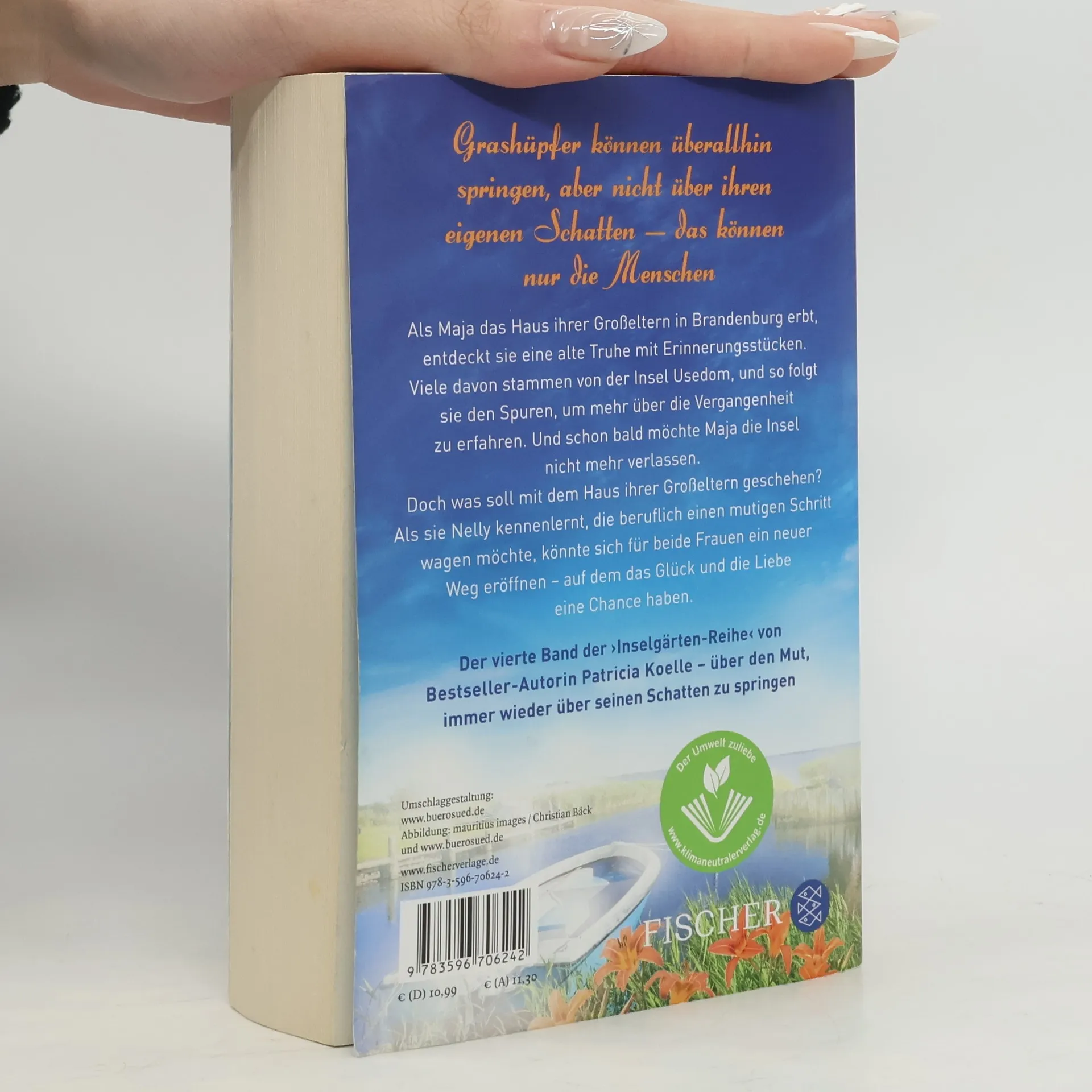 Grashüpfer können überallhin springen, aber nicht über ihren eigenen Schatten – das können nur die Menschen Als Maja das Haus ihrer Großeltern in Brandenburg erbt, entdeckt sie eine alte Truhe mit Erinnerungsstücken. Viele davon stammen von der Insel Usedom, und so folgt sie den Spuren, um mehr über die Vergangenheit zu erfahren. Und schon bald möchte Maja die Insel nicht mehr verlassen. Doch was soll mit dem Haus ihrer Großeltern geschehen? Als sie Nelly kennenlernt, die beruflich einen mutigen Schritt wagen möchte, könnte sich für beide Frauen ein neuer Weg eröffnen – auf dem das Glück und die Liebe eine Chance haben. Der vierte Band der ›Inselgärten-Reihe‹ von Bestseller-Autorin Patricia Koelle – über den Mut, immer wieder über seinen Schatten zu springen Dieses Buch ist ein in sich geschlossener Roman, den man eigenständig lesen kann.