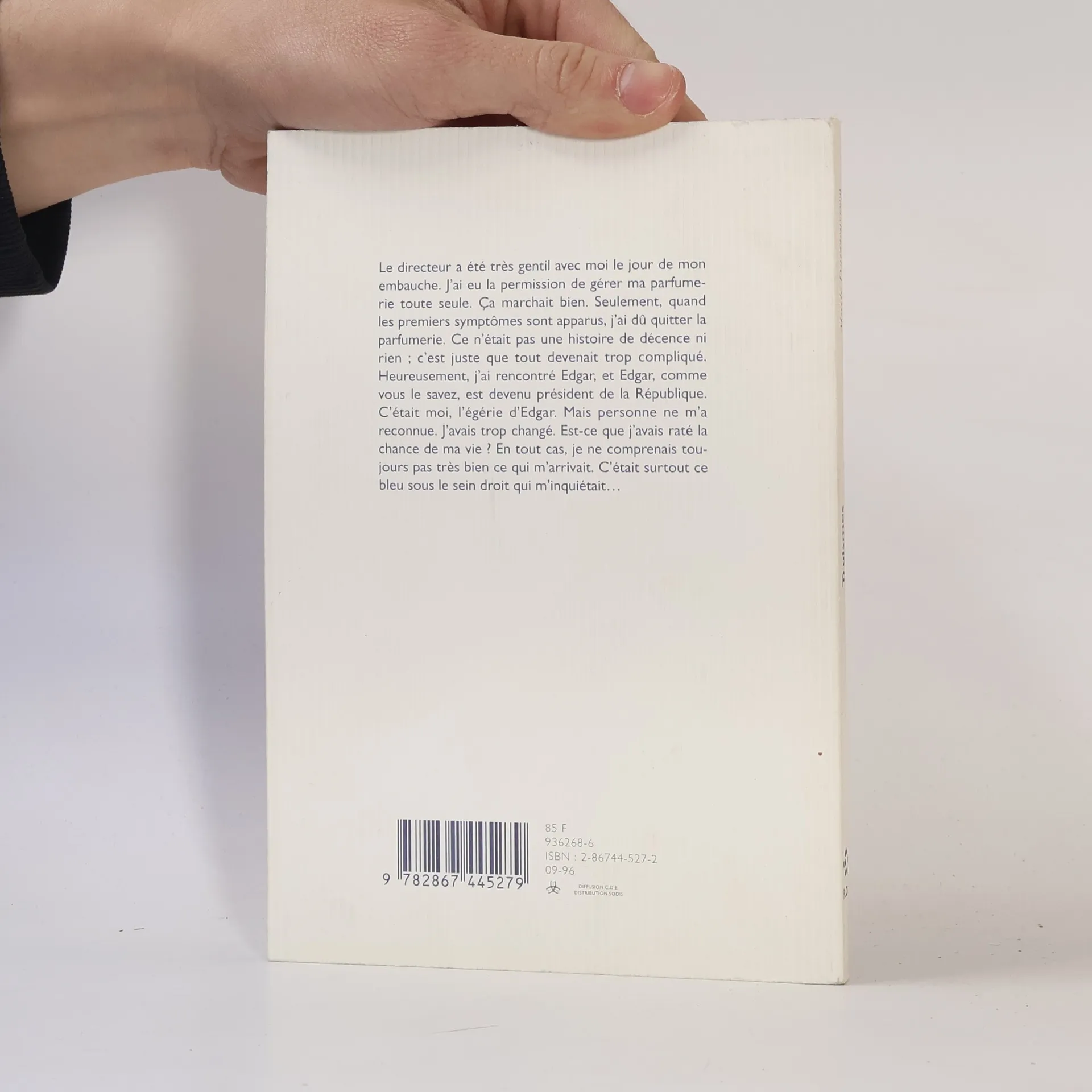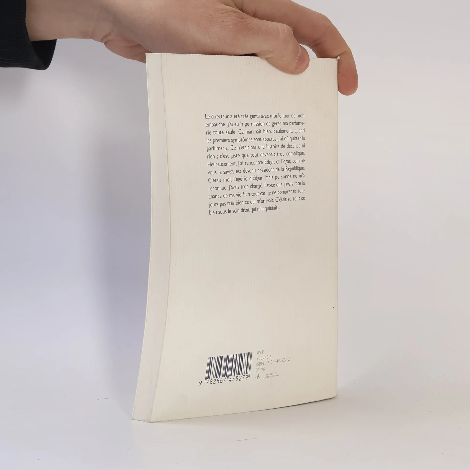 Le directeur a été très gentil avec moi le jour de mon embauche. J'ai eu la permission de gérer ma parfumerie toute seule. Ca marchait bien. Seulement, quand les premiers symptômes sont apparus, j'ai dû quitter la parfumerie. Ce n'était pas une histoire de décence ni rien ; c'est juste que tout devenait trop compliqué. Heureusement, j'ai rencontré Edgar, et Edgar, comme vous le savez, est devenu président de la République. C'était moi, l'érégie d'Edgar. Mais personne ne m'a reconnue. J'avais trop changé. Est-ce que j'avais raté la chance de ma vie ? En tout cas, je ne comprenais toujours pas très bien ce qui m'arrivait. C'était surtout ce bleu sous le sein droit qui m'inquiétait ...