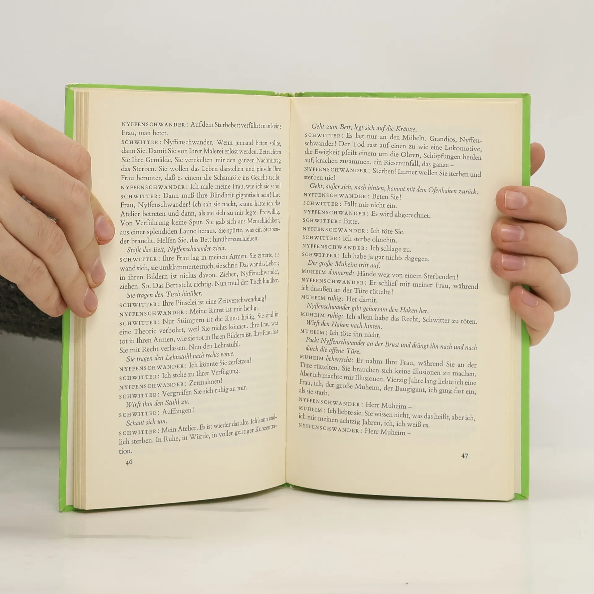 Der Meteor: »Der mit dem Nobelpreisträger ausgezeichnete Dramatiker Wolfgang Schwitter ist in der Klinik gestorben, aber vom Tode auferstanden und in das Maler-Atelier geflüchtet, das er vor vierzig Jahren bewohnt hat, um hier zu sterben. Schwitter will sterben, stirbt aber nicht, und nicht sterben wollen die Menschen, die ihn im Atelier besuchen, aber sie sterben oder werden zumindest ruiniert.«