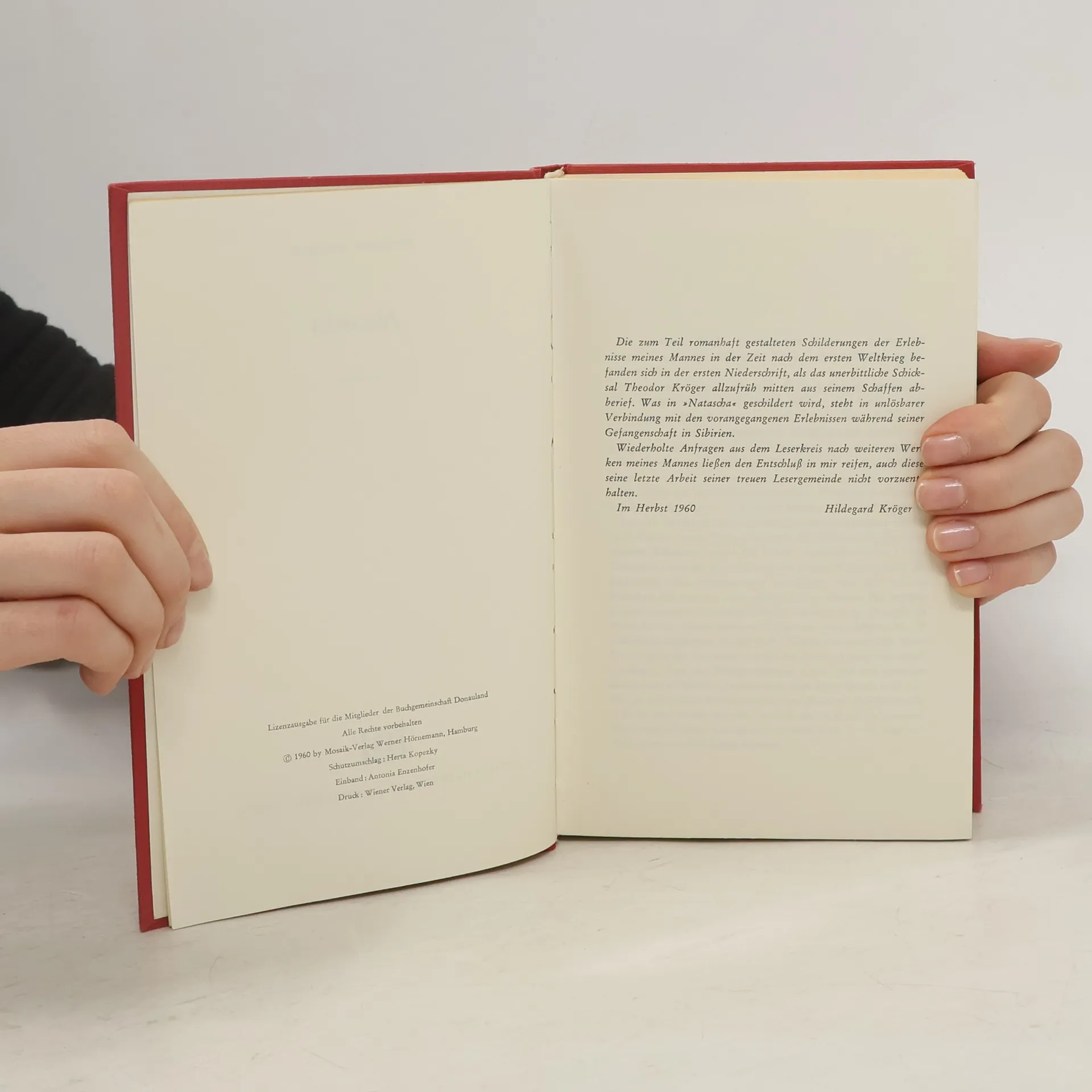 »Die zum Teil romanhaft gestalteten Schilderungen der Erlebnisse meines Mannes in der Zeit nach dem ersten Weltkriege befanden sich in der ersten Niederschrift, als das unerbittliche Schicksal Theodor Kröger allzufrüh mitten aus seinem Schaffen abberief. Was in ›Natascha‹ geschildert wird, steht in unlösbarer Verbindung mit den vorangegangenen Erlebnissen während seiner Gefangenschaft in Sibirien. Wiederholte Anfragen aus dem Leserkreis nach weiteren Werken meines Mannes ließen den Entschluß in mir reifen, auch diese seine letzte Arbeit seiner treuen Lesergemeinde nicht vorzuenthalten.« Im Herbst 1960 | Hildegard Kröger