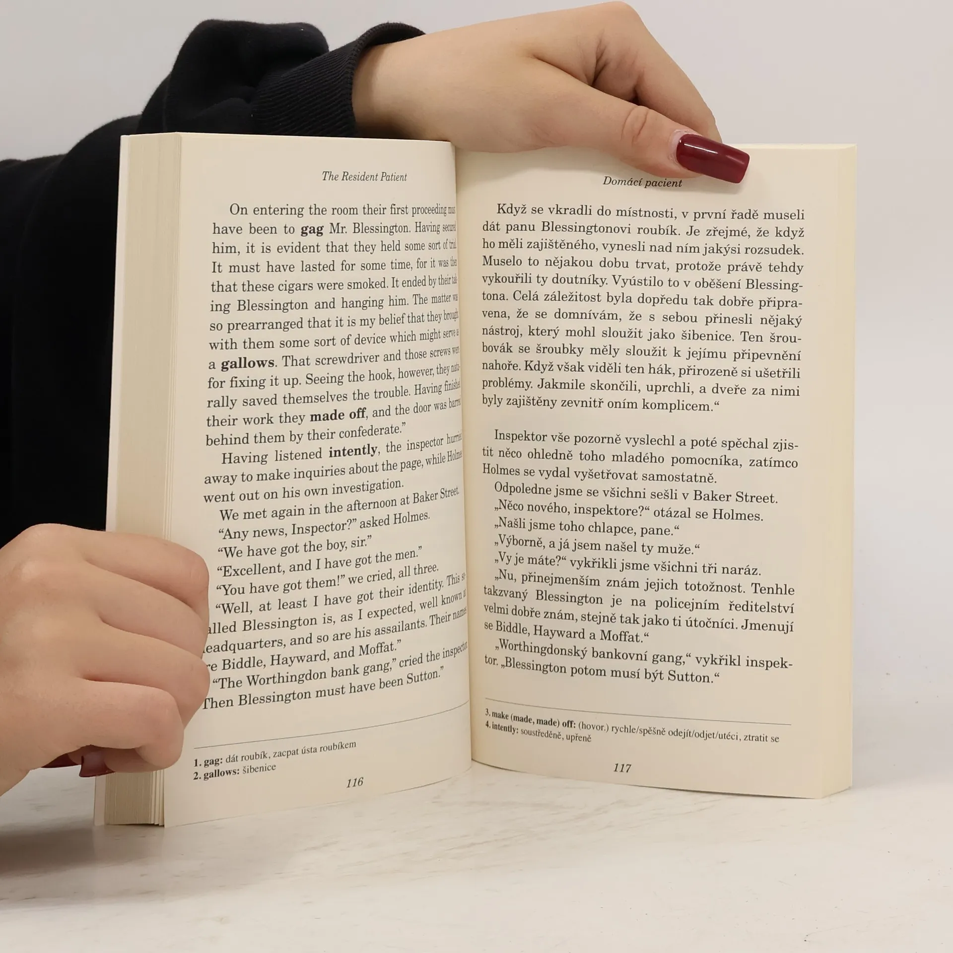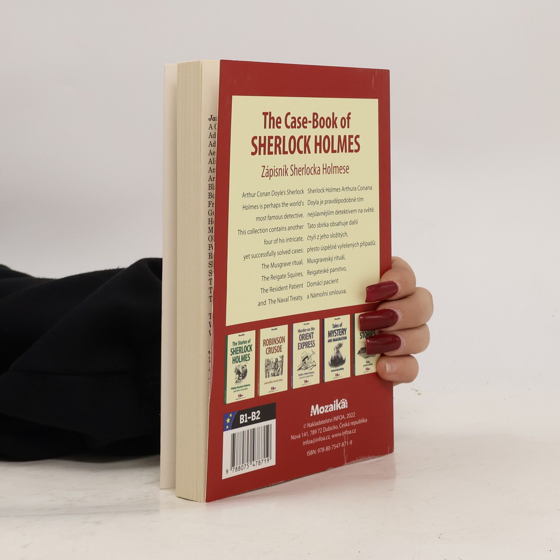 Souběžný český text. Arthur Conan Doyle's Sherlock Holmes is perhaps the world's most famous detective. This collection contains another four of his intricate, yet successfully solved cases: The Musgrave ritual, The Reigate Squires, The Resident Patient and The Naval Treaty. Sherlock Holmes Arthura Conana Doyla je pravděpodobně tím nejslavnějším detektivem na světě. Tato sbírka obsahuje další čtyři z jeho složitých, přesto úspěšně vyřešených případů: Musgraveský rituál, Reigateské panstvo, Domácí pacient a Námořní smlouva.