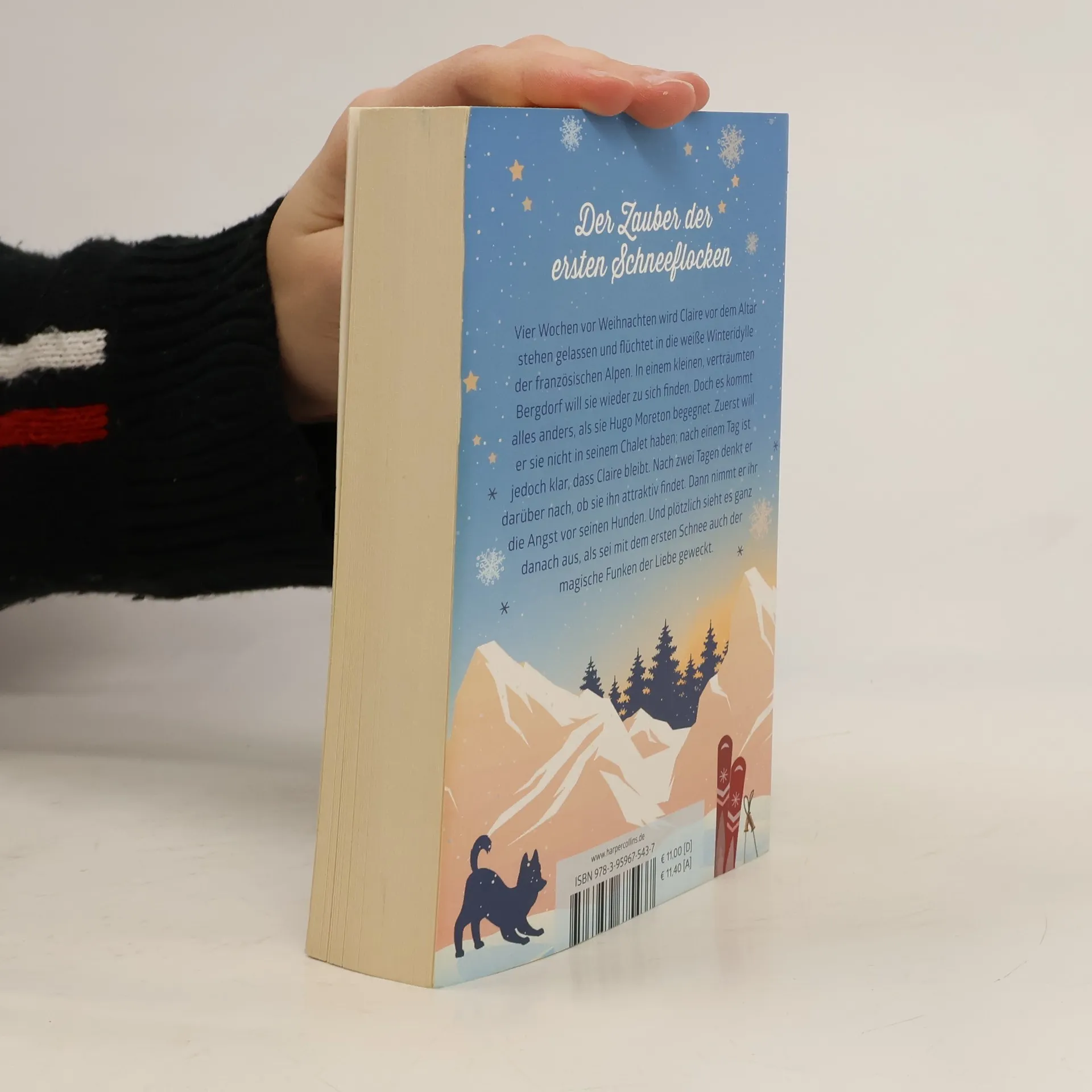 Der Zauber der ersten Schneeflocken Vier Wochen vor Weihnachten wird Claire vor dem Altar stehen gelassen und flüchtet in die weiße Winteridylle der französischen Alpen. In einem kleinen verträumten Bergdorf will sie wieder zu sich finden. Doch es kommt alles anders, als sie Hugo Moreton begegnet. Zuerst will er sie nicht in seinem Chalet haben; nach einem Tag ist jedoch klar, dass Claire bleibt. Nach zwei Tagen denkt er darüber nach, ob sie ihn attraktiv findet. Dann nimmt er ihr die Angst vor seinen Hunden. Und plötzlich sieht es ganz danach aus, als sei mit dem ersten Schnee auch der magische Funken der Liebe geweckt. »Tiefe Emotionen, amüsante Dialoge und das alles in den traumhaft schönen französischen Alpen.«