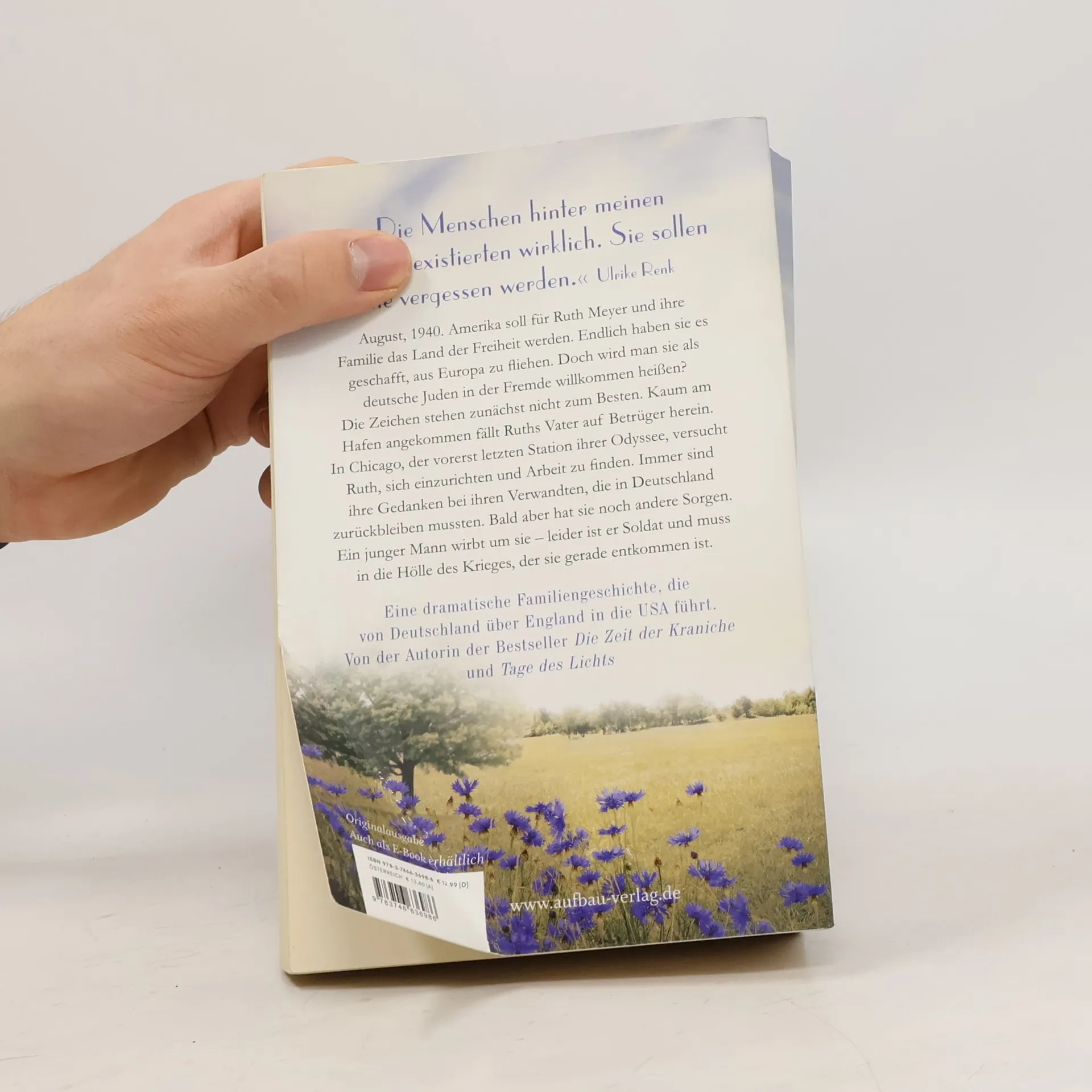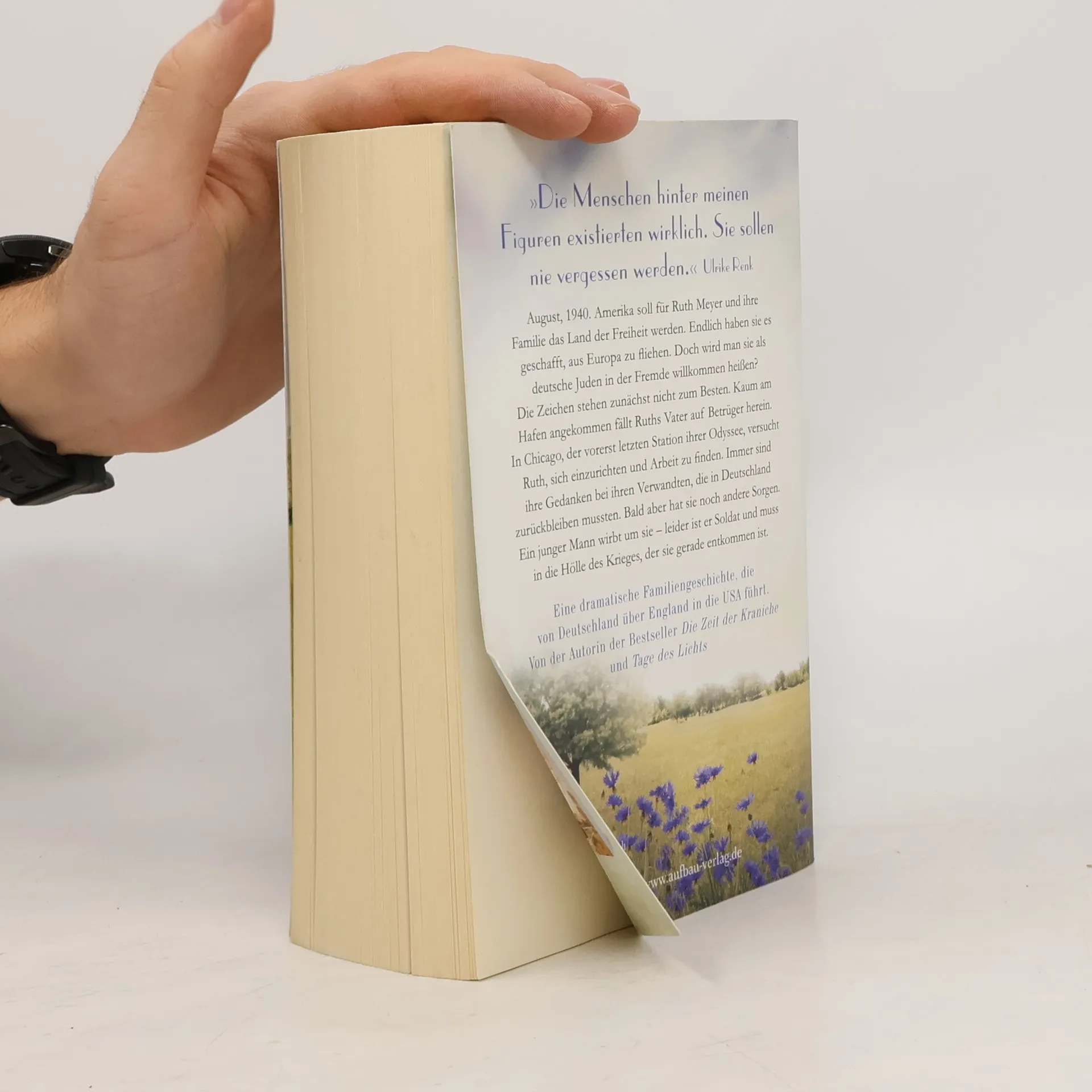 „Die Menschen hinter meinen Figuren existierten wirklich. Sie sollen nie vergessen werden.“ Ulrike Renk . August, 1940. Amerika soll für Ruth Meyer und ihre Familie das Land der Freiheit werden. Endlich haben sie es geschafft, aus Europa zu fliehen. Doch wird man sie als deutsche Juden in der Fremde willkommen heißen? Die Zeichen stehen zunächst nicht zum Besten. Kaum am Hafen angekommen fällt Ruths Vater auf Betrüger herein. In Chicago, der vorerst letzten Station ihrer Odyssee, versucht Ruth sich einzurichten und Arbeit zu finden. Immer sind ihre Gedanken bei ihren Verwandten, die in Deutschland zurückbleiben mussten. Bald aber hat sie noch andere Sorgen. Ein junger Mann wirbt um sie – leider ist er Soldat und muss in die Hölle des Krieges, der sie gerade entkommen ist. Eine dramatische Familiengeschichte, die von Deutschland über England in die USA führt. Von der Autorin der Bestseller „Die Zeit der Kraniche“ und „Tage des Lichts“.