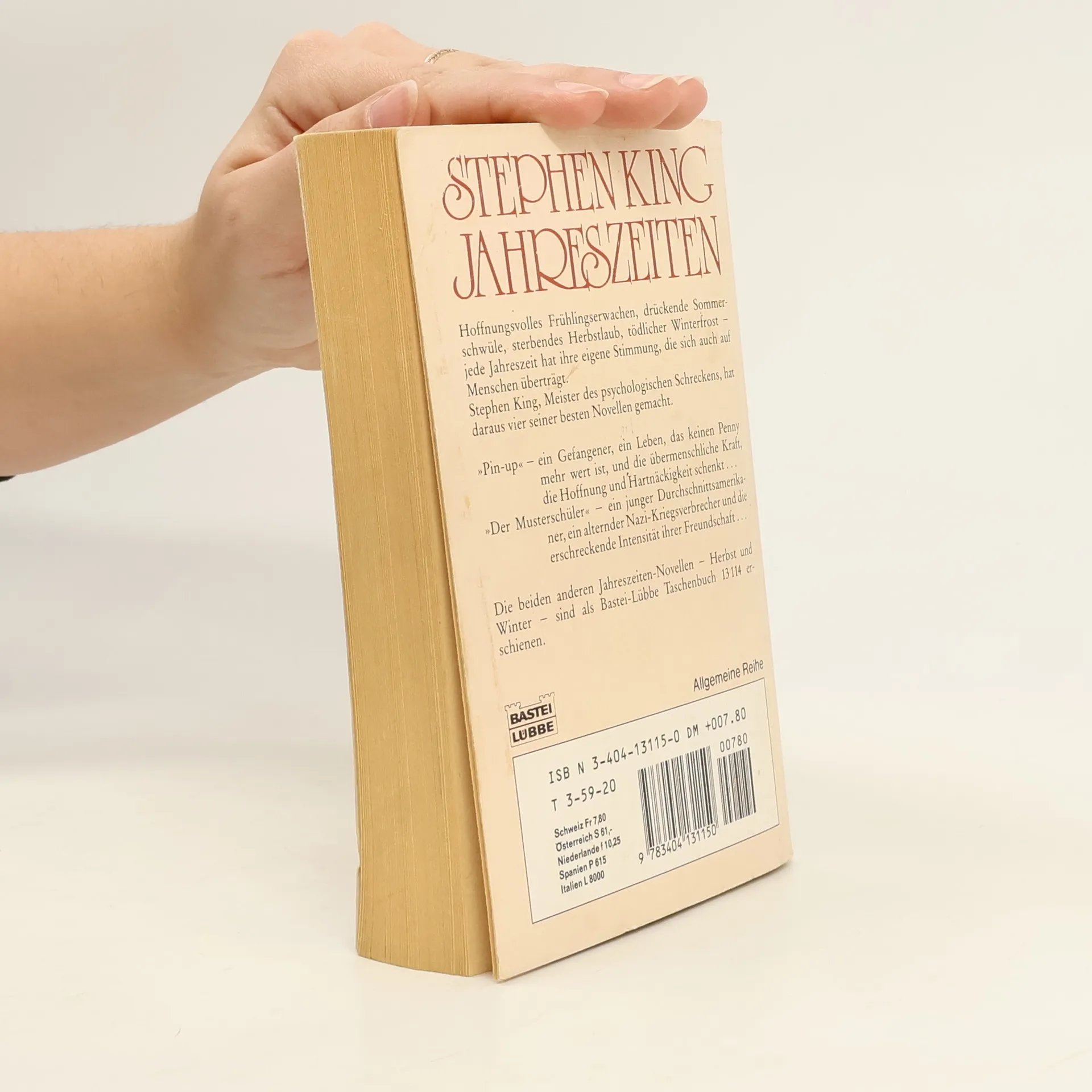 Hoffnungsvolles Frühlingserwachen, drückende Sommerschwüle, sterbendes Herbstlaub, tödlicher Winterfrost - jede Jahreszeit hat ihre eigene Stimmung, die sich auch auf Menschen überträgt. Stephen King, Meister des psychologischen Schreckens, hat daraus vier seiner besten Novellen gemacht. >Pin-up< - ein Gefangener, ein Leben, das keinen Penny mehr wert ist, und die übermenschliche Kraft, die Hoffnung und Hartnäckigkeit schenkt ... >Der Musterschüler< - ein junger Durchschnittsamerikaner, ein alternder Nazi-Kriegsverbrecher und die erschreckende Intensität ihrer Freundschaft ...
