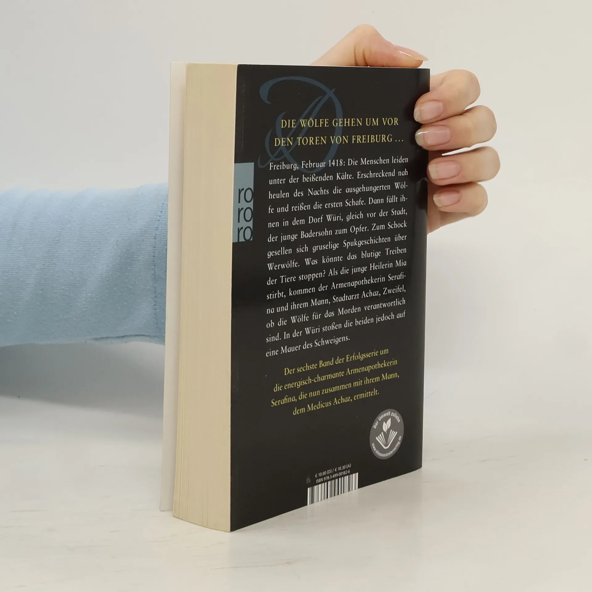 Die Erfolgsserie um die Armenapthekerin Serafina aus Freiburg geht weiter. Februar 1418: Die Menschen leiden unter der beißenden Kälte. Erschreckend nah heulen des Nachts die ausgehungerten Wölfe und reißen die ersten Schafe. Dann fällt ihnen in dem Dörfchen Würi, gleich vor der Stadt, der junge Badersohn Jörgelin zum Opfer. Zum Schock gesellen sich Spukgeschichten über Werwölfe. Man hängt zur Abschreckung sogar einen Wolf an den Galgen. Das Töten geht weiter. Als die junge Heilerin Mia stirbt, kommen der Armenapothekerin Serafina und ihrem Mann, Stadtarzt Achaz, Zweifel, ob die Tiere für das Morden verantwortlich sind oder wer anders sein Unwesen treibt. Das erste Mal ermitteln sie als Ehepaar gemeinsam. In der Würi stoßen die beiden jedoch auf eine Mauer des Schweigens, der sie mit Spürsinn, Wissen und Hartnäckigkeit begegnen.