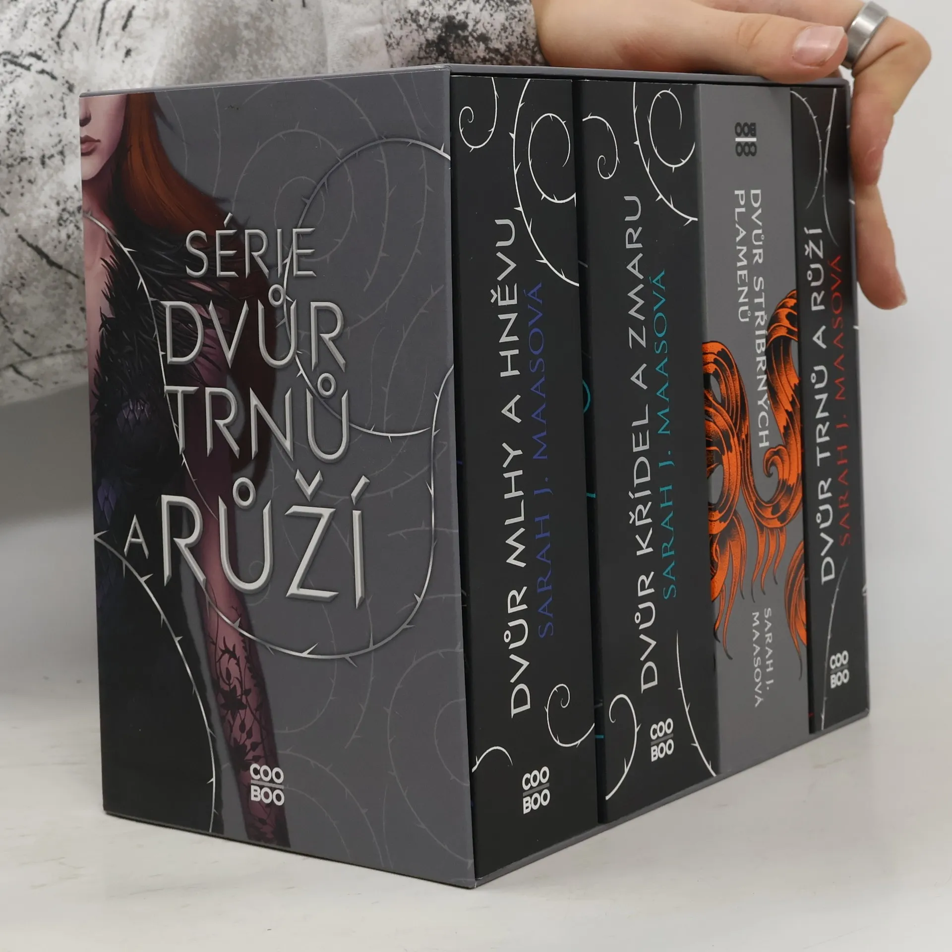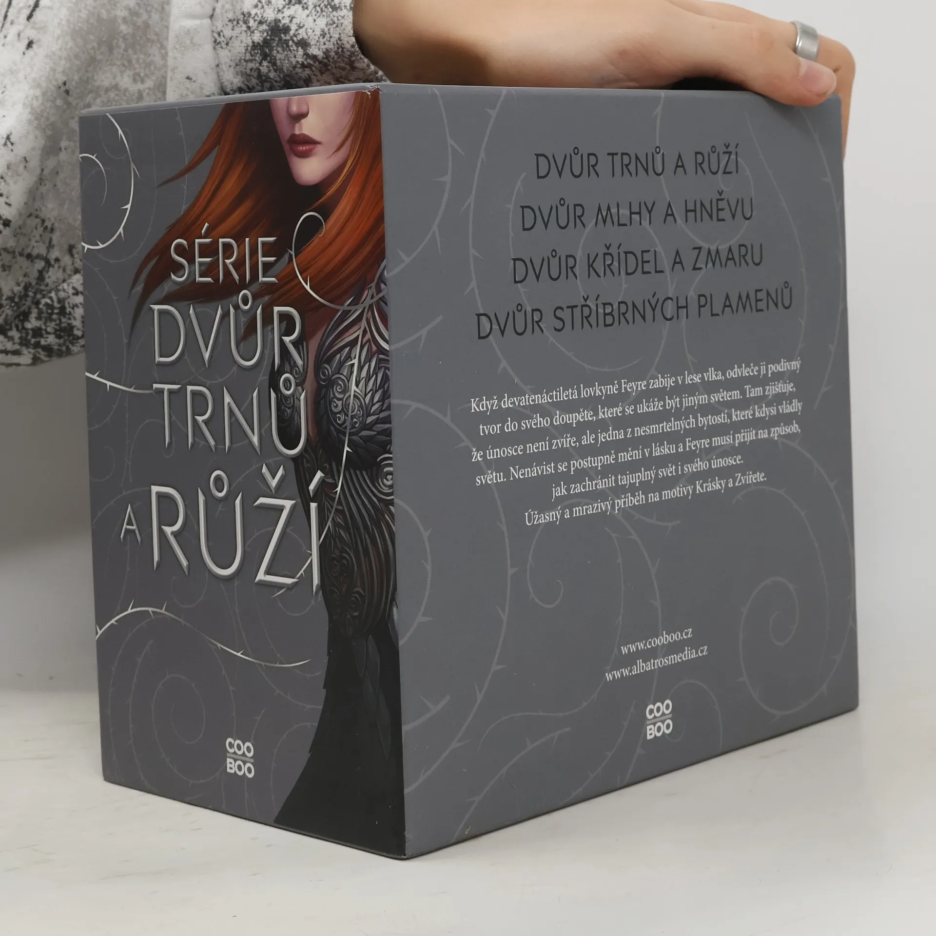 Série Dvůr trnů a růží v jednom boxu.Když devatenáctiletá lovkyně Feyre zabije v lese vlka, odvleče ji podivný tvor do svého doupěte, které se ukáže být jiným světem. Tam zjišťuje, že únosce není zvíře, ale jedna z nesmrtelných bytostí, které kdysi vládly světu. Nenávist se postupně mění v lásku a Feyre musí přijít na způsob, jak zachránit tajuplný svět i svého únosce. Úžasný a mrazivý příběh na motivy Krásky a Zvířete.