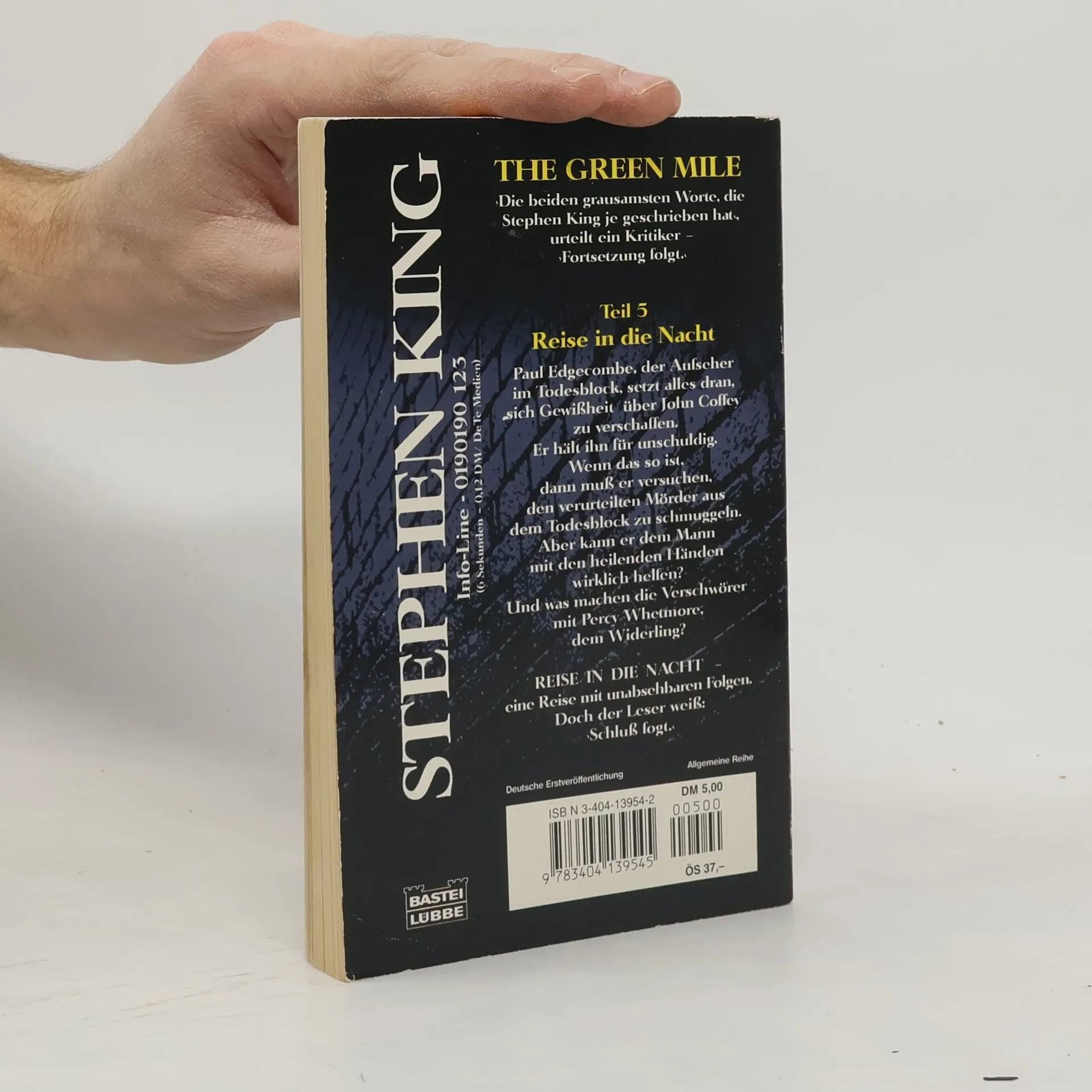 Paul Edgecombe, der Aufseher im todesblock, setzt alles dran, sich Gewißheit über John Coffey zu verschaffen. Er hält ihn für unschuldig.....